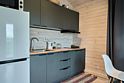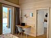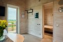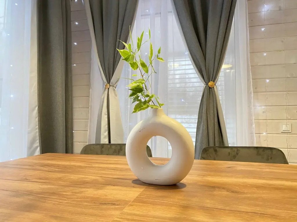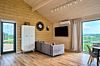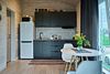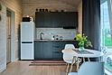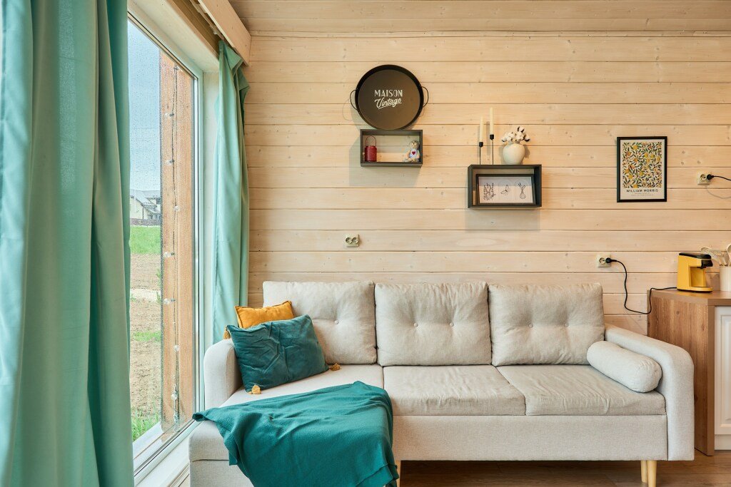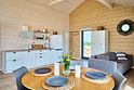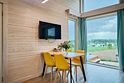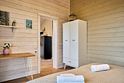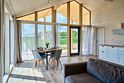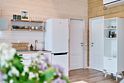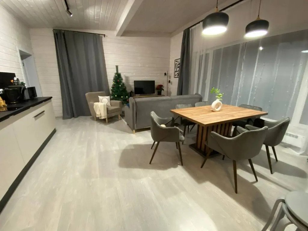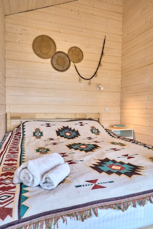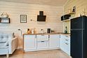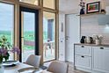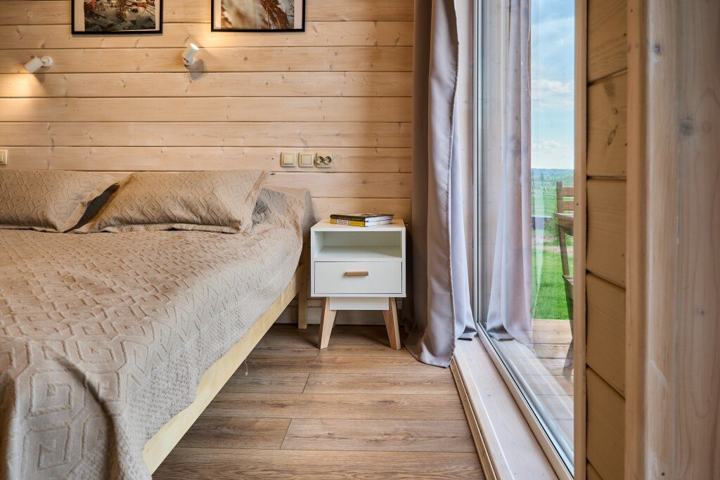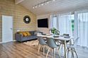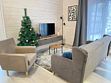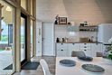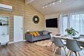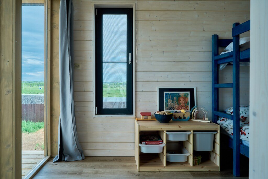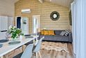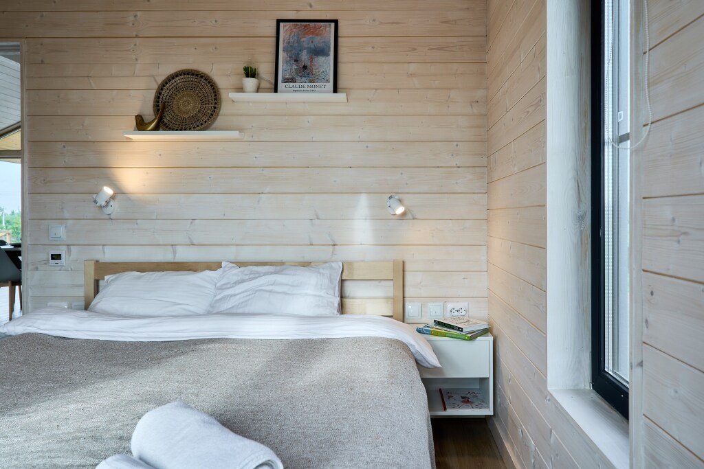 В доме две спальни. Гостиная в доме совмещена с кухней, отсюда открывается панорамный вид. В кухонной зоне имеются холодильник, микроволновая печь, чайник, набор посуды на 6 персон.