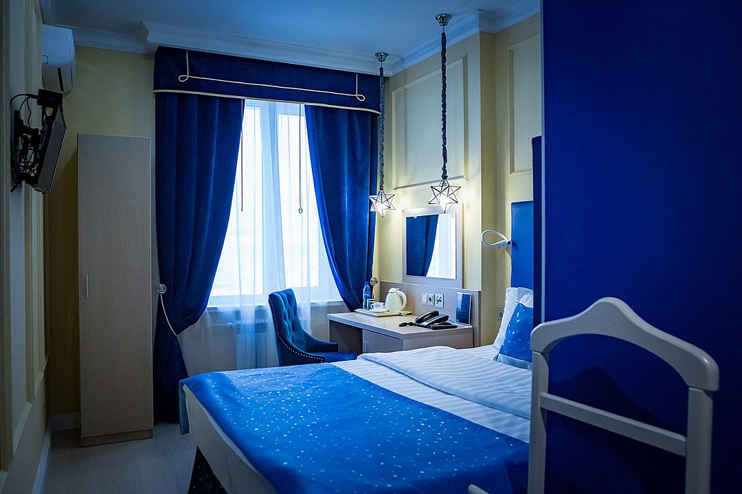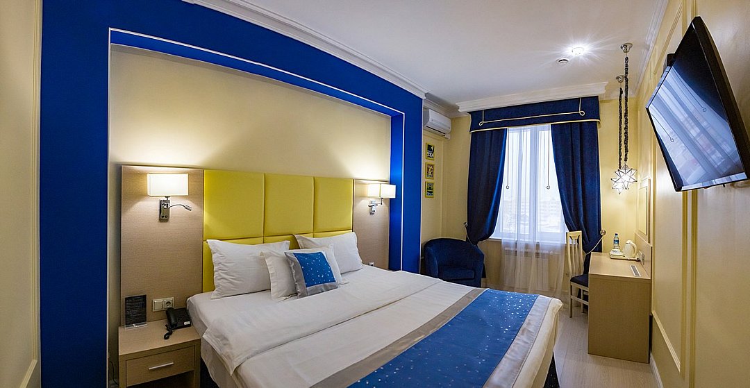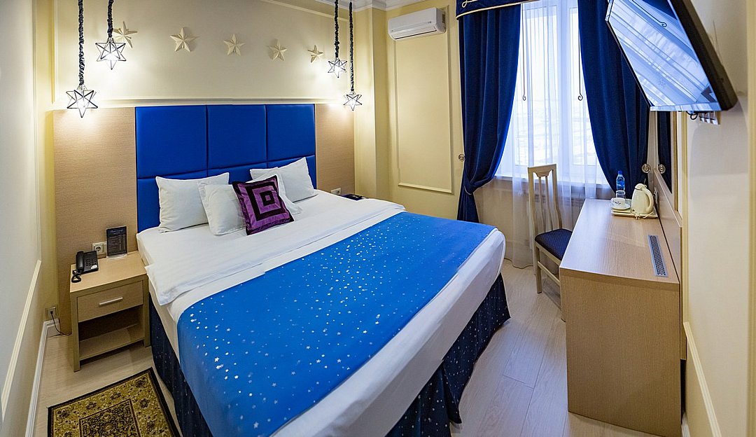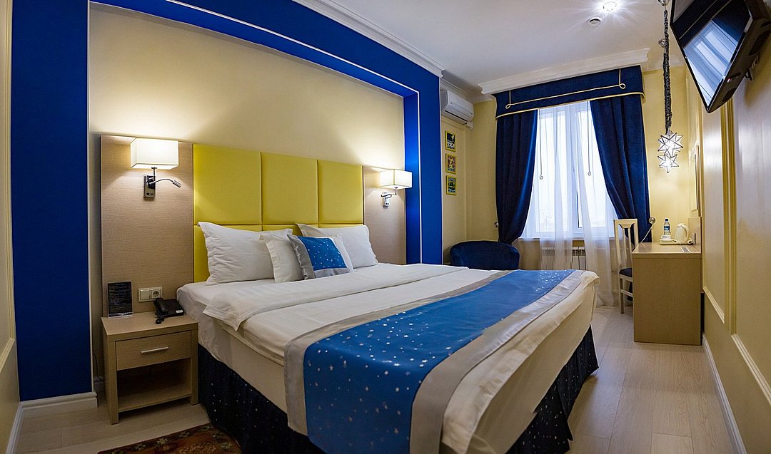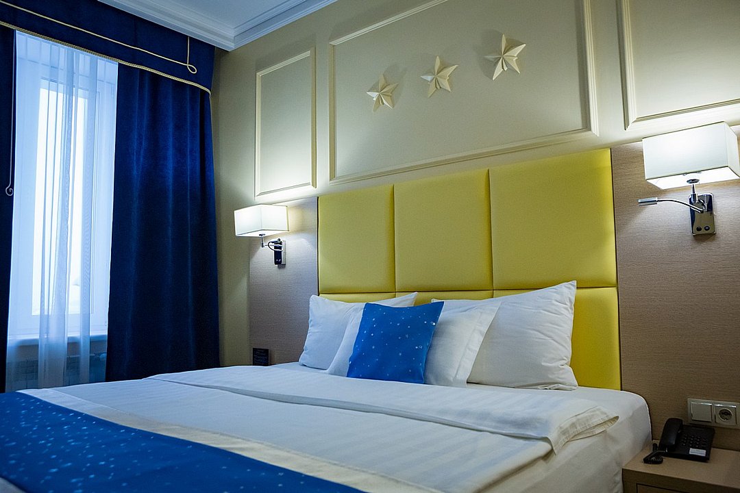 Уютный и комфортабельный двухместный номер площадью 26 м². В стоимость номера входит континентальный завтрак, который подается в удобное для Вас время. В номере расположена большая уютная двухспальная кровать размером 160×200 см с современным матрасом, уютным одеялом и антистрессовыми подушками. Также есть шкаф, прикроватные тумбочки, прикроватные светильники, туалетный столик с зеркалом, стул, багажница. В ванной комнате установлена ванна, предоставляются туалетные принадлежности, фен, тапочки, по запросу — халат. В номере работает приточно-вытяжная система с кондиционированием для вашего комфорта. Вы найдете достойное место в нашем "Созвездии"!Услуги и удобства