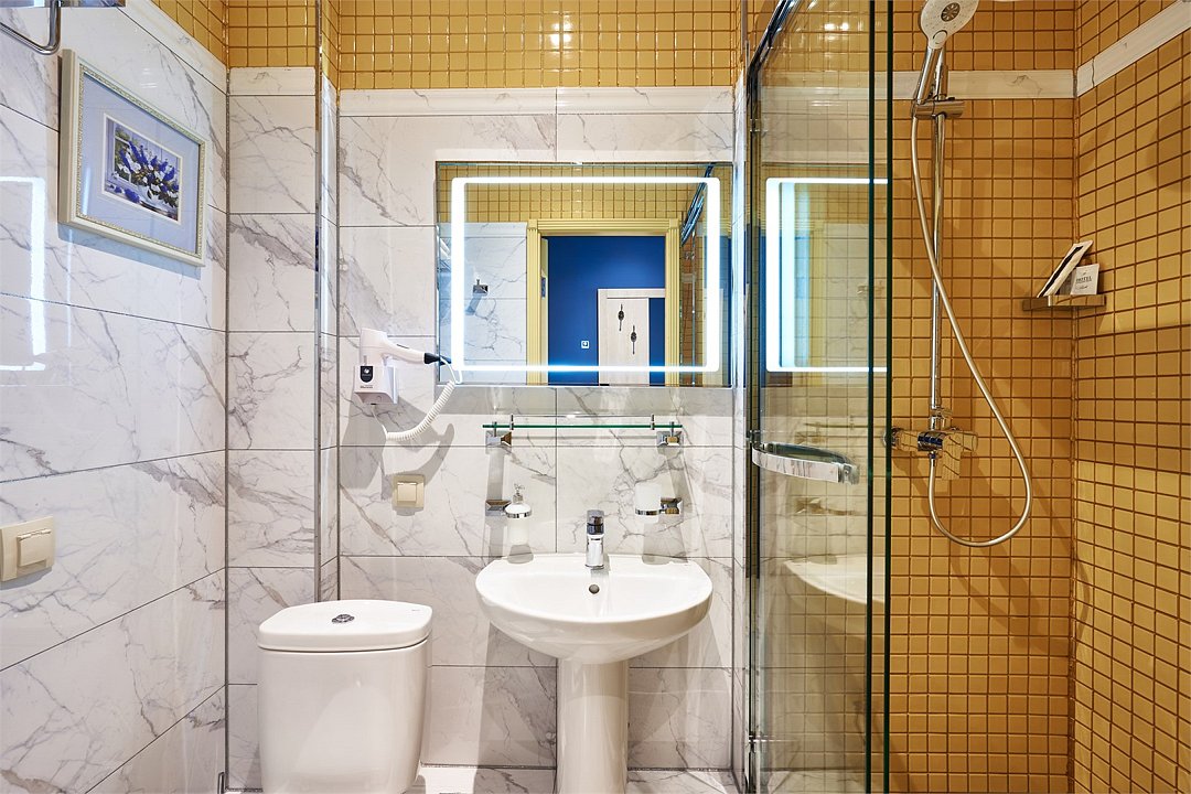 телевизор, кабельное телевидение, Wi-Fi, кондиционер, светильник, электронные замки, обогреватель, душевая кабина, санузел, банные принадлежности, банные полотенца, тапочки, косметические средства, двуспальная кровать, гладильная доска, тумбы, стулья, шкаф для одежды, вешалки, багажная тумба, зеркало, ковер, чайный набор, обслуживание номеров, чайник, унитаз, раковина, питьевая вода, гостиная зона, отопление, душ, кулер на этаже, кресло, вид во двор, стаканы, стол, туалетные средства, туалет, внутренний телефон, мини-холодильник, номер для некурящих, пуфик, холодильный шкаф, чайная станция, уборка номера, вешалки-плечики, бутилированная водаВ номере