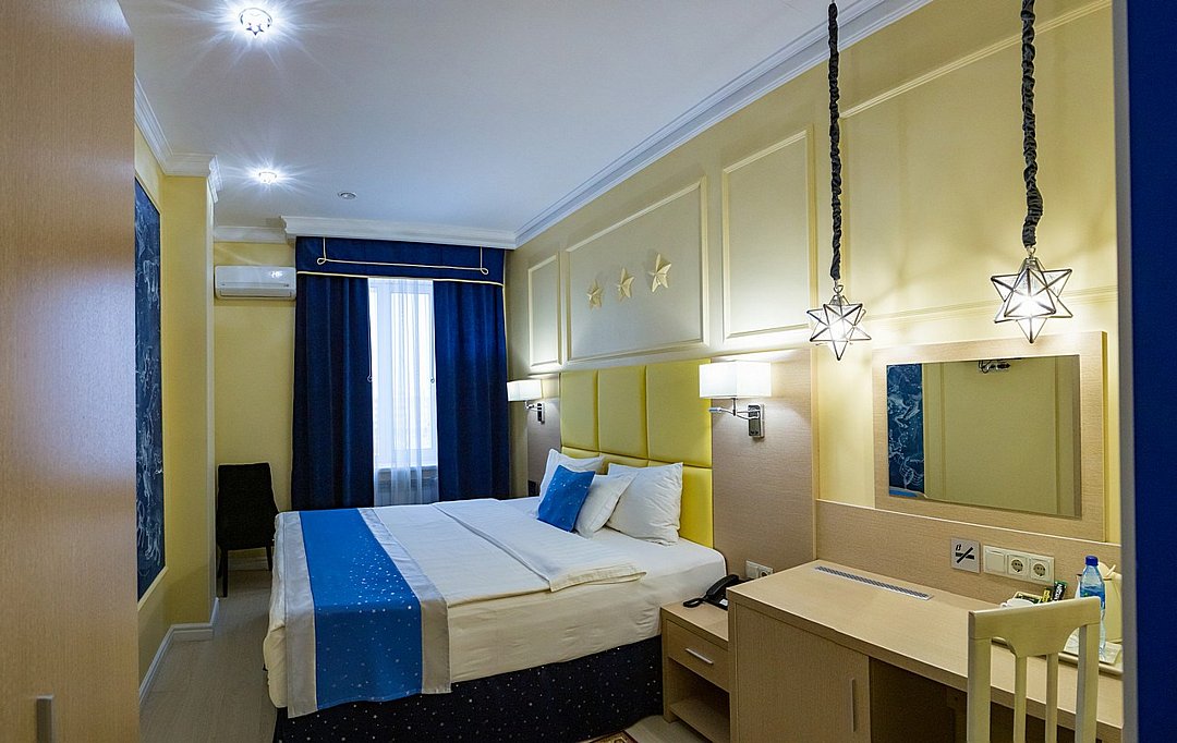 Большой двухместный номер площадью 21 м2. В стоимость входит континентальный завтрак, который подается в номер в удобное для Вас время. В номере удобная двуспальная кровать размером 160*200 с мягким матрасом, удобными антистресовыми подушками и теплым одеялом. Так же в номере имеется шкаф, прикроватные тумбы, туалетный столик с зеркалом, стул, мини-холодильник, багажница, кондиционер. В ванной комнате - душевая кабина, туалетные принадлежности, халат (по запросу), тапочки, фен, кондиционер. Так же работает приточно-вытяжная система с кондиционированием. Вас ждет достойное место в нашем "Созвездии"!Услуги и удобства