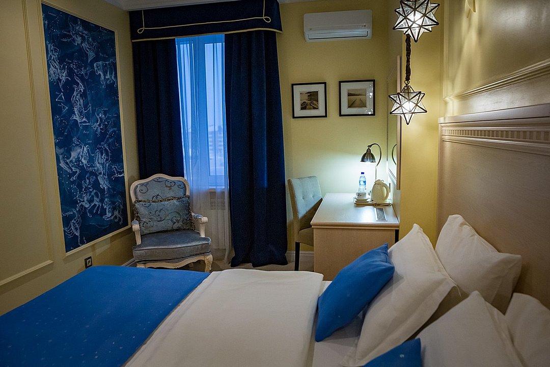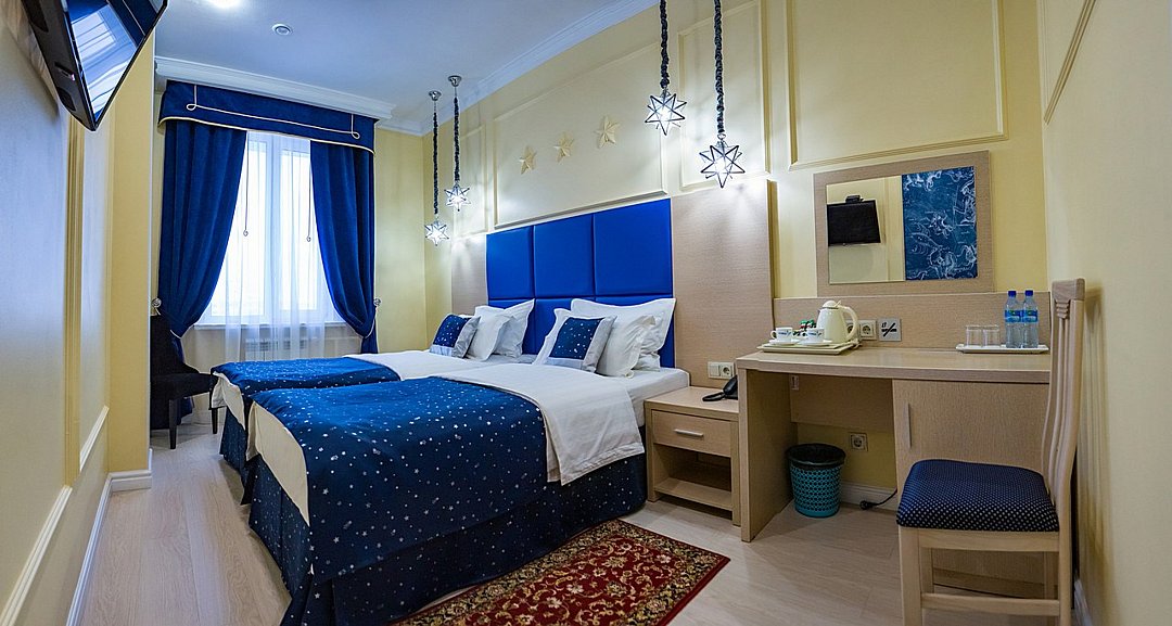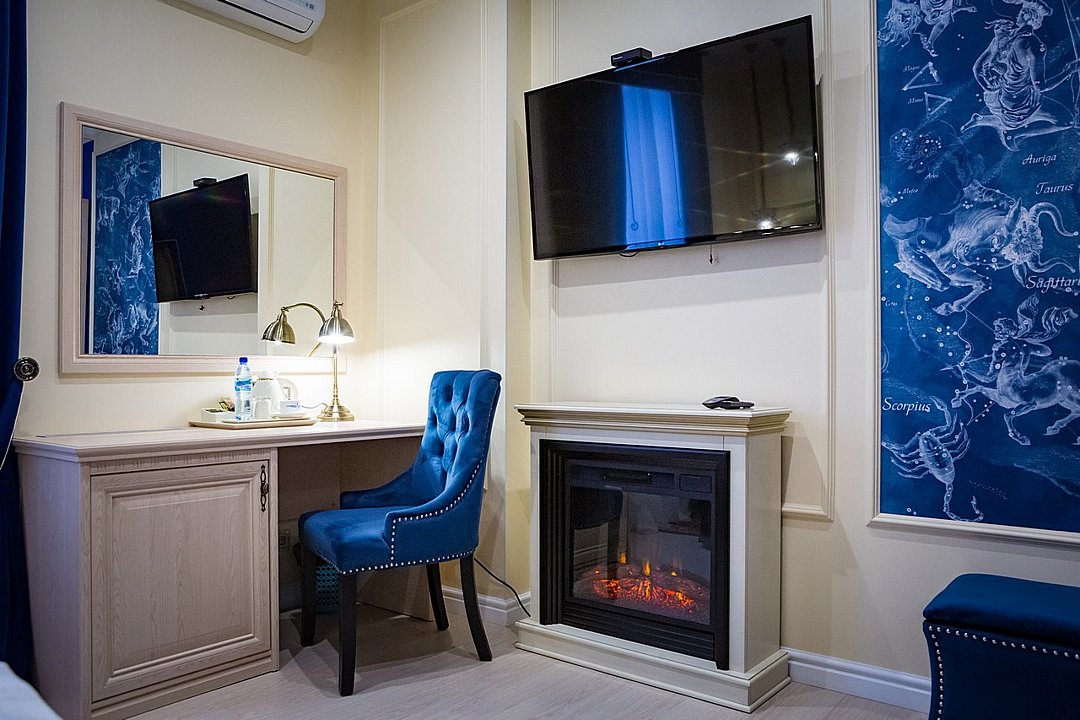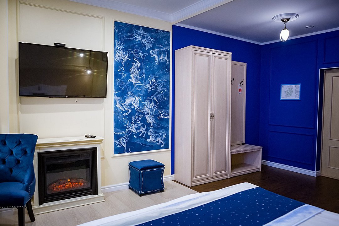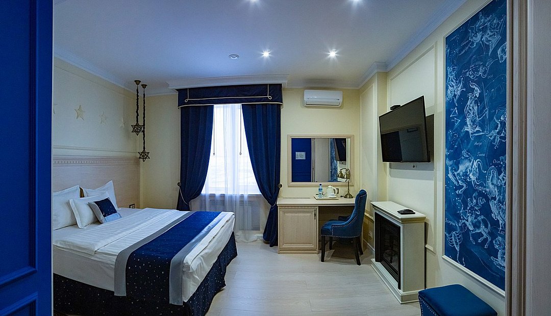 Уютный и комфортабельный двухместный номер площадью 26 м². В стоимость номера входит континентальный завтрак, который подается в удобное для Вас время. В номере расположена большая уютная двухспальная кровать размером 180×200 см с современным матрасом или две односпальные кровати по 90×200 см, оснащенные уютным одеялом и антистрессовыми подушками. Также есть шкаф, прикроватные тумбочки, прикроватные светильники, туалетный столик с зеркалом, стул, багажница и камин для создания теплой атмосферы. В ванной комнате установлена ванна, предоставляются туалетные принадлежности, тапочки, по запросу — халат и фен. В номере работает приточно-вытяжная система с кондиционированием для вашего комфорта. Вы найдете достойное место в нашем "Созвездии"!Услуги и удобства