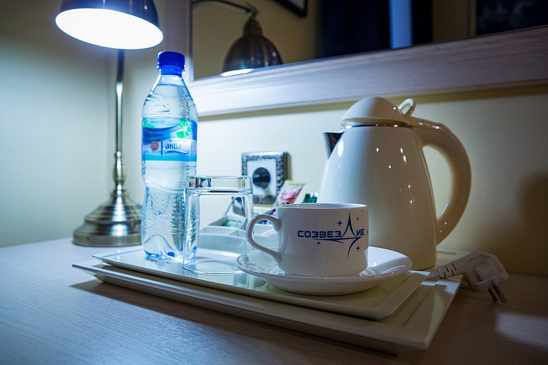 • Бутилированная вода, чайник, чай, кофе и сахар в номере;
