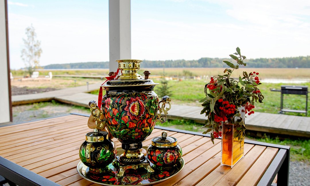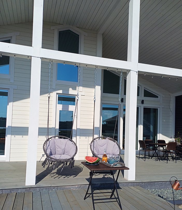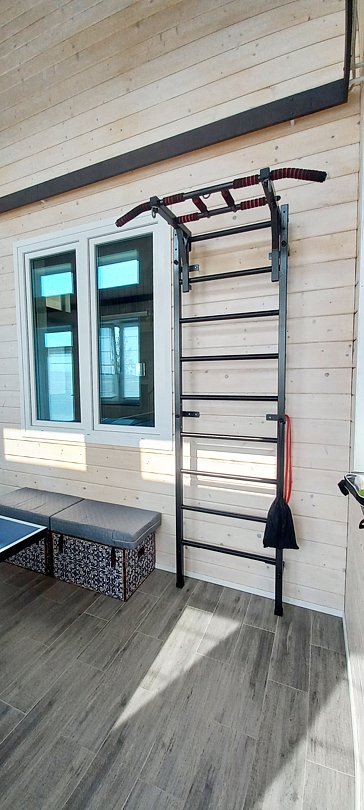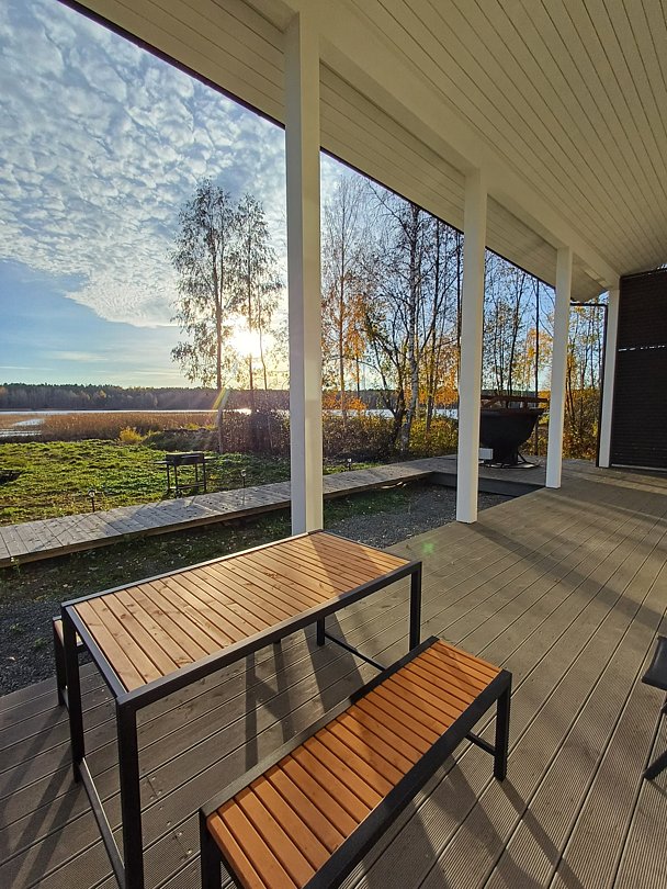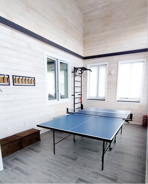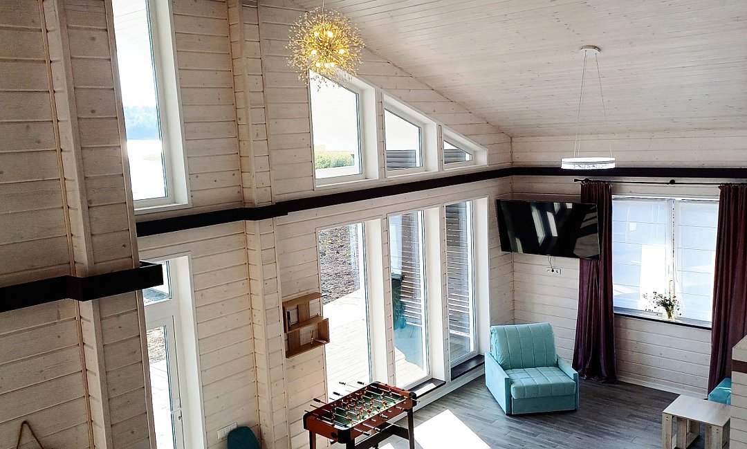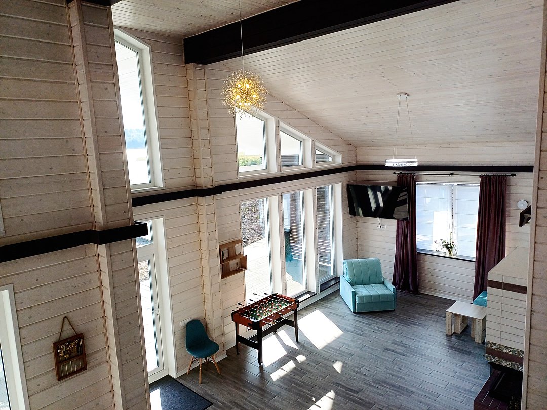 Высота потолков составляет шесть метров. К гостиной примыкает теплая веранда для занятий спортом, где размещены турник, большой теннисный стол и коврик для йоги. Открытая терраса площадью сорок пять квадратных метров с садовой мебелью предлагает прекрасный вид на озеро. Также здесь имеется сибирский чан.