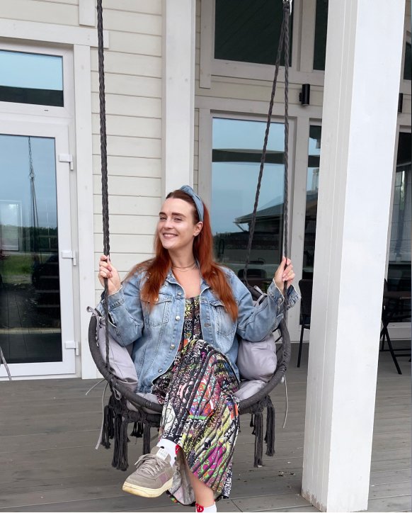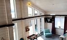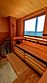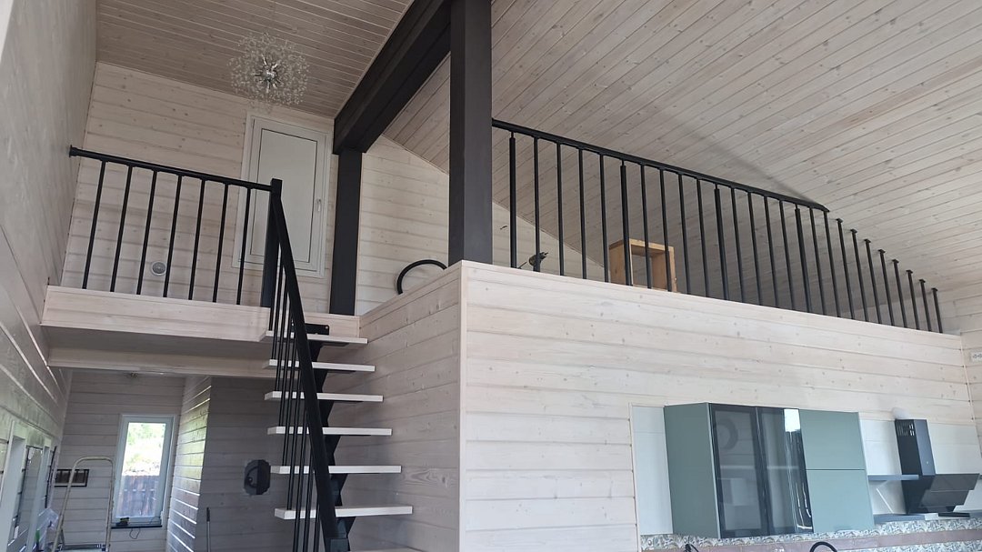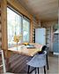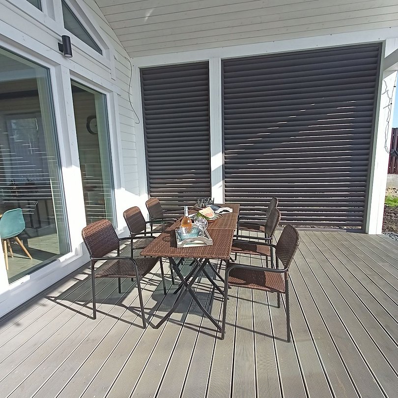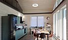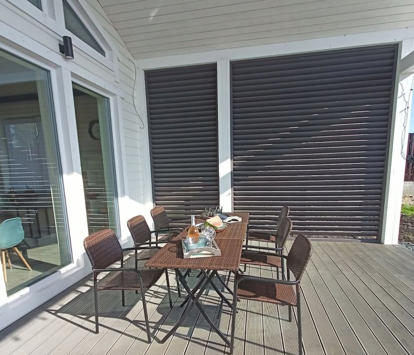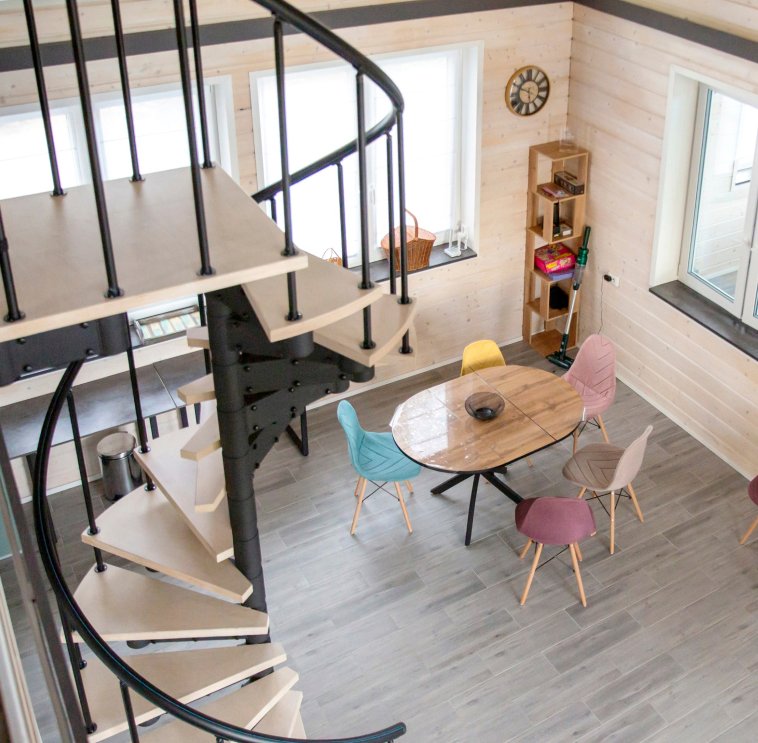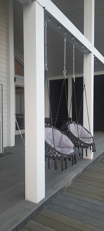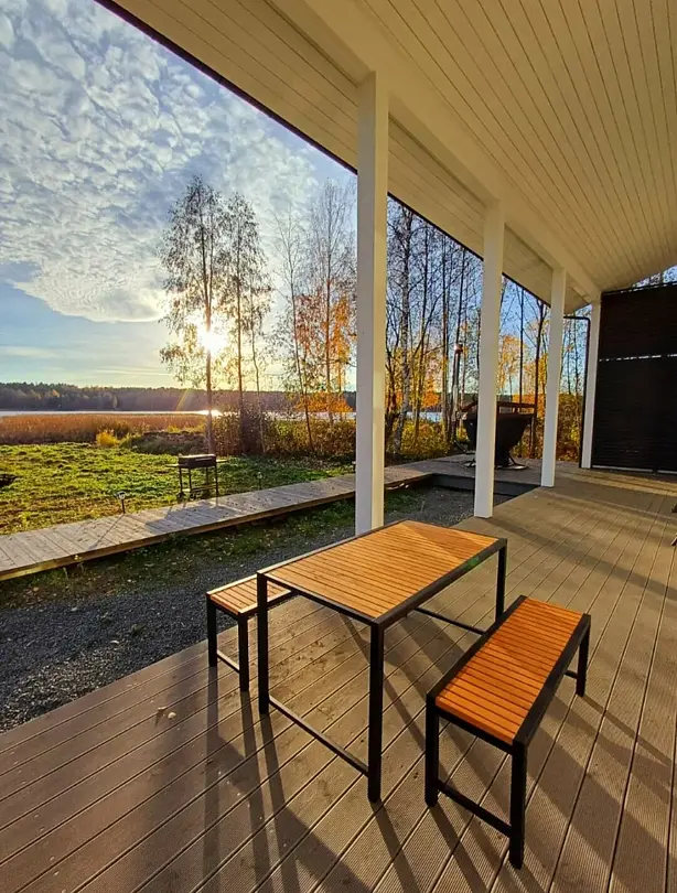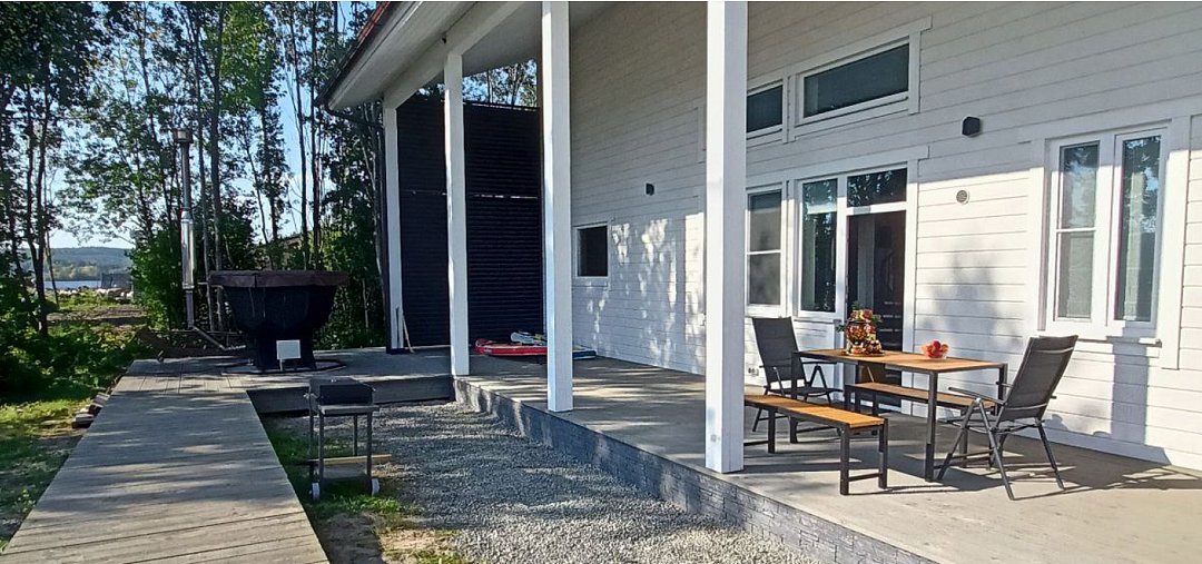 Высота потолков составляет шесть метров. К гостиной примыкает теплая веранда для занятий спортом, где размещены турник, большой теннисный стол и коврик для йоги. Открытая терраса площадью сорок пять квадратных метров с садовой мебелью предлагает прекрасный вид на озеро. Также здесь имеется сибирский чан.
