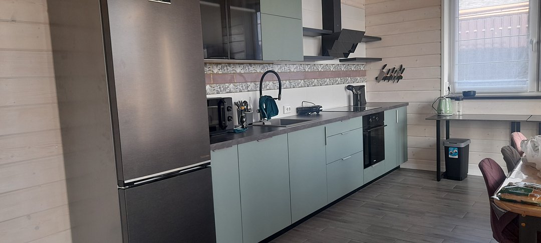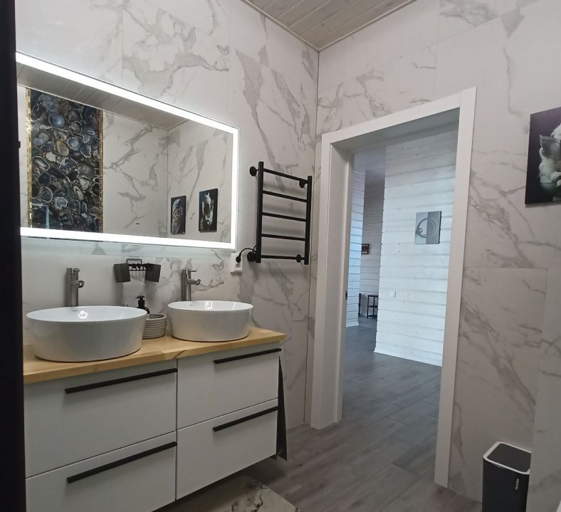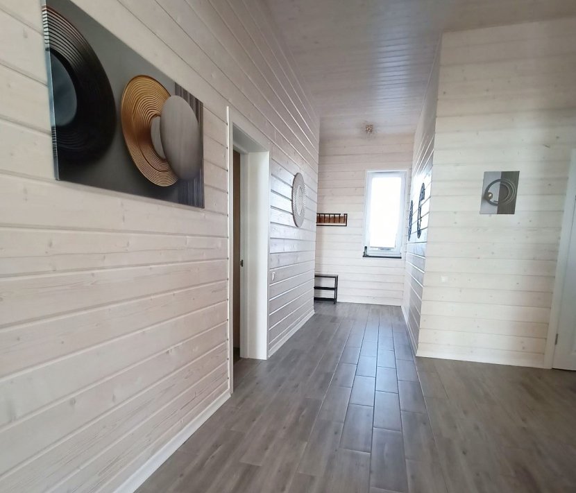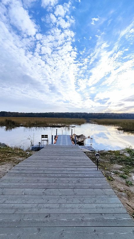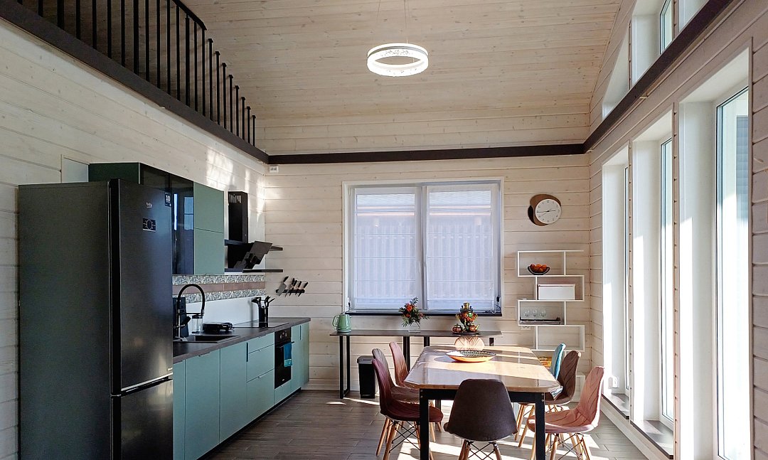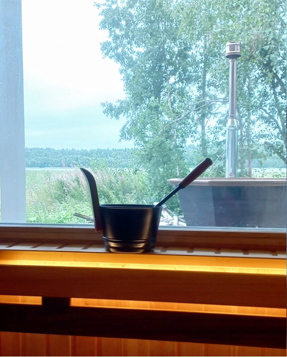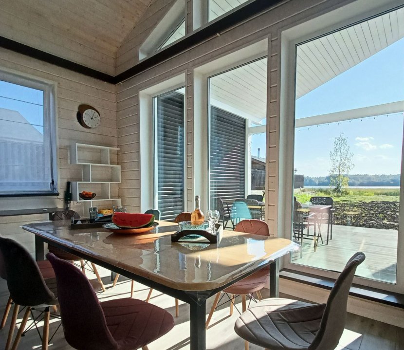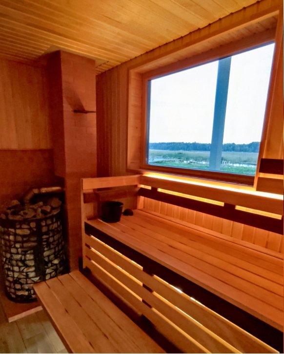 Большая гостиная с панорамными окнами на озеро, кухня, оборудованная посудомойкой, духовкой и всей необходимой бытовой техникой, камин, русская баня, отдельная душевая, санузел, стиральная машина и смарт-ТВ.