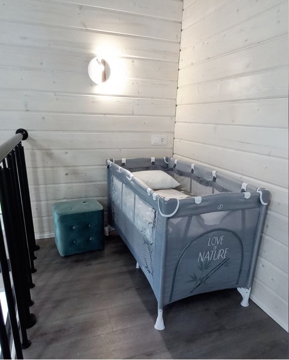 На втором этаже расположена галерея с двумя спальнями: одна с большой двуспальной кроватью и вторая с двумя односпальными. Кроме того, для детей до трех лет предусмотрена кроватка-манеж, регулируемая в соответствие с возрастом малыша. Диван в гостиной может быть использован для дополнительного размещения двух гостей.