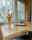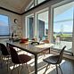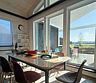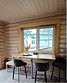 Просторная гостиная с голландским дровяным угловым камином, панорамными окнами на Онежское озеро, потолками 6 метров, смарт-ТВ; к ней примыкает столовая и современная кухня. Большой обеденный стол из цельного дерева рассчитан на 10 человек.