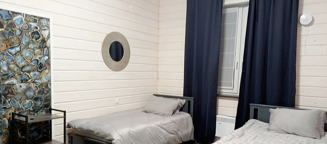 Для большего количества гостей предлагается коттедж с русской баней, спортивной верандой и флигелем. Он состоит из двух изолированных комнат с кухней, c/у, стиральной машиной, бытовой техникой. Двуспальный диван в одной, и односпальная кровать в другой комнате соответственно.