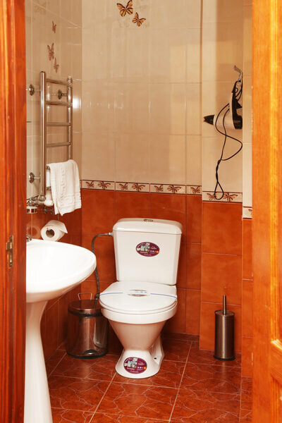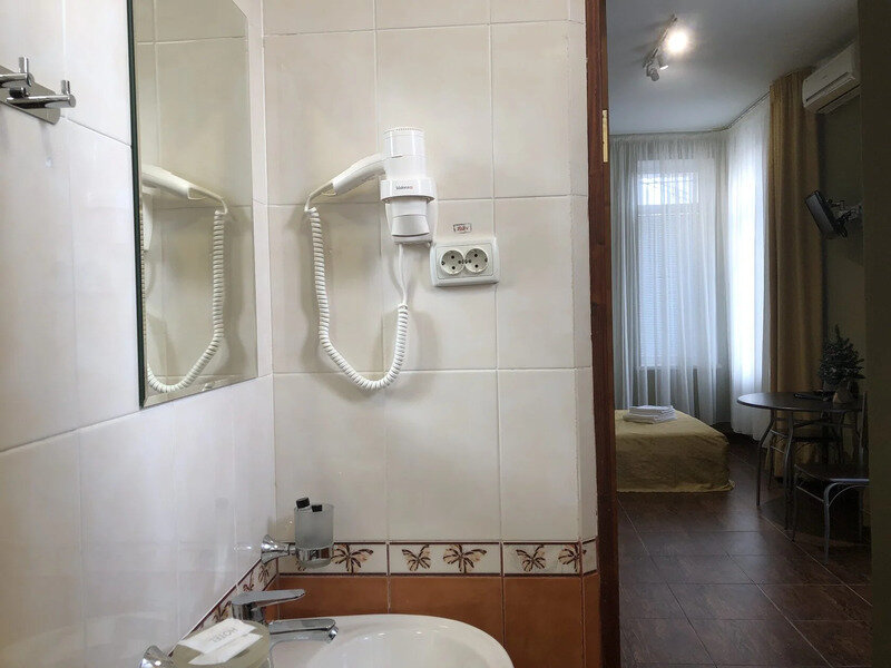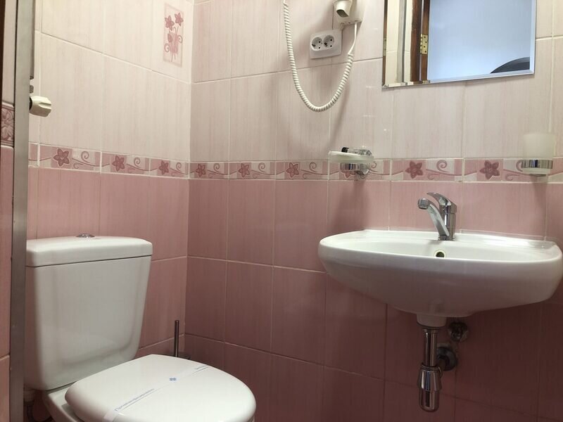 Кухня, санузел. Фен и одноразовые тапочки уже в номере.