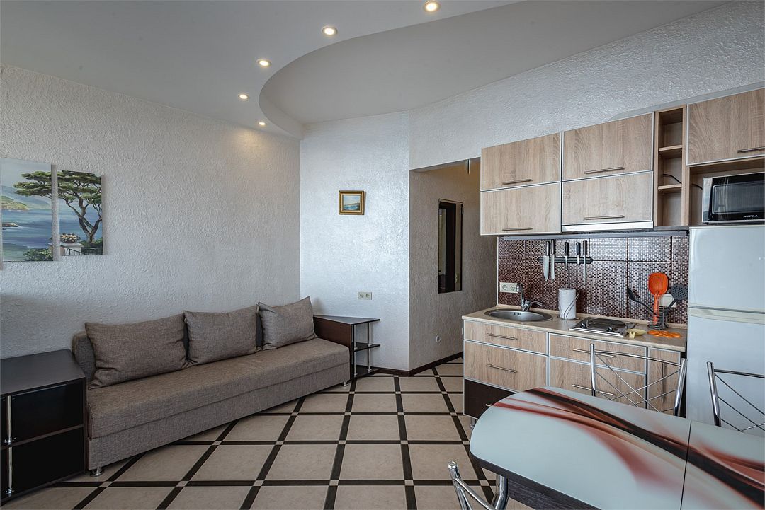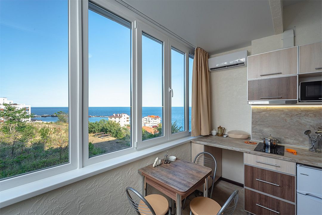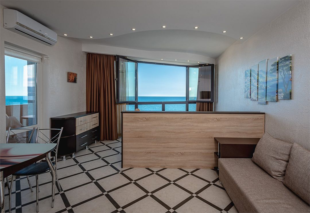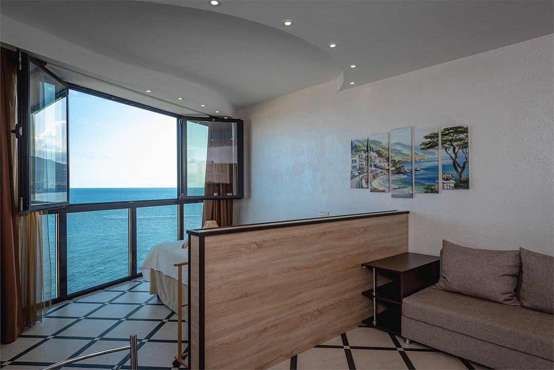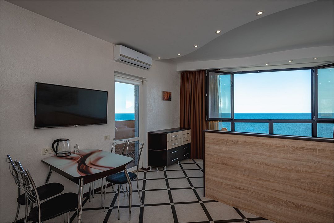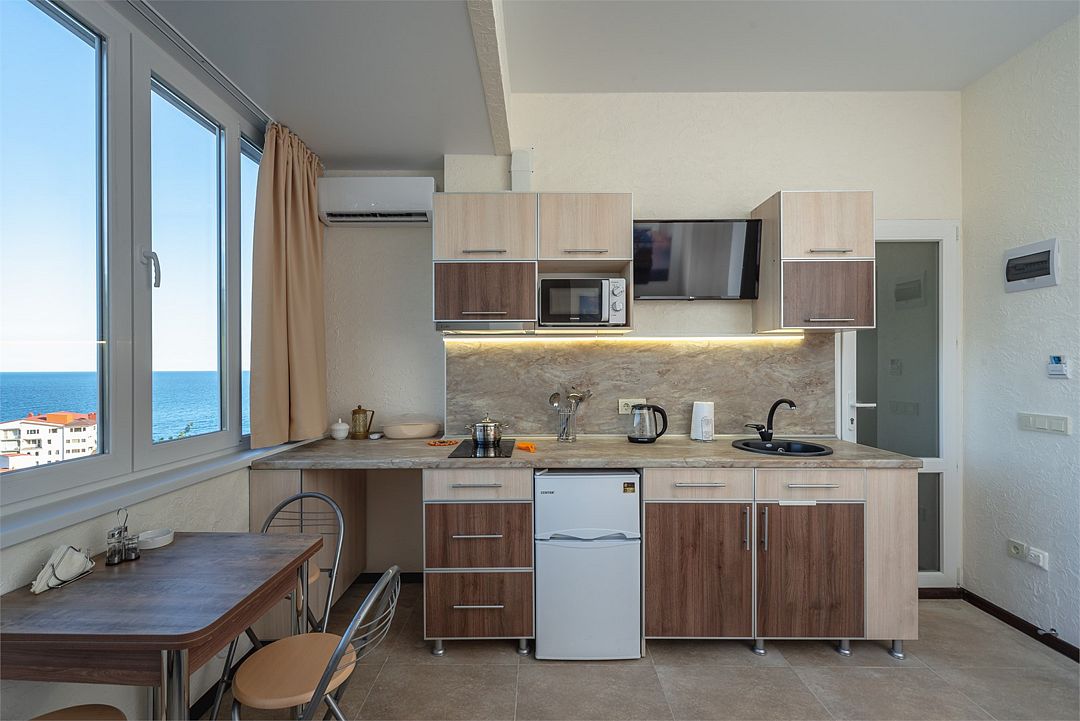 Wi-Fi, кондиционер, фен, электронные замки, плита для приготовления пищи, микроволновая печь, утюг, водонагреватель, банные полотенца, пляжные полотенца, лоджия, гладильная доска, тумбы, вешалки, журнальный столик, комод, пуфики, чайный набор, набор посуды, сейф, чайник, унитаз, раковина, душ, плиточное покрытие, высокие потолки, кухонная посуда, стаканы, кухонная утварь, столовые приборы, сплит-система, сушилка для белья, диван-кровать, раскладной диван, телевизор с плоским экраном, мини-холодильник, мини-кухня, частичный вид на мореВ гостиничном номере