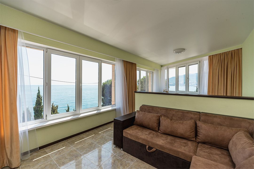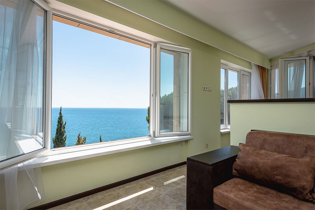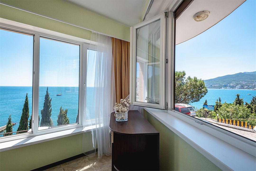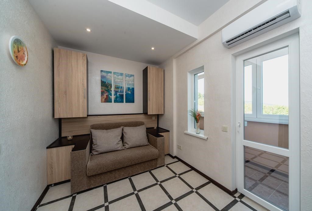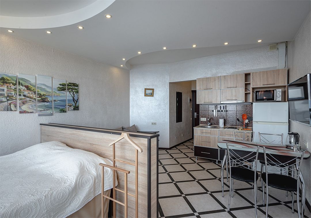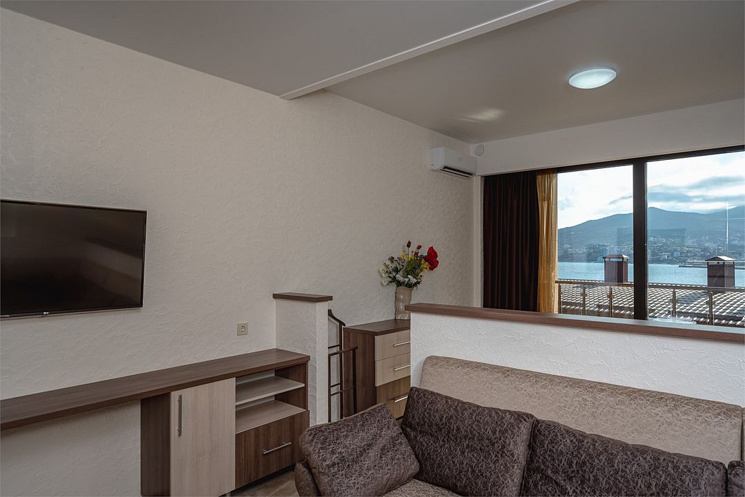 Wi-Fi, кондиционер, фен, электронные замки, плита для приготовления пищи, микроволновая печь, утюг, водонагреватель, банные полотенца, пляжные полотенца, лоджия, гладильная доска, тумбы, вешалки, журнальный столик, комод, пуфики, чайный набор, набор посуды, сейф, чайник, унитаз, раковина, душ, плиточное покрытие, высокие потолки, кухонная посуда, стаканы, кухонная утварь, столовые приборы, сплит-система, сушилка для белья, диван-кровать, раскладной диван, телевизор с плоским экраном, мини-холодильник, мини-кухня, частичный вид на мореВ гостиничном номере