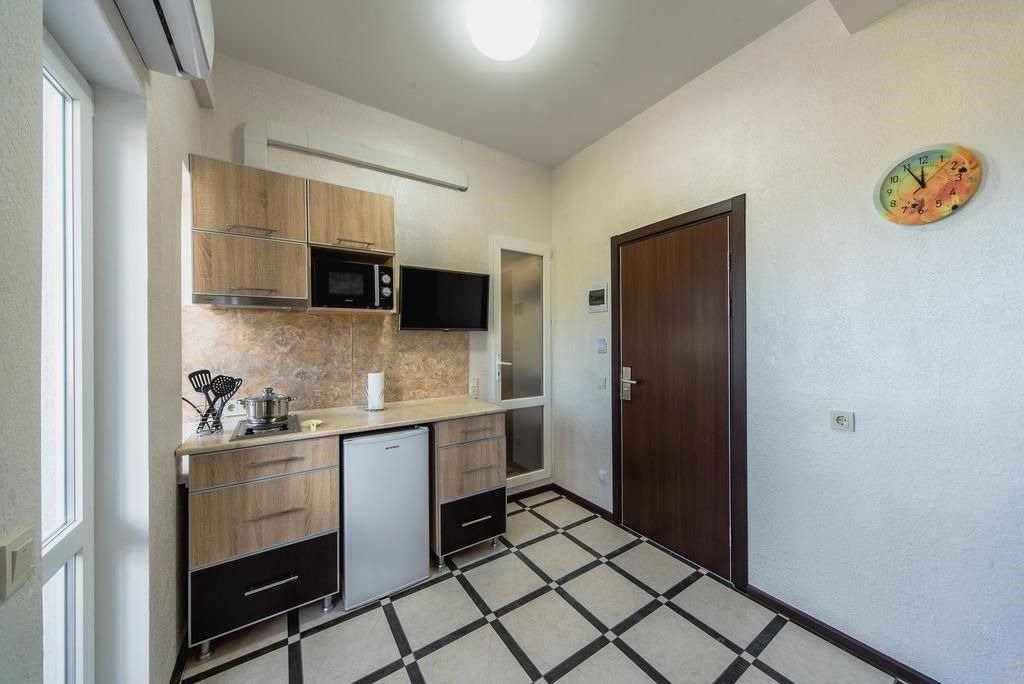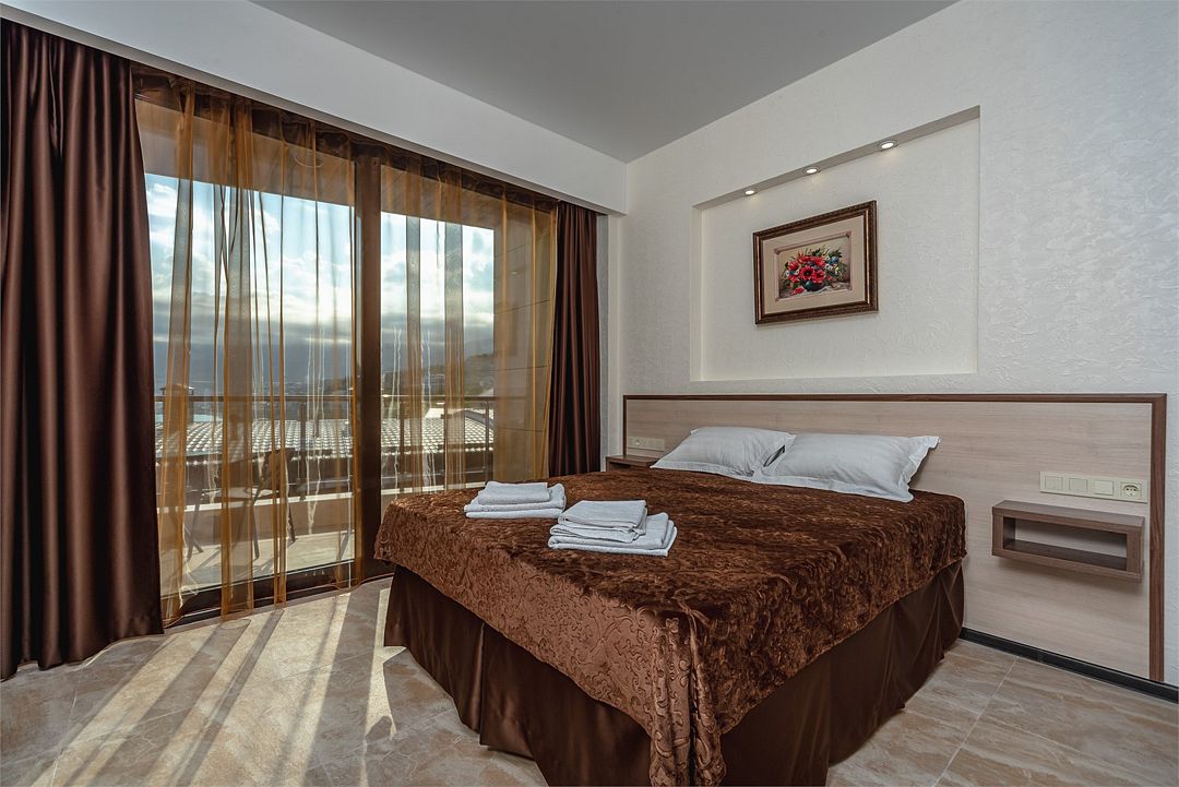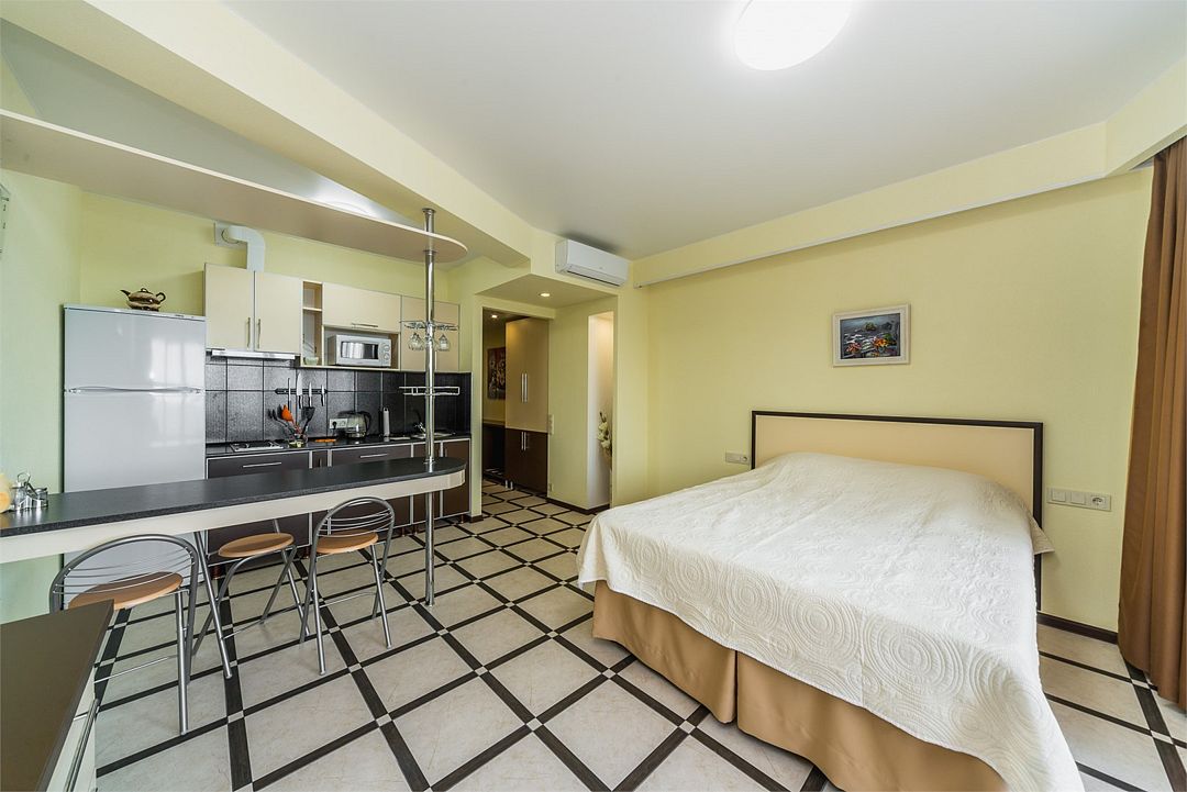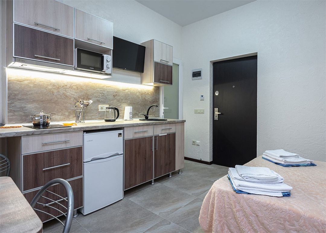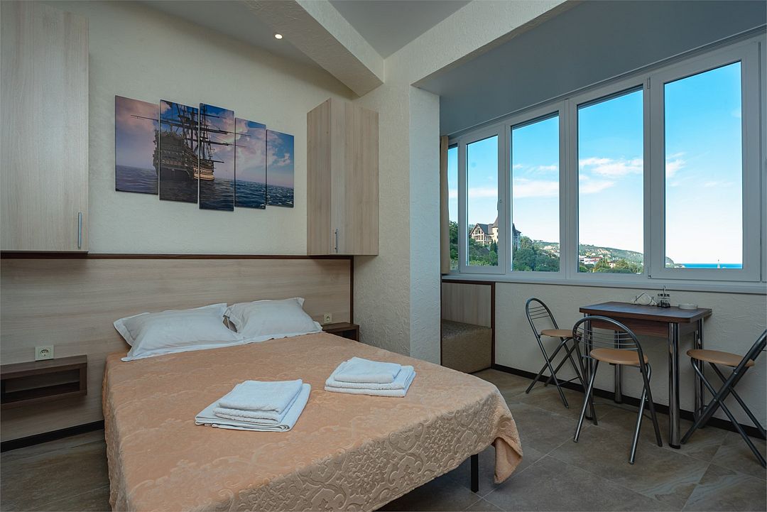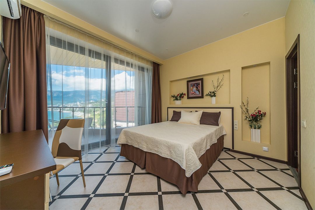 телевизор, Wi-Fi, холодильник, кондиционер, фен, утюг, ванная комната, двуспальная кровать, тумбы, стулья, шкаф для одежды, вешалки, чайный набор, чайник, вид на море, кухонная посуда, стол, сушилка для белья, мини-кухняВ гостиничном номере