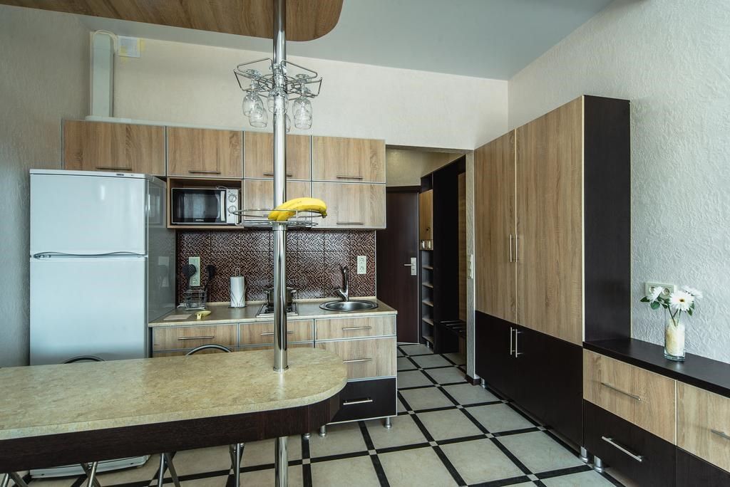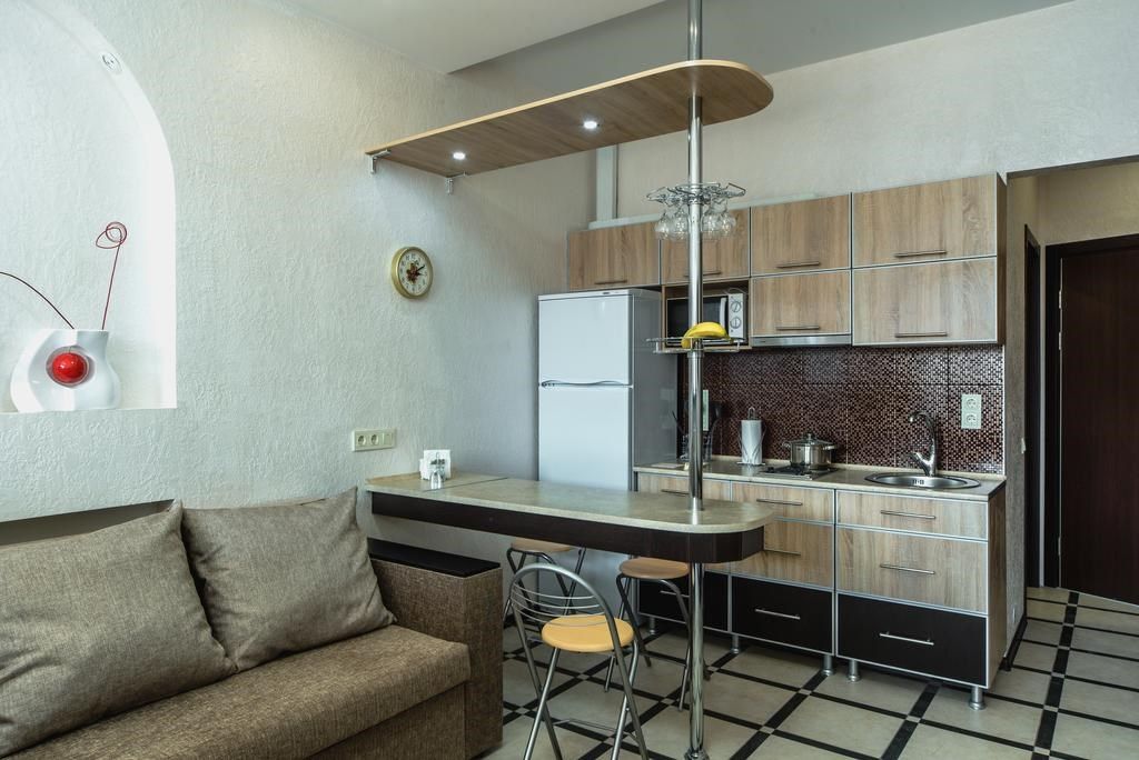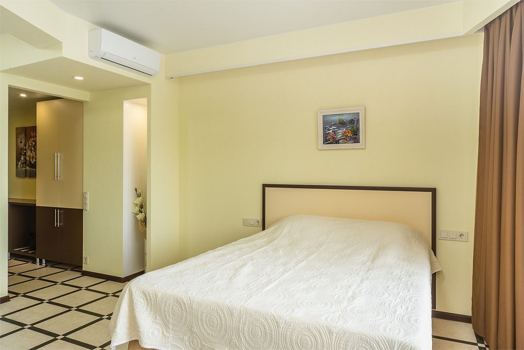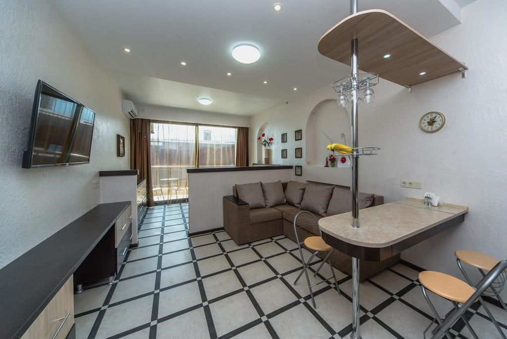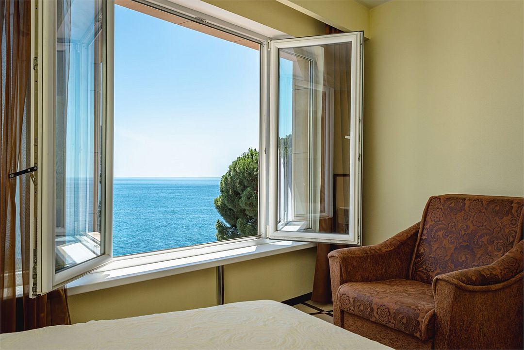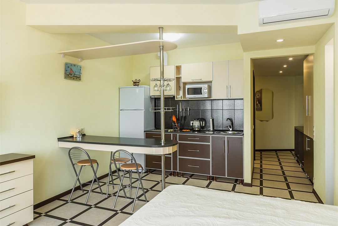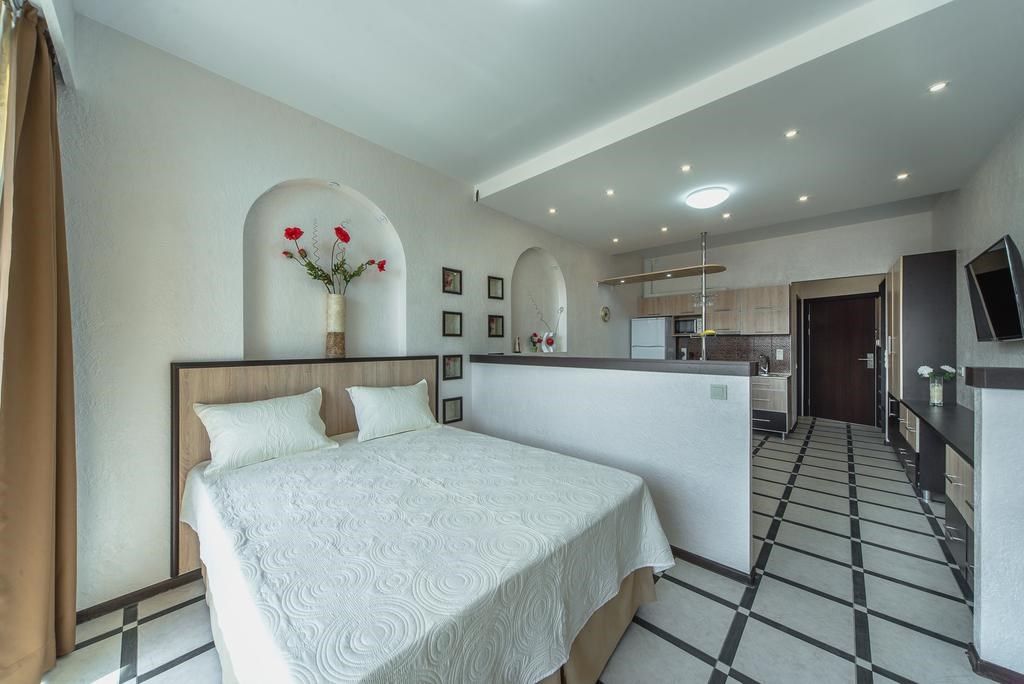 телевизор, Wi-Fi, холодильник, кондиционер, фен, утюг, ванная комната, двуспальная кровать, тумбы, стулья, шкаф для одежды, вешалки, чайный набор, чайник, вид на море, кухонная посуда, стол, сушилка для белья, мини-кухняВ гостиничном номере