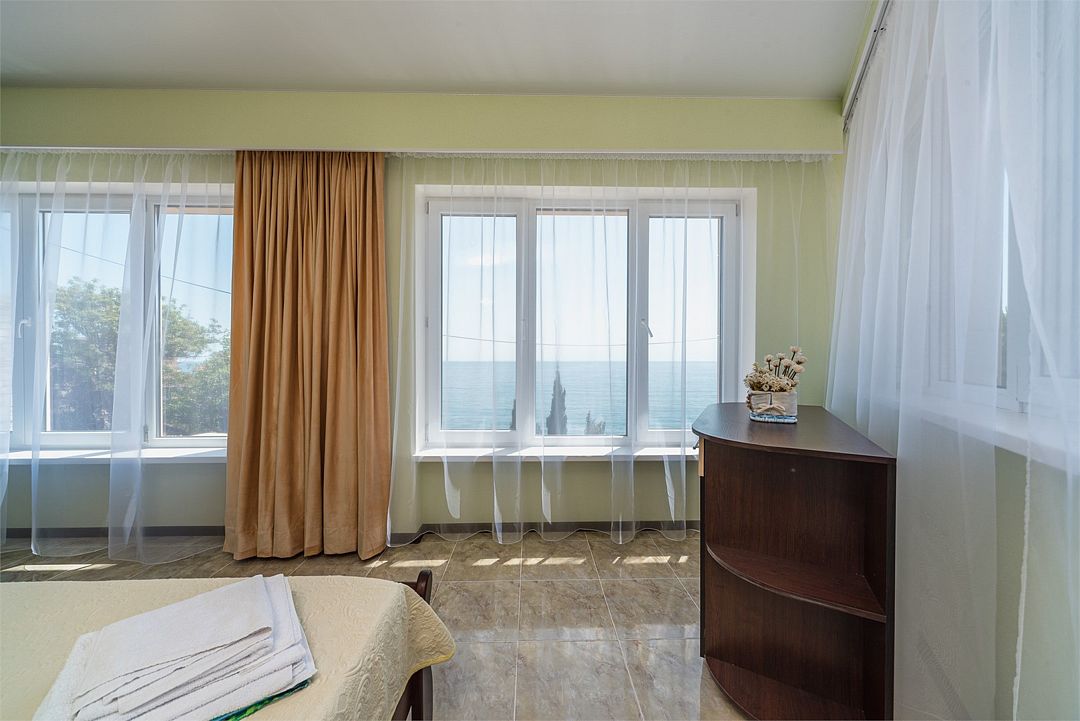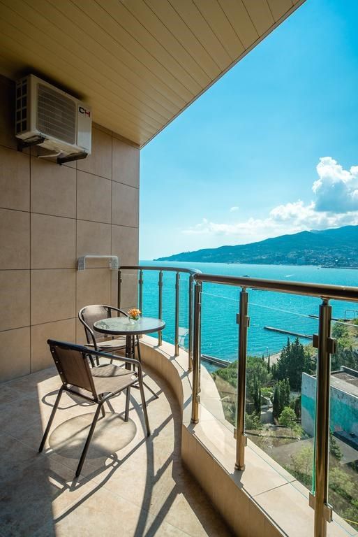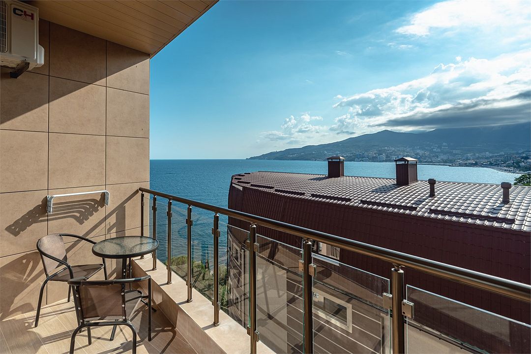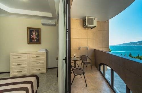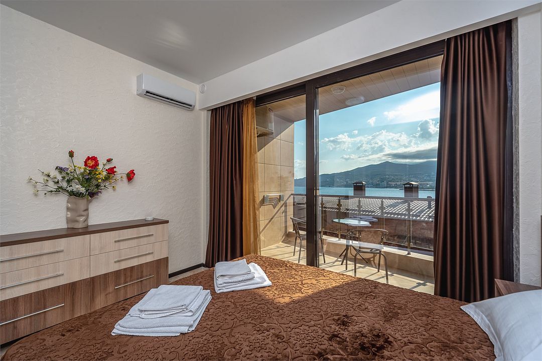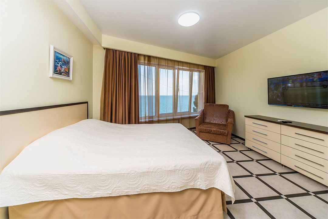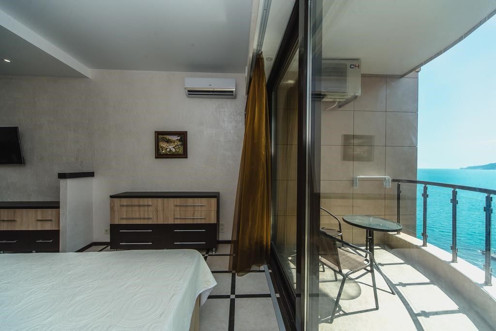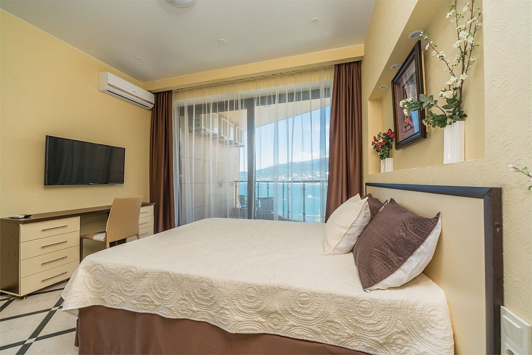 Wi-Fi, холодильник, кондиционер, фен, электронные замки, плита для приготовления пищи, микроволновая печь, утюг, водонагреватель, банные полотенца, пляжные полотенца, двуспальная кровать, тумбы, стулья, шкаф для одежды, вешалки, чайный набор, чайник, унитаз, раковина, душ, вид на море, стол, сплит-система, сушилка для белья, телевизор с плоским экраномВ гостиничном номере