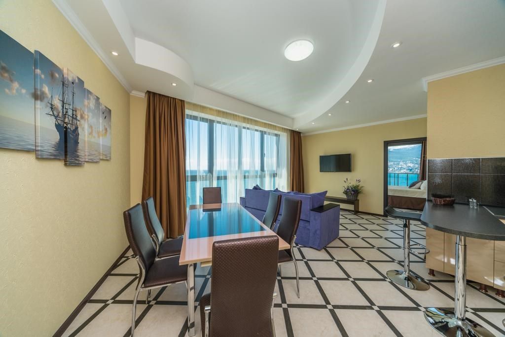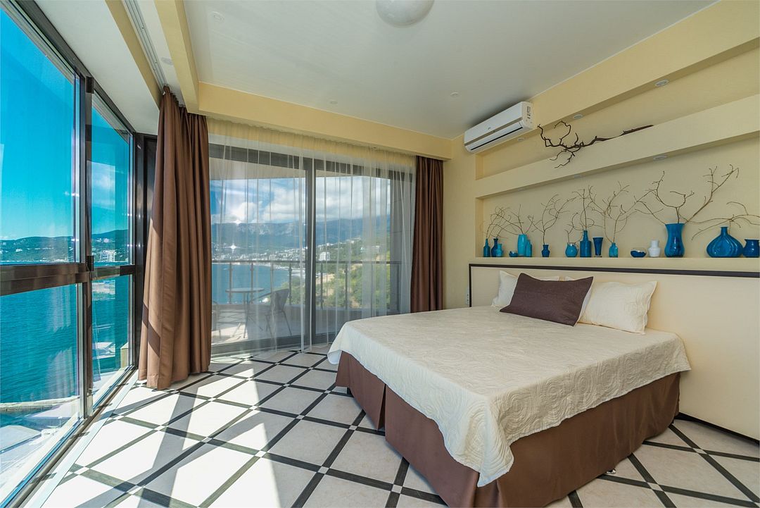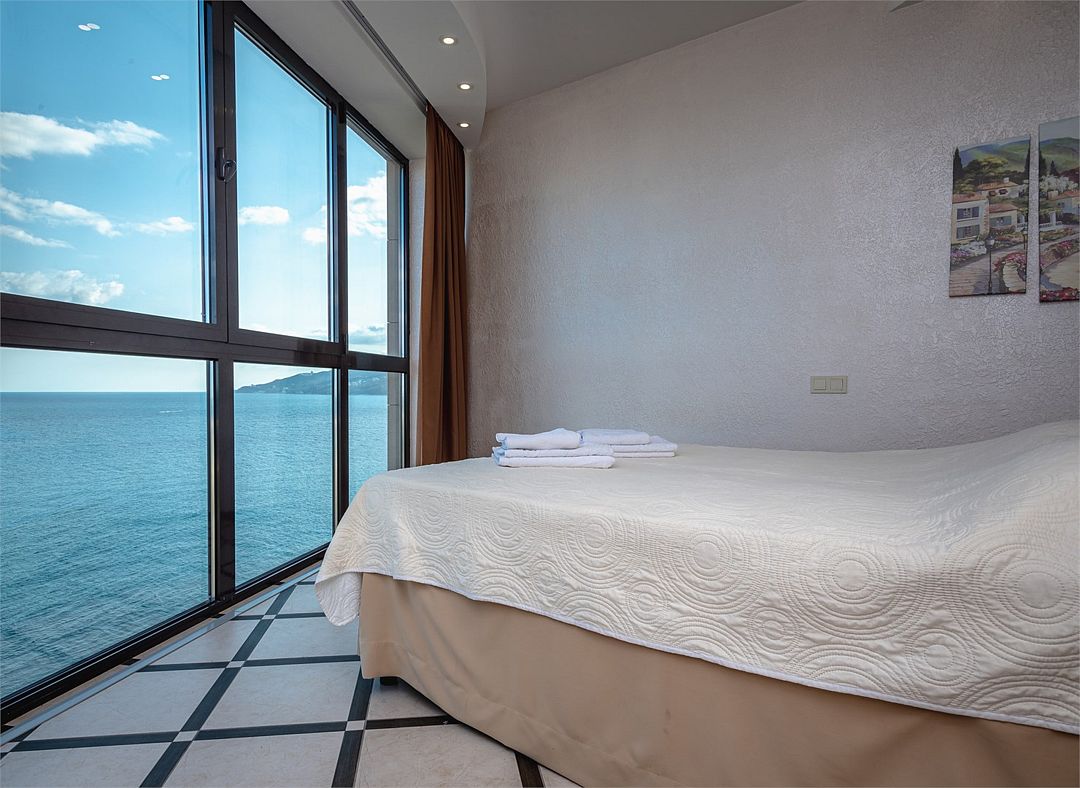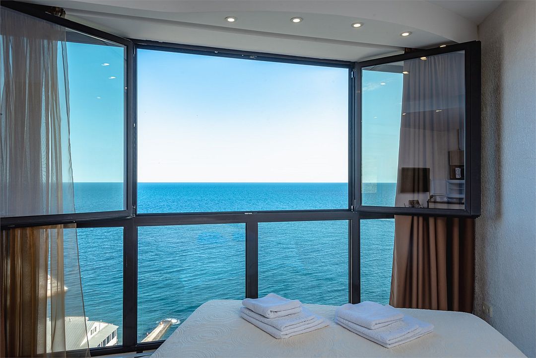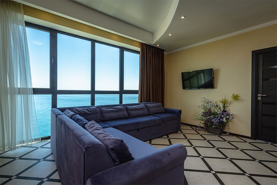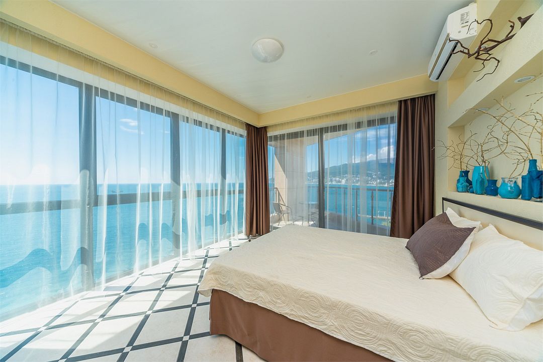 Wi-Fi, холодильник, кондиционер, плита для приготовления пищи, микроволновая печь, душевая кабина, водонагреватель, банные полотенца, двуспальная кровать, обеденный стол, барная стойка, зеркало, кухня, сейф, стиральная машина, чайник, унитаз, раковина, вид на море, плиточное покрытие, стаканы, столовые приборы, панорамные окна, диван-кровать, телевизор с плоским экраномВ гостиничном номере