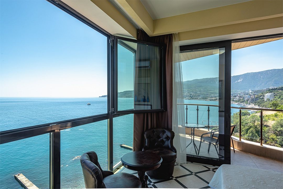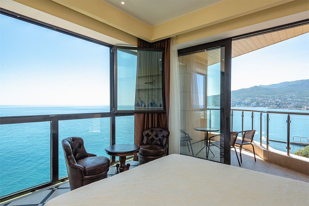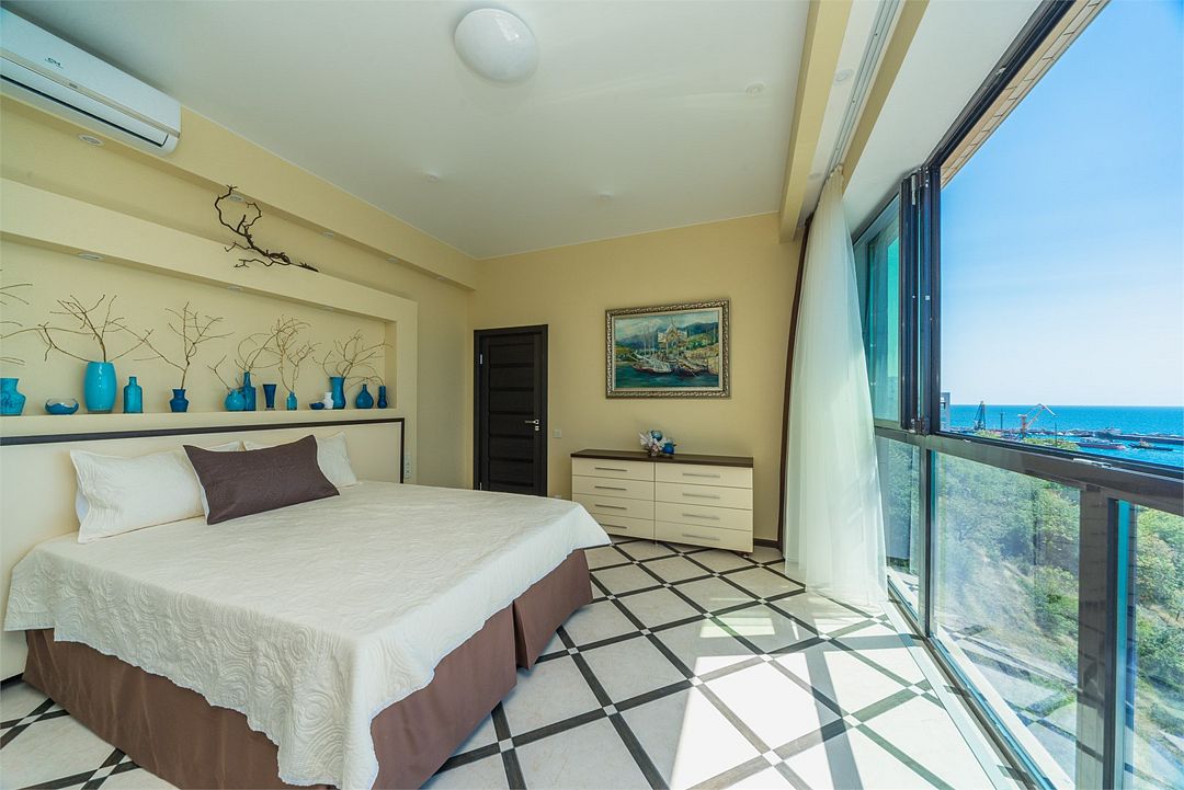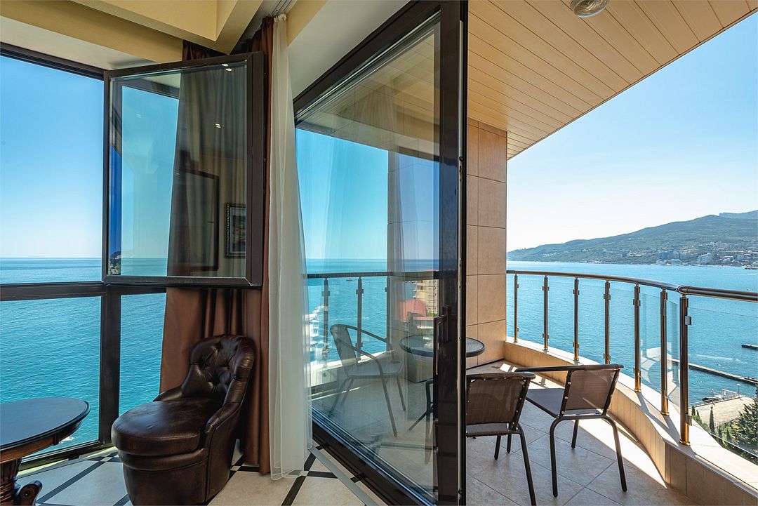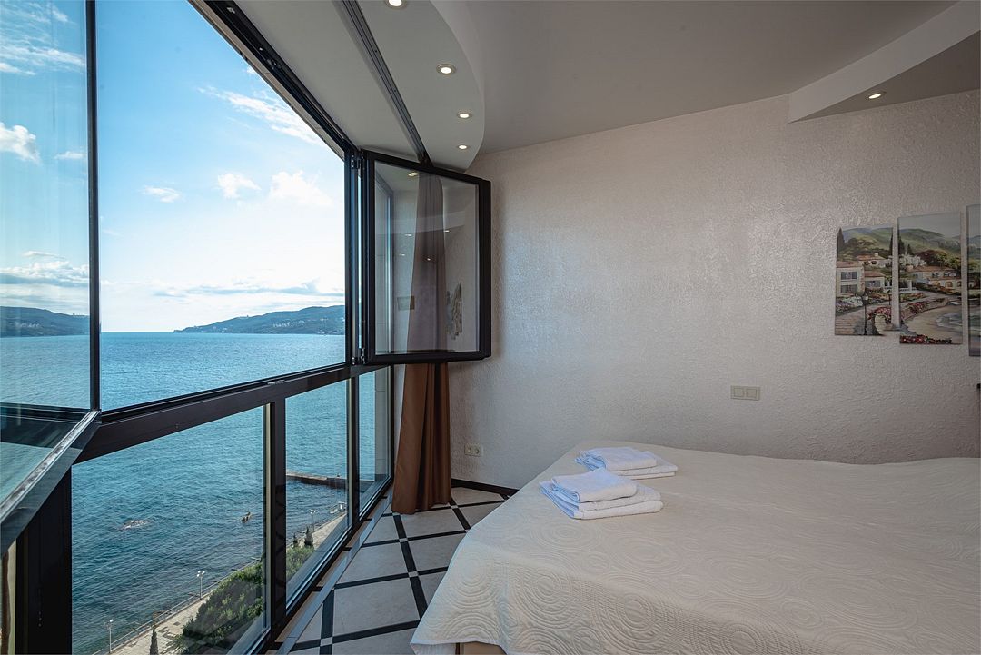Wi-Fi, холодильник, кондиционер, плита для приготовления пищи, микроволновая печь, душевая кабина, водонагреватель, банные полотенца, двуспальная кровать, обеденный стол, барная стойка, зеркало, кухня, сейф, стиральная машина, чайник, унитаз, раковина, вид на море, плиточное покрытие, стаканы, столовые приборы, панорамные окна, диван-кровать, телевизор с плоским экраномВ гостиничном номере
