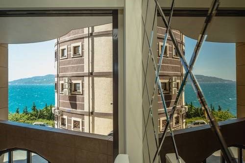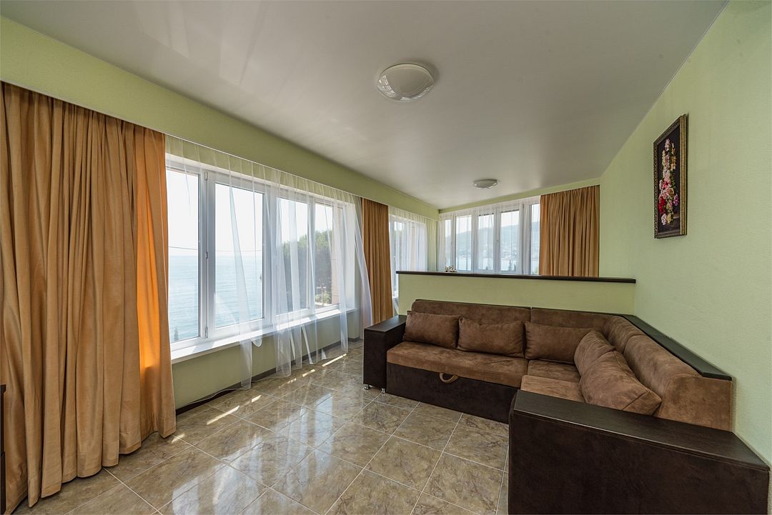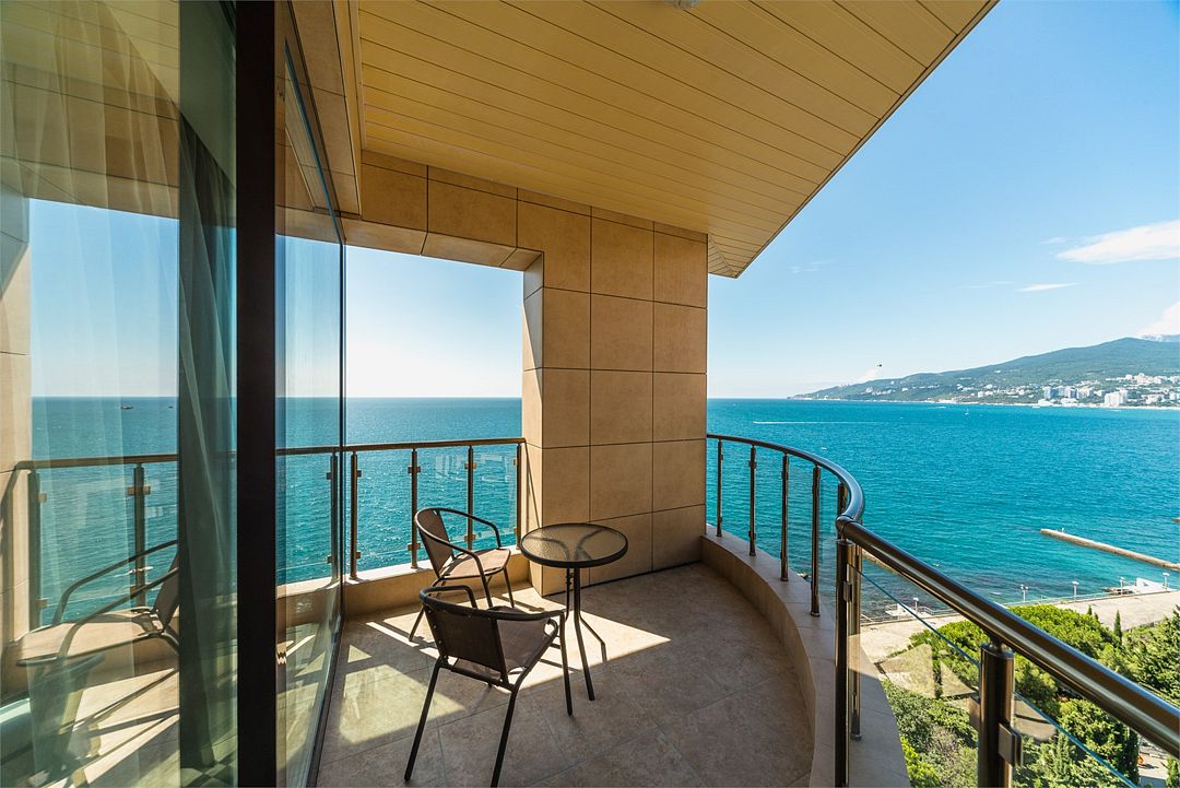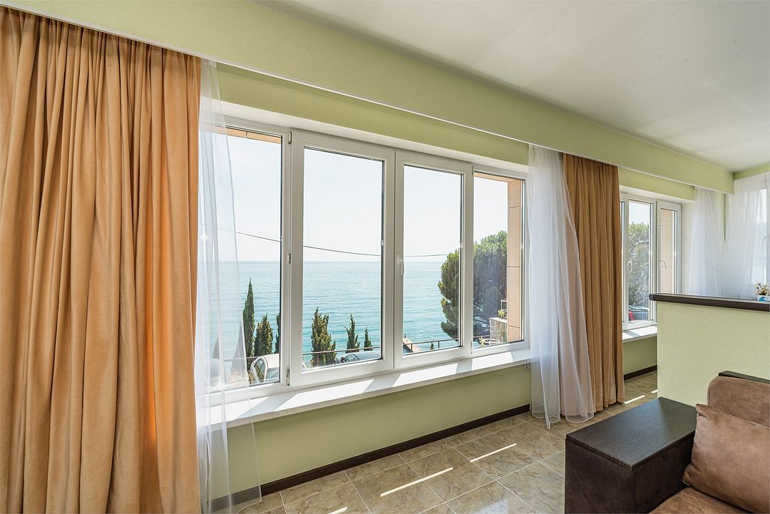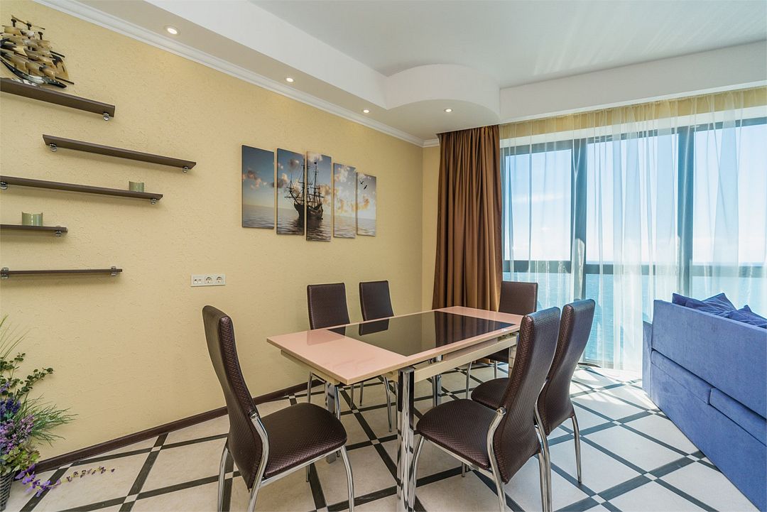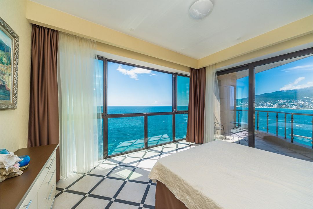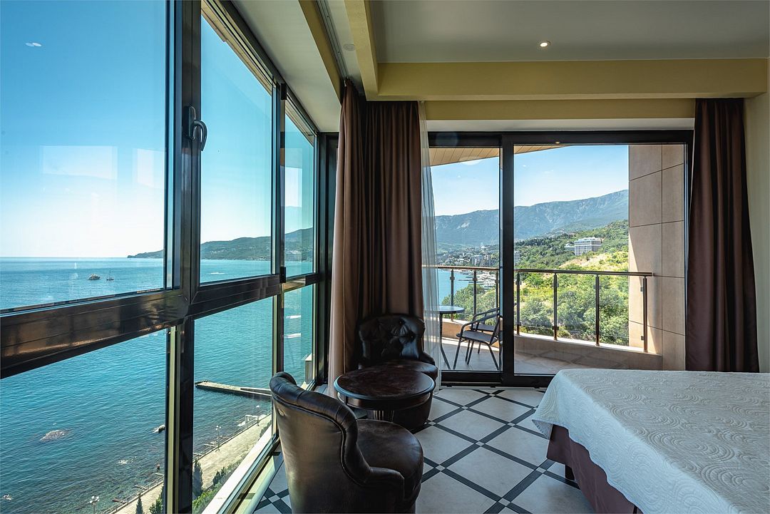 Wi-Fi, холодильник, кондиционер, плита для приготовления пищи, микроволновая печь, душевая кабина, водонагреватель, банные полотенца, двуспальная кровать, обеденный стол, барная стойка, зеркало, кухня, сейф, стиральная машина, чайник, унитаз, раковина, вид на море, плиточное покрытие, стаканы, столовые приборы, панорамные окна, диван-кровать, телевизор с плоским экраномВ гостиничном номере