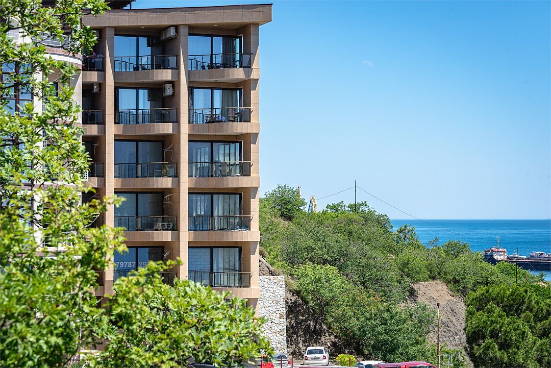 Wi-Fi, холодильник, кондиционер, фен, электронные замки, плита для приготовления пищи, микроволновая печь, утюг, банные полотенца, пляжные полотенца, двуспальная кровать, тумбы, стулья, шкаф для одежды, вешалки, барная стойка, комод, кухня, чайный набор, стиральная машина, чайник, унитаз, раковина, душ, вид во двор, кухонная посуда, стол, сушилка для белья, телевизор с плоским экраном, балкон с боковым видом на море, угловой диван-кроватьВ гостиничном номере