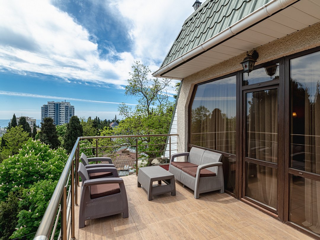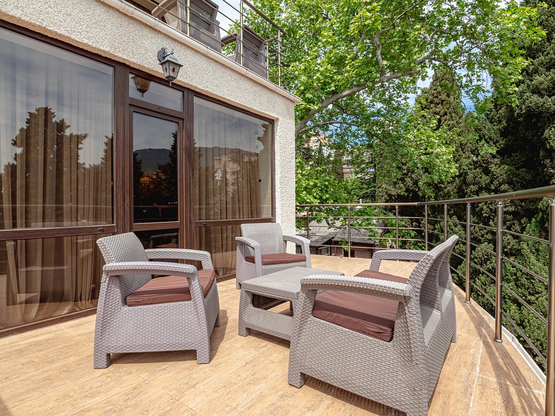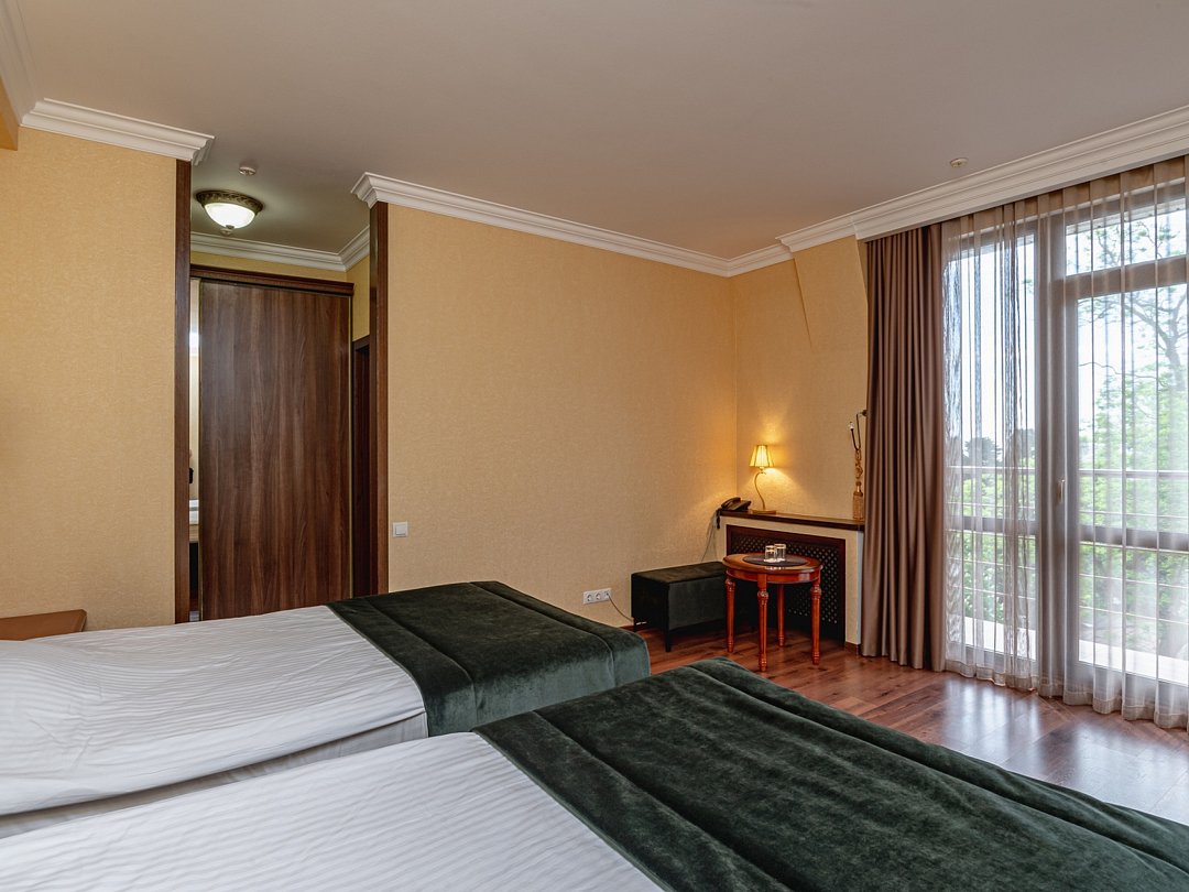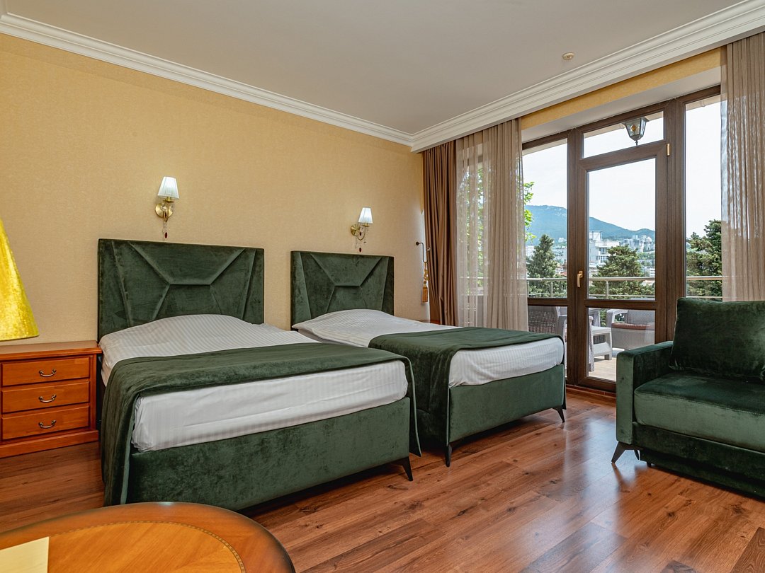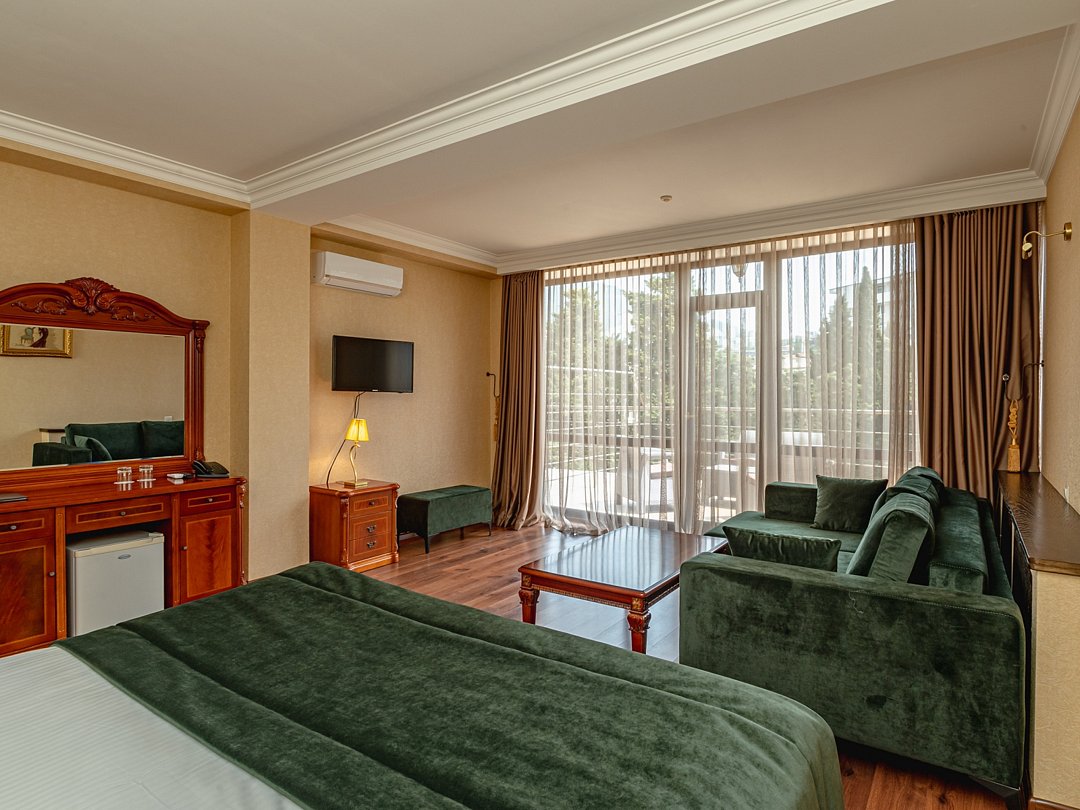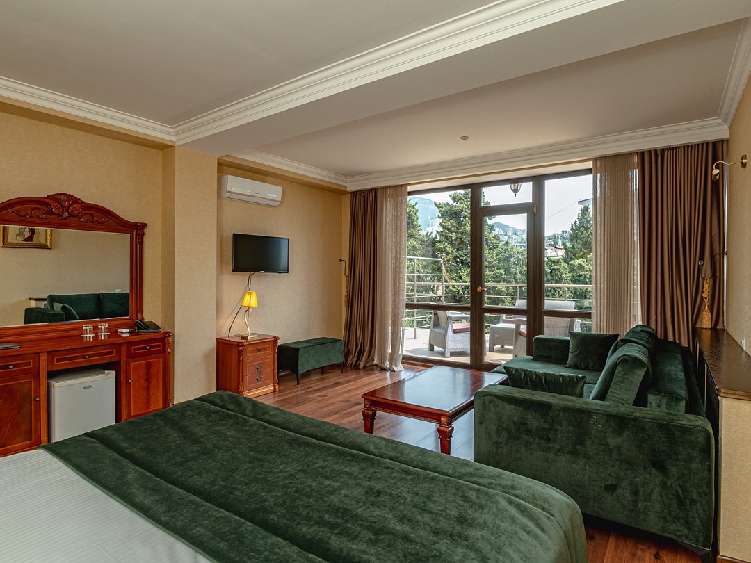 Просторный номер в частном отеле Ялты общей площадью 40 квадратных метров, с одной двуспальной или двумя полуторными (Twin) кроватями, также в гостиной зоне находится раскладной полуторный диван для проживания дополнительного человека. Есть выход на террасу площадью 15 квадратных метров, с мебелью из ротанга для комфортного отдыха. В номере имеется: мини-бар, сейф, письменный стол, кондиционер, Wi-Fi, фен, телефон, LED-телевизор с цифровым телевидением, а также фирменные халаты, одноразовые тапочки, набор полотенец на каждого гостя, минипарфюмерия.В номере