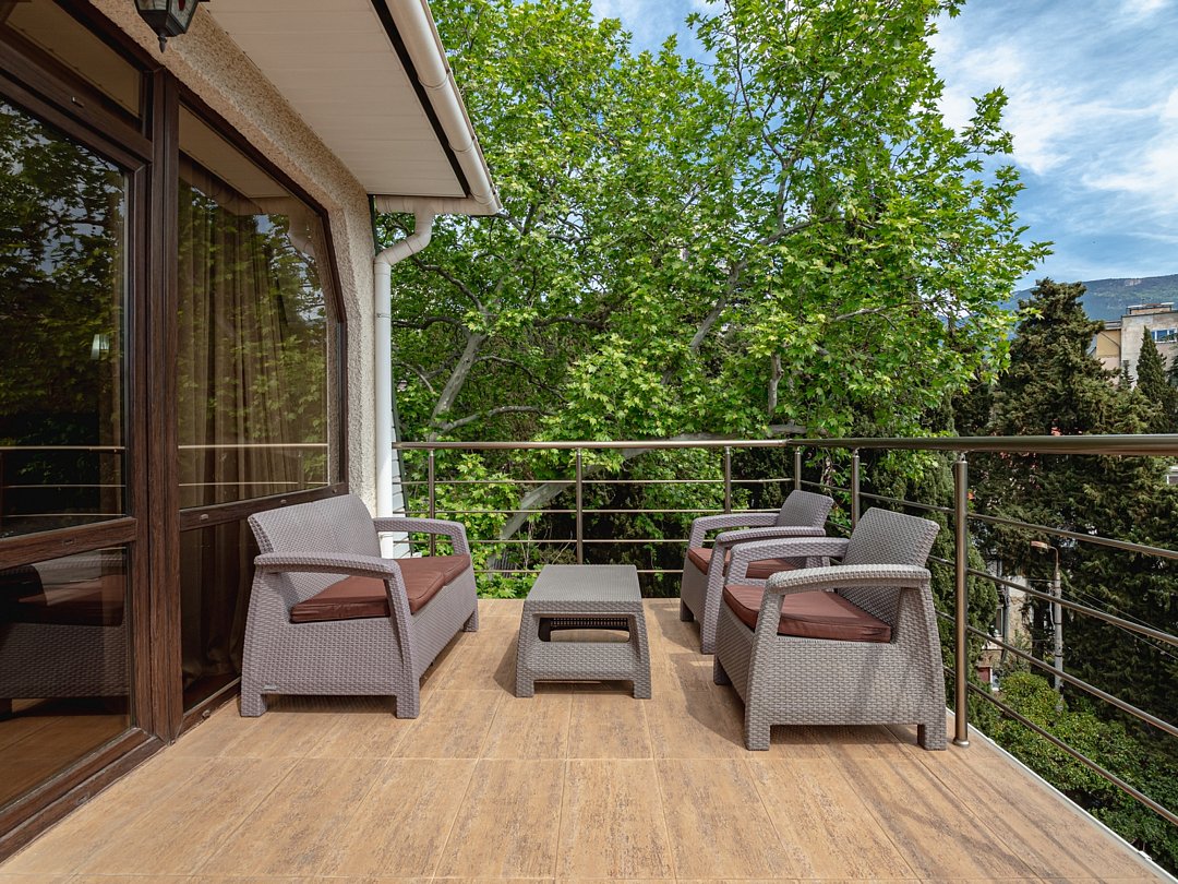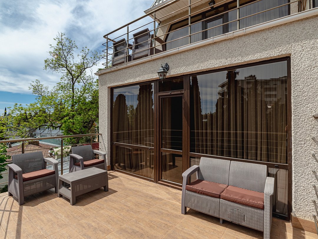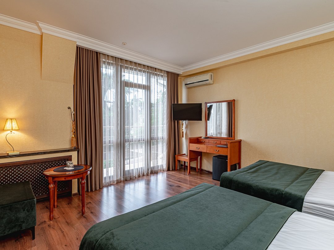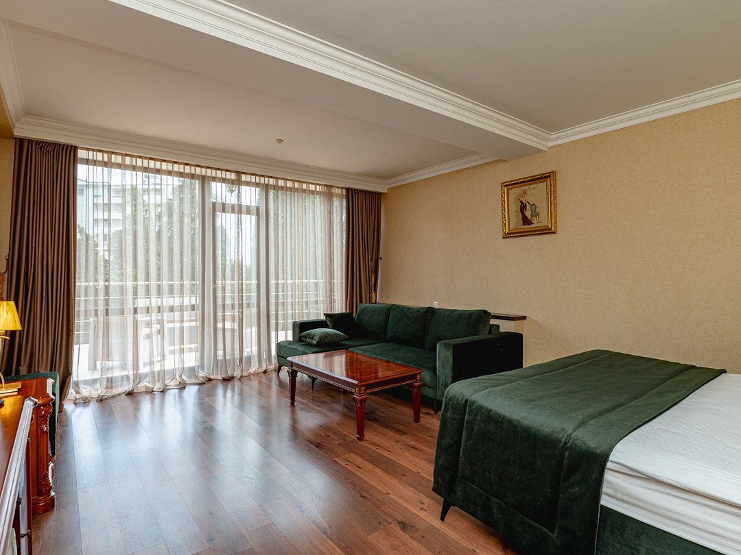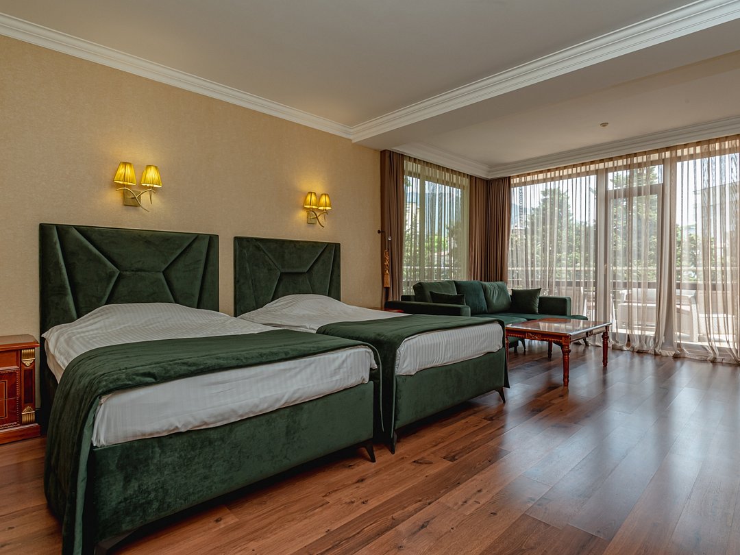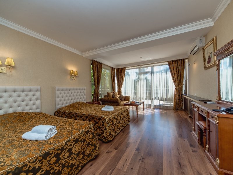 Просторный номер в частном отеле Ялты общей площадью 40 квадратных метров, с одной двуспальной или двумя полуторными (Twin) кроватями, также в гостиной зоне находится раскладной полуторный диван для проживания дополнительного человека. Есть выход на террасу площадью 15 квадратных метров, с мебелью из ротанга для комфортного отдыха. В номере имеется: мини-бар, сейф, письменный стол, кондиционер, Wi-Fi, фен, телефон, LED-телевизор с цифровым телевидением, а также фирменные халаты, одноразовые тапочки, набор полотенец на каждого гостя, минипарфюмерия.В номере