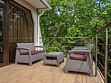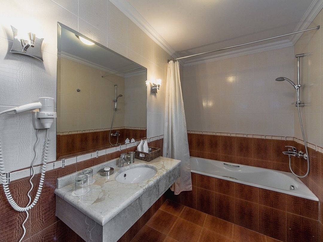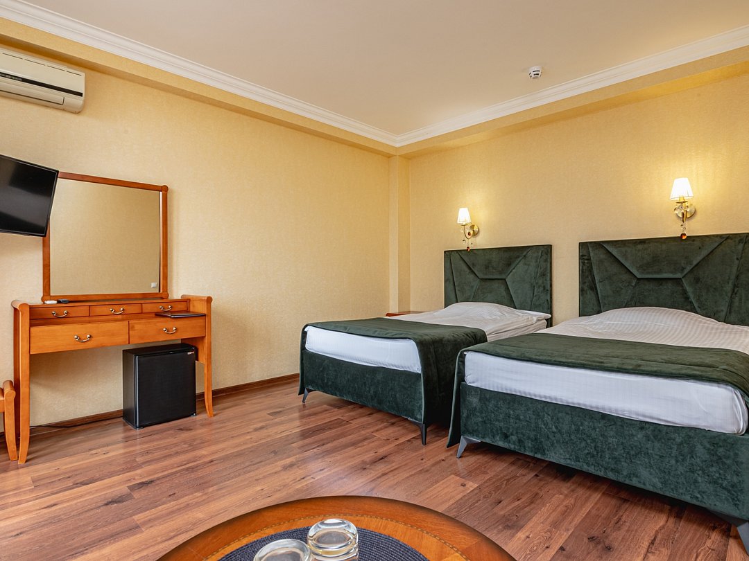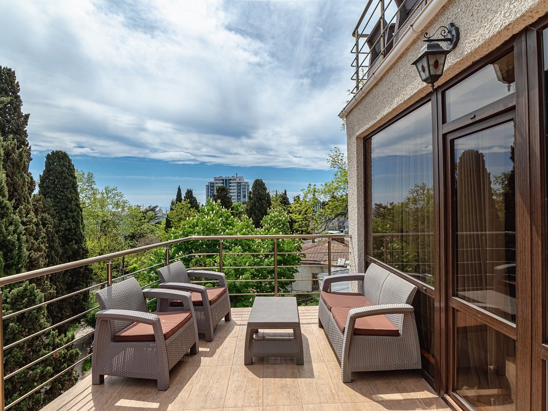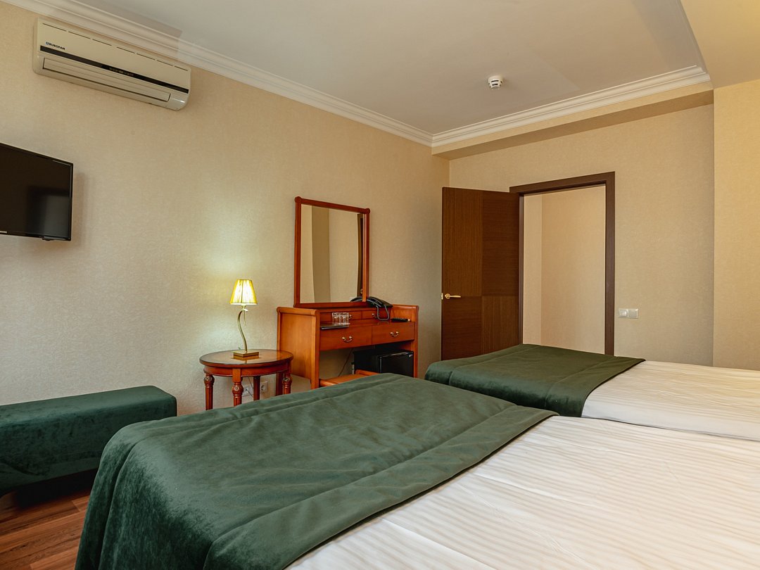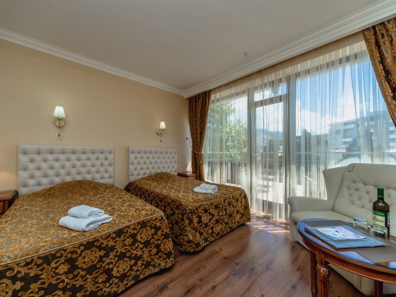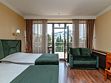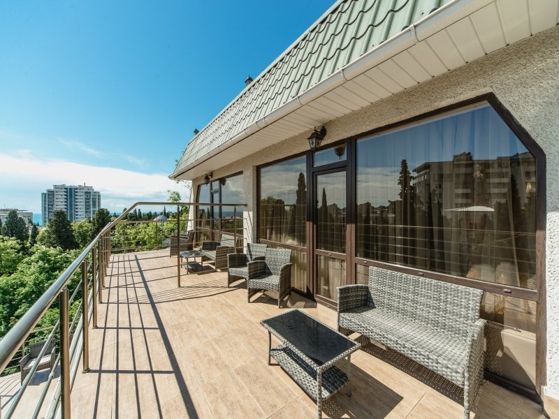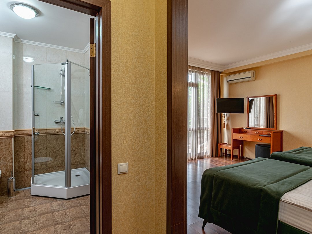 Просторный номер в частном отеле Ялты общей площадью 40 квадратных метров, с одной двуспальной или двумя полуторными (Twin) кроватями, также в гостиной зоне находится раскладной полуторный диван для проживания дополнительного человека. Есть выход на террасу площадью 15 квадратных метров, с мебелью из ротанга для комфортного отдыха. В номере имеется: мини-бар, сейф, письменный стол, кондиционер, Wi-Fi, фен, телефон, LED-телевизор с цифровым телевидением, а также фирменные халаты, одноразовые тапочки, набор полотенец на каждого гостя, минипарфюмерия.В номере