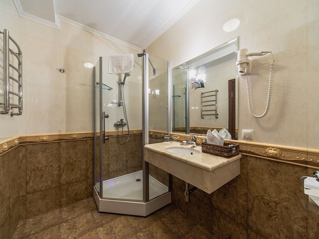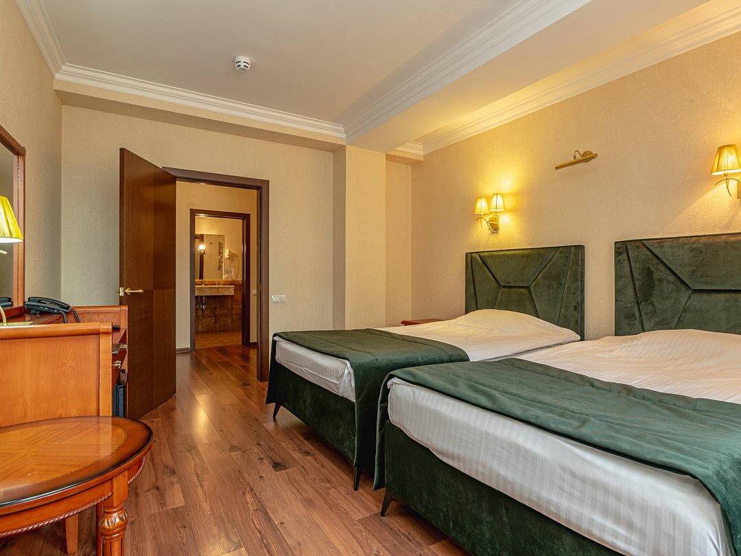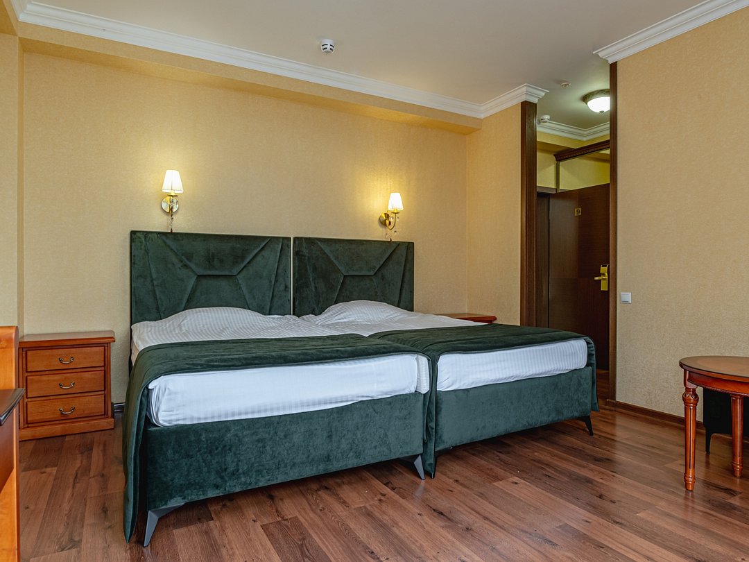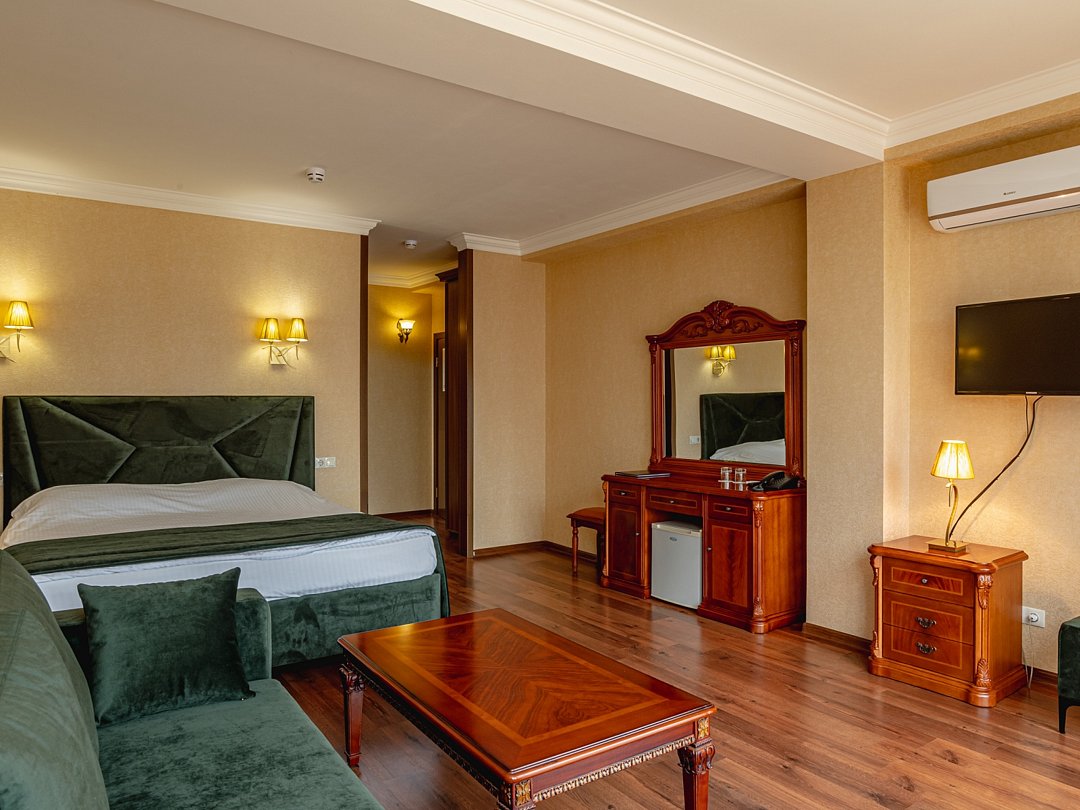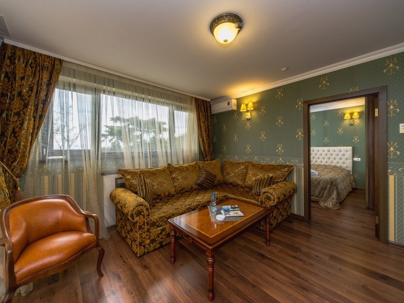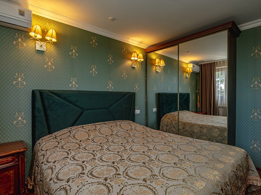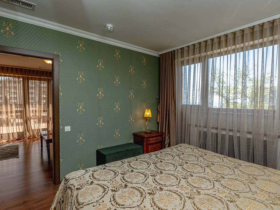 Роскошный двухкомнатный номер с выходом на балкон общей площадью 50 квадратных метров, с одной двуспальной кроватью и угловым двуспальным раскладным диваном для проживания дополнительного человека. В номере частного отеля «Бульвар» Вы можете воспользоваться мини-баром, сейфом, письменным столом, кондиционером, бесплатным Wi-Fi, феном, телефоном, LED-телевизором с цифровым телевидением. Так же имеются: фирменные халаты, одноразовые тапочки, набор полотенец на каждого гостя, минипарфюмерия.В номере