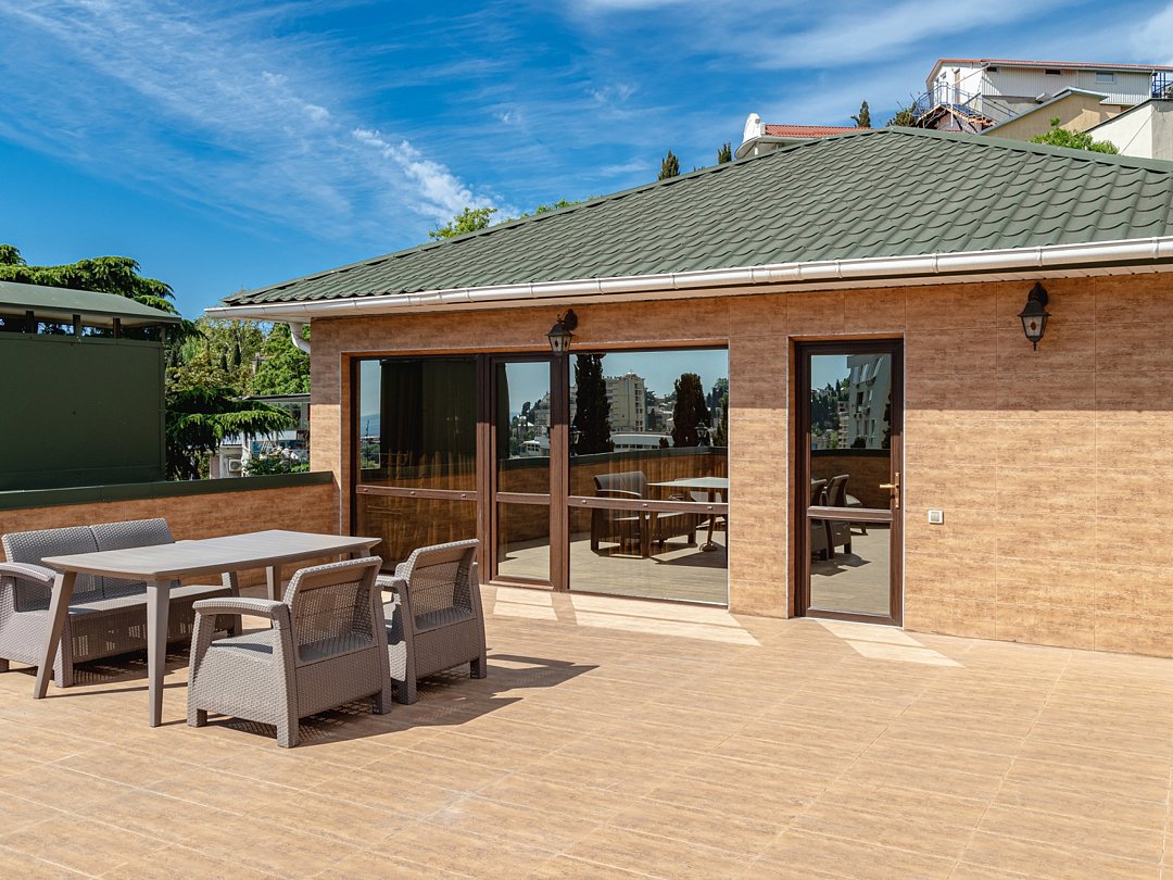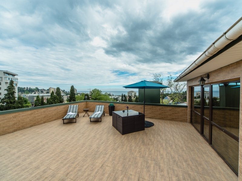Роскошный просторный, хорошо освещенный двухкомнатный номер на последнем этаже, общей площадью 60 квадратных метров, с одной двуспальной кроватью и раскладным угловым двухместным диваном в гостиной. В номере частного отеля Ялты есть отдельная кухня, а также выход на террасу площадью 60 квадратных метров, оборудованную шезлонгами, ротанговыми креслами и столом для комфортного отдыха. В номере Вы можете воспользоваться мини-баром, сейфом, письменным столом, кондиционером, бесплатным Wi-Fi, феном, телефоном, LED-телевизором с цифровым телевидением. Так же имеются: фирменные халаты, одноразовые тапочки, набор полотенец на каждого гостя, минипарфюмерия.В номере