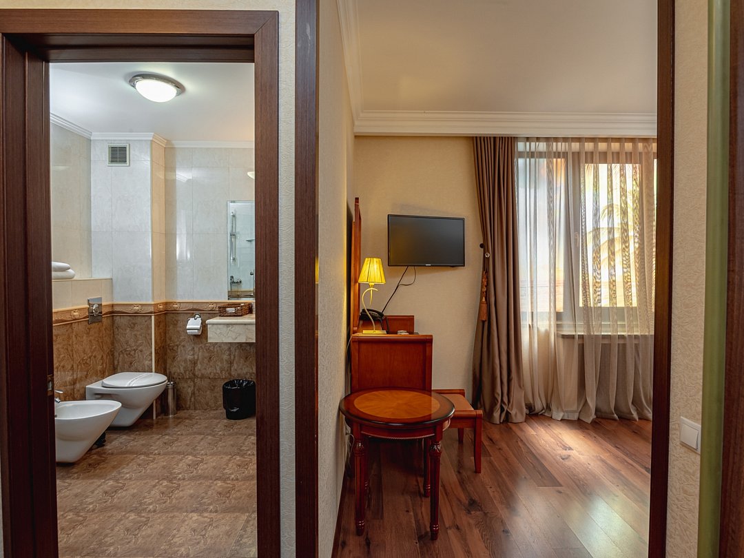 Уютный и комфортабельный однокомнатный номер отеля г. Ялта общей площадью от 25 до 28 квадратных метров с одной двуспальной или двумя полуторными (Twin) кроватями. Номер оборудован мини-баром, сейфом, кондиционером, бесплатным высокоскоростным WiFi, феном, телефоном, цифровым телевидением и LED-телевизором. А также в номере: фирменные халаты, одноразовые тапочки, набор полотенец, ежедневная уборка номера, смена постельного белья, замена гигиенических средств. Номер без балкона. Не видовой.В номере