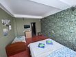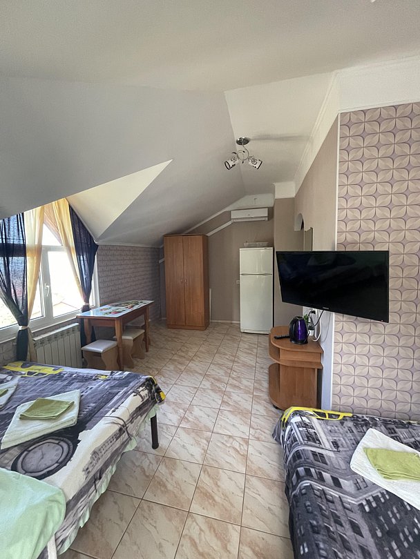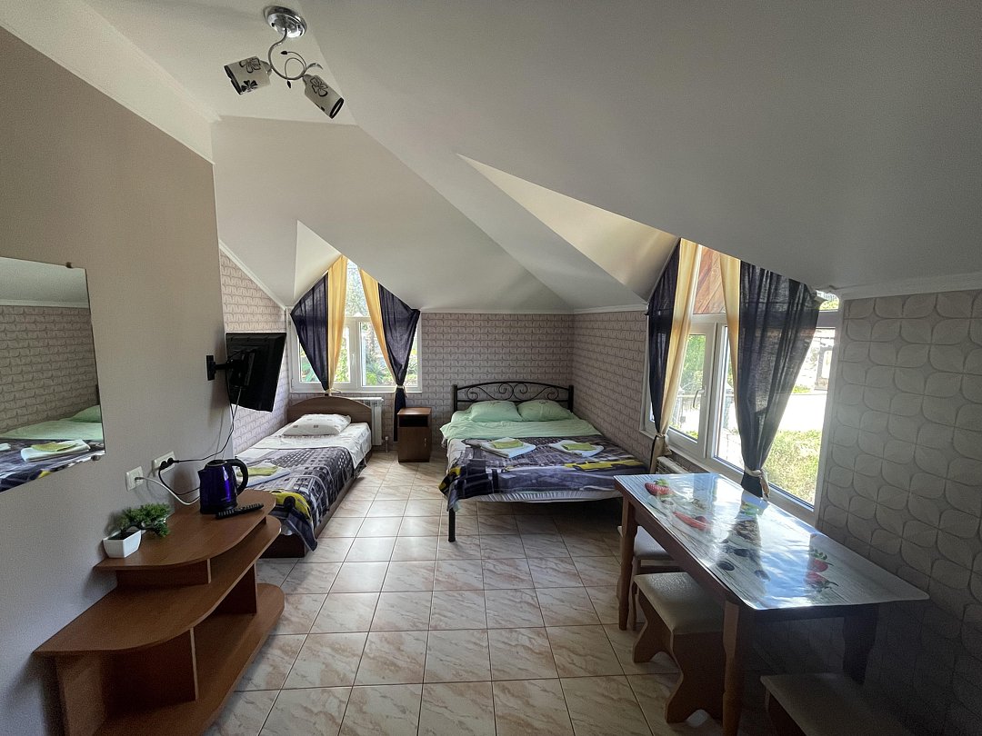 4-х местный номер оборудован всем необходимым для комфортного проживания: кровать, тумба прикроватная, шкаф, комод, стол, стулья, тв, wifi, холодильник, кондиционер и сан узел ( душ, унитаз, раковина).В номере