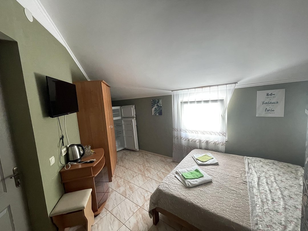 2-х местный номер оборудован всем необходимым для комфортного проживания: кровать, тумба прикроватная, шкаф, комод, стол, стулья, тв, wifi, холодильник, кондиционер и сан узел ( душ, унитаз, раковина).В номере