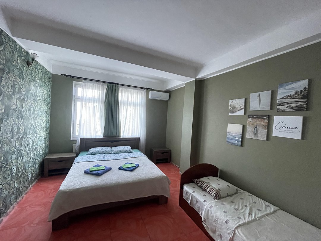 3-х местный номер оборудован всем необходимым для комфортного проживания: кровать, тумба прикроватная, шкаф, комод, стол, стулья, тв, wifi, холодильник, кондиционер и сан узел ( душ, унитаз, раковина).В номере