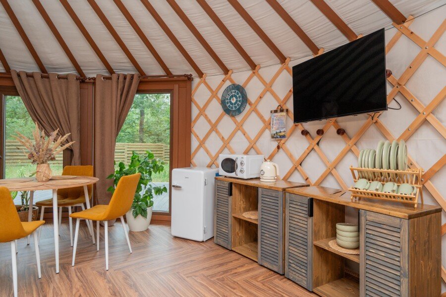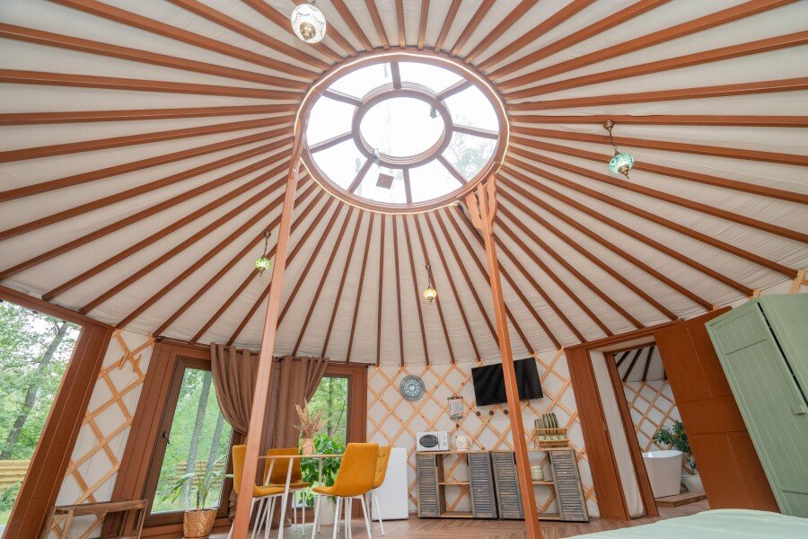 Просторное внутреннее помещение юрты оборудовано всем необходимым для комфортного проживания: удобной мебелью, современной системой отопления и уютной зоной отдыха, где можно расслабиться после насыщенного дня.