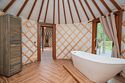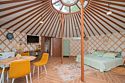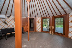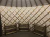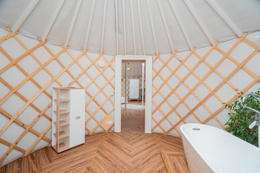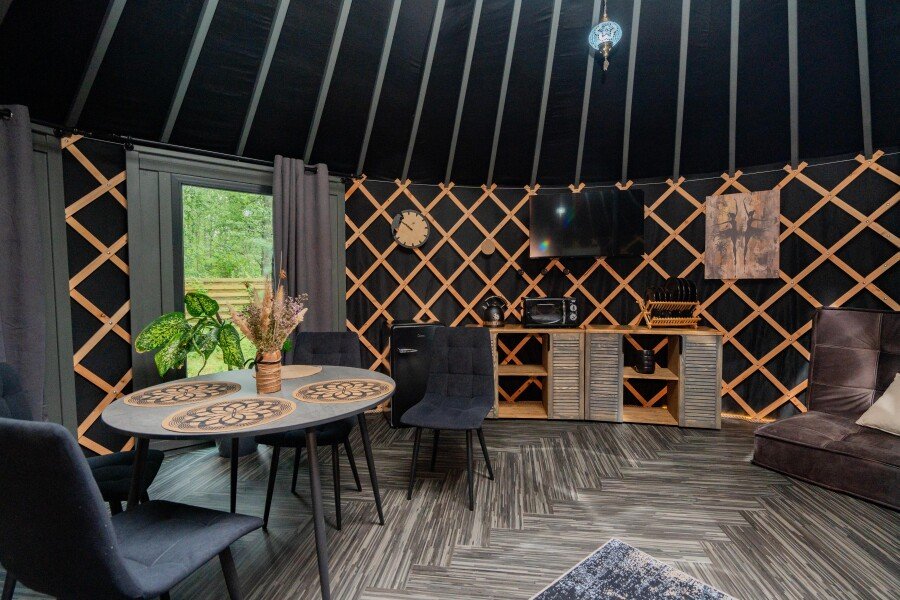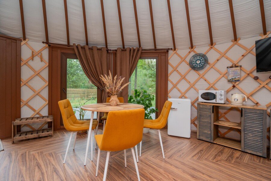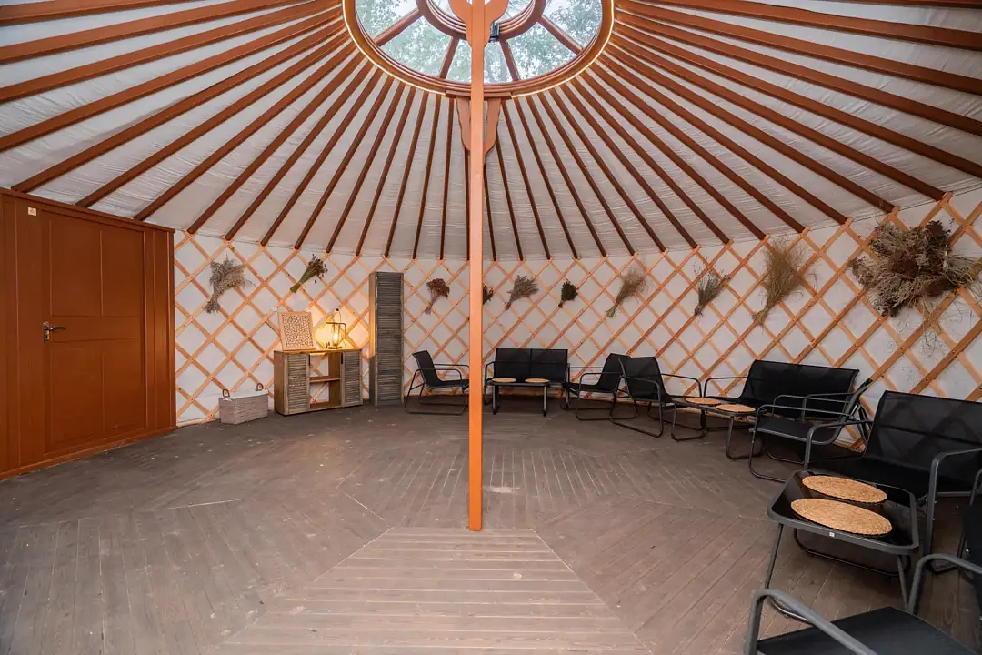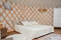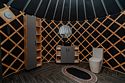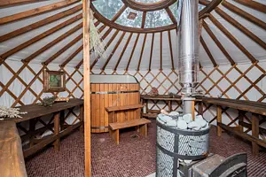 Просторное внутреннее пространство юрты наполнено уютом и комфортом: изысканная мебель, современная система отопления, уютная зона отдыха и изысканный интерьер создают атмосферу благородной простоты и изысканности.
