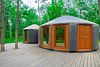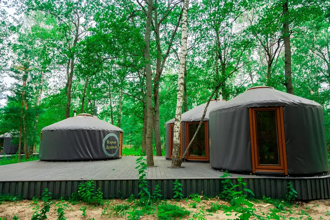 Уютная юрта «Лада» расположилась в живописном уголке леса на территории современной базы отдыха, где традиционная архитектура гармонично сочетается с комфортом.