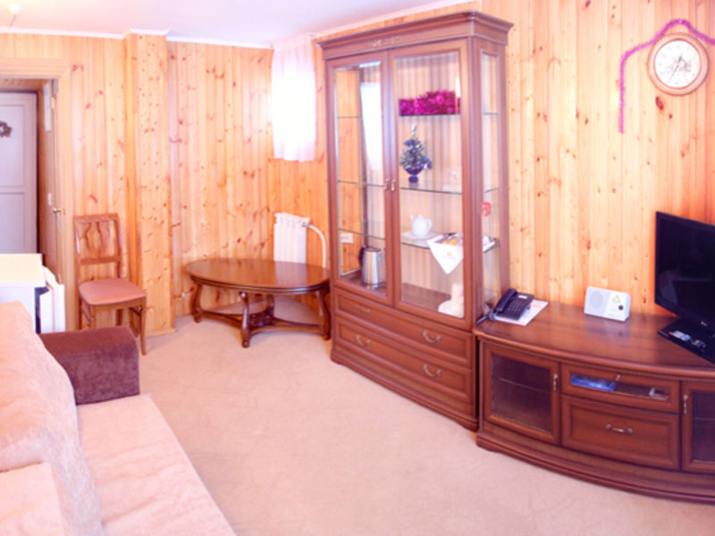 45м2, 2-спальная кровать, прикроватные тумбочки, диван, шкаф, стол, ТВ, минихолодильник, электрочайник, набор чайной посуды, сейф, с/у с душевой кабиной.