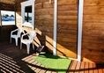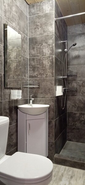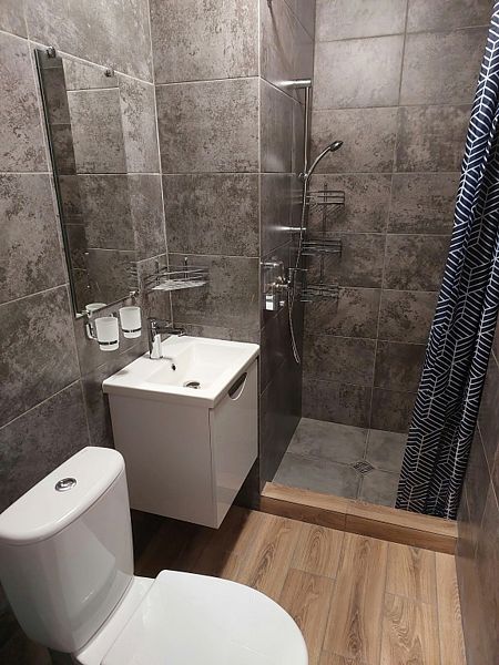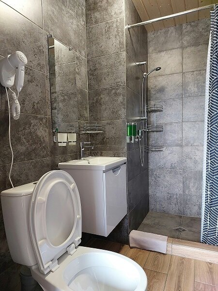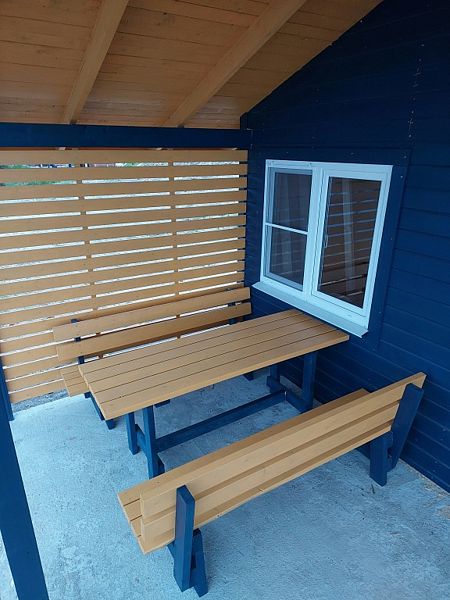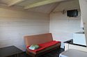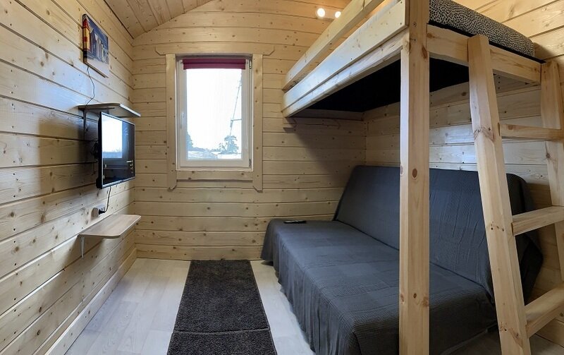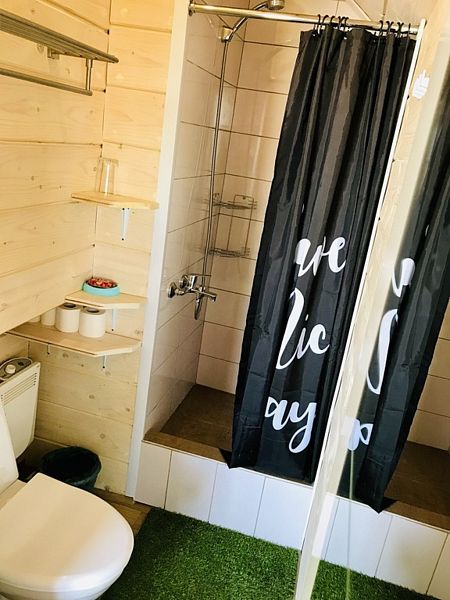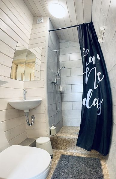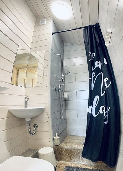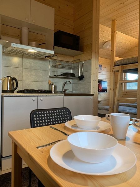 Душ туалет и кухня в домике. Просторный балкон. Двуспальное место под крышей. Идеальное место для размещения семьи.