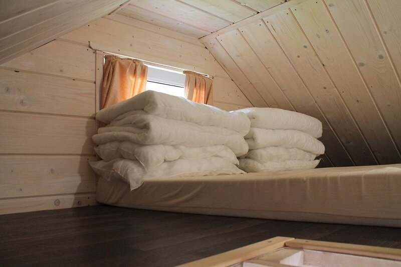 Душ туалет и кухня в домике. Просторный балкон. Двуспальное место под крышей.