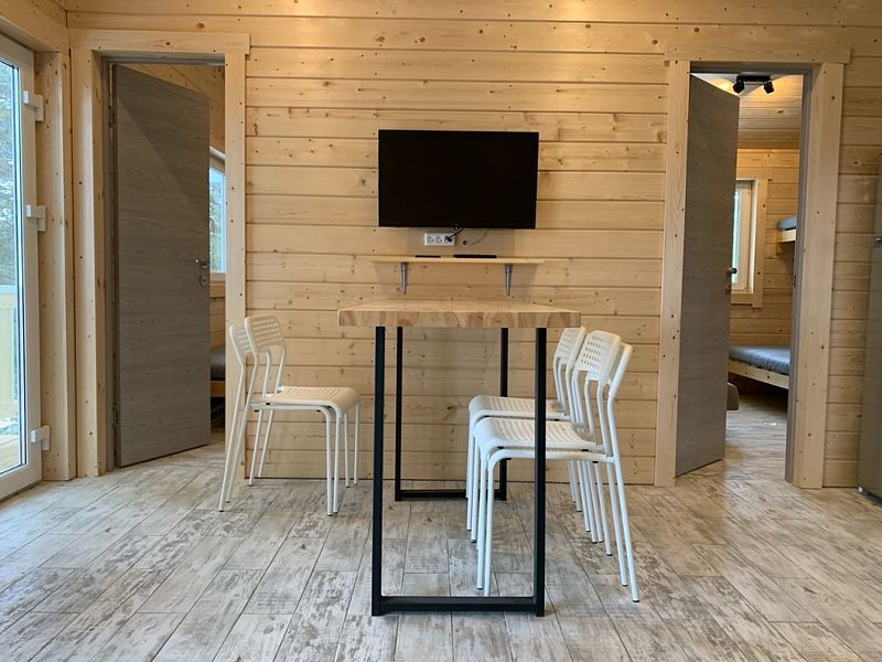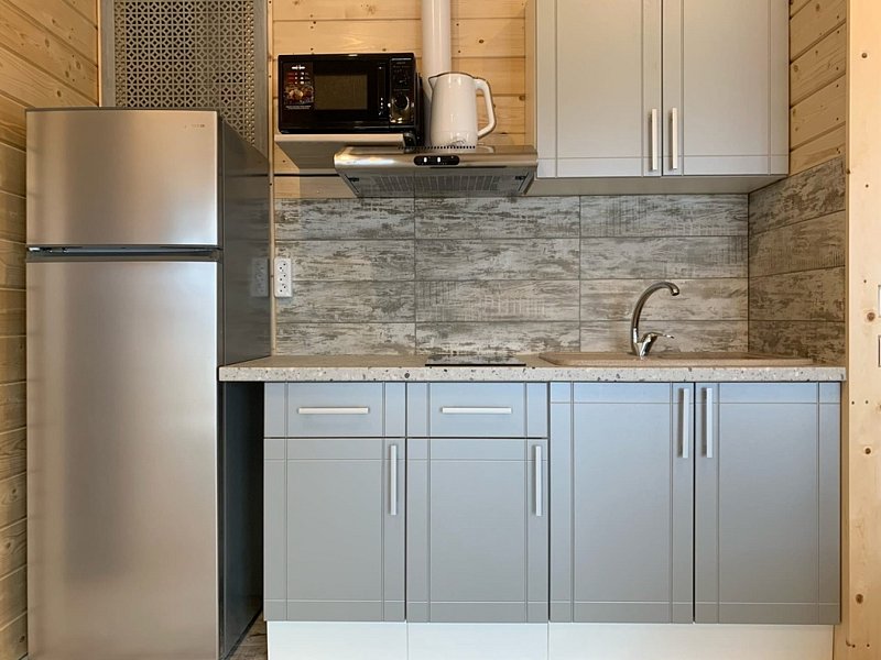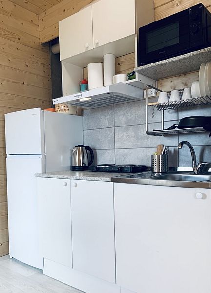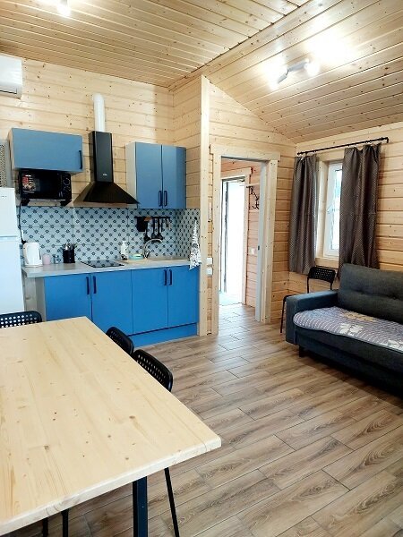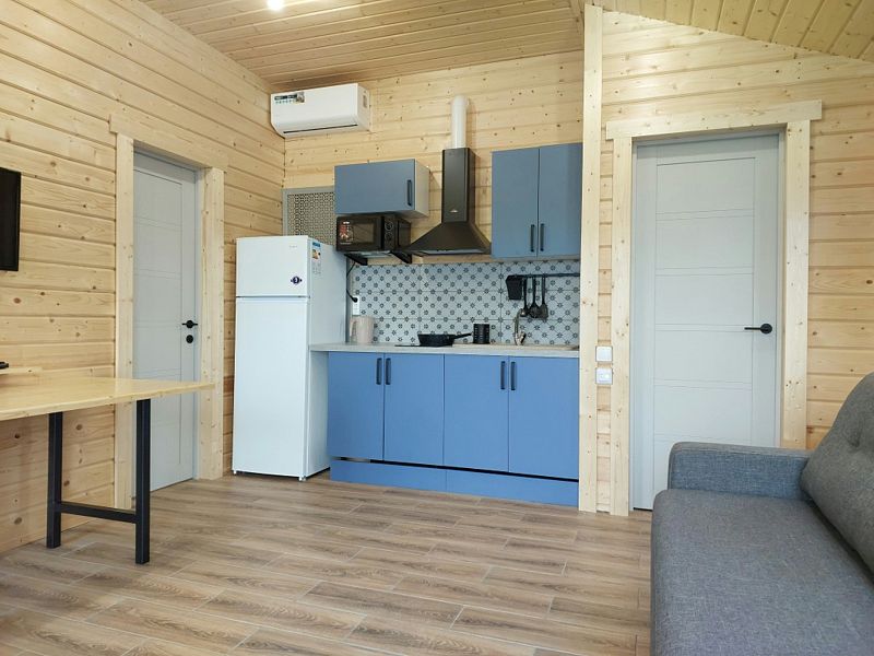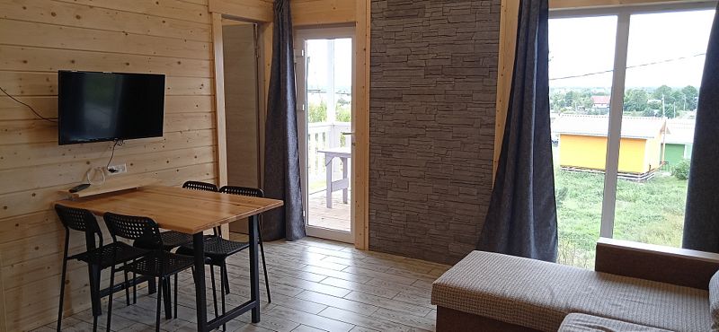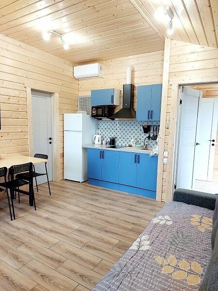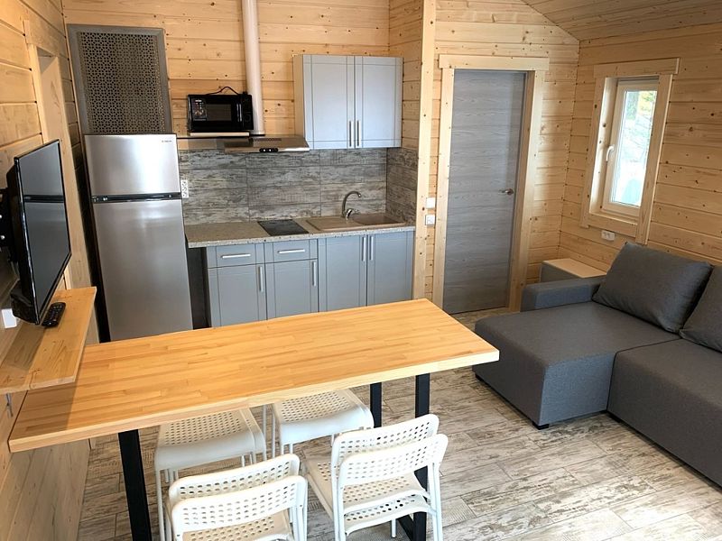 Гостям предлагаются домики, которые сдаются в аренду круглый год. В каждом домике есть санузел с душем и туалетом, горячая вода, оборудованная кухня с раковиной, холодильником, плитой, микроволновой печью, чайником и посудой, а также телевизор. Полотенца и постельное бельё включены в стоимость проживания.
