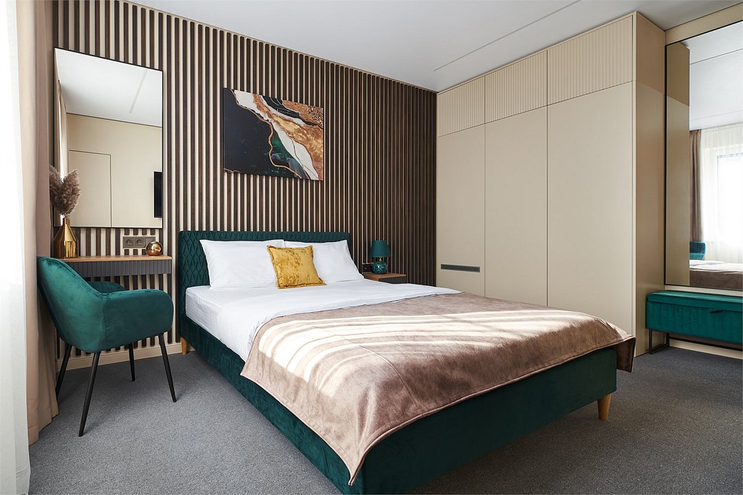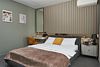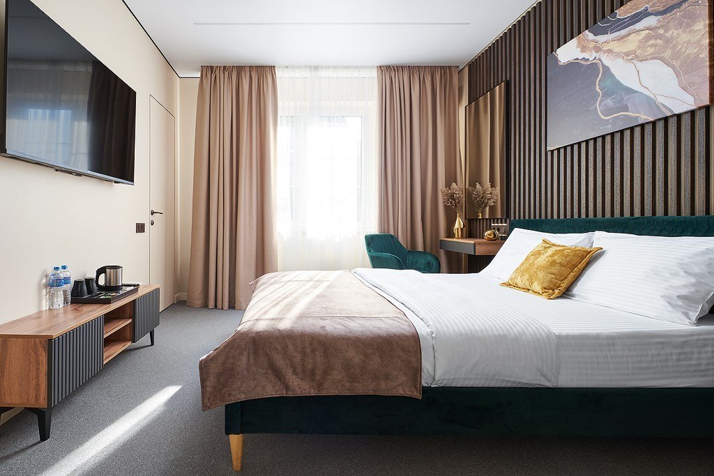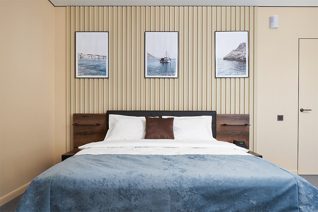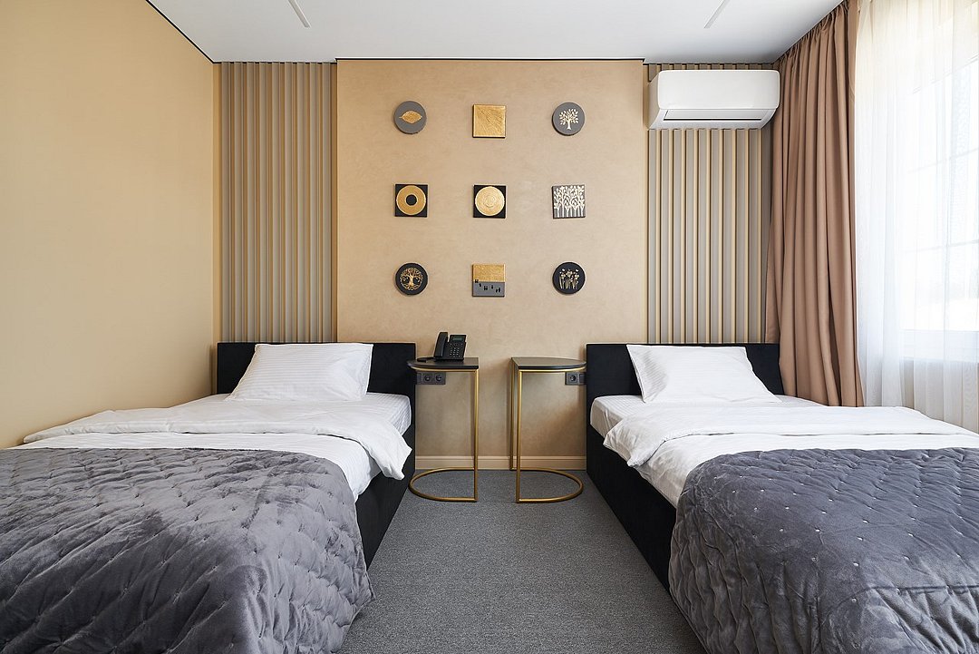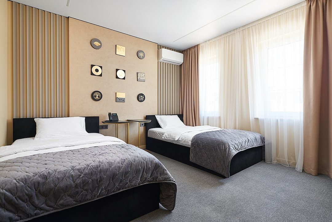 телевизор, Wi-Fi, холодильник, кондиционер, светильник, фен, душевая кабина, санузел, банные принадлежности, халаты, банные полотенца, тапочки, косметические средства, кровать «Queen size», две односпальные кровати, шкаф для одежды, зеркало, чайный набор, сейф, чайник, внутренний телефон, телевизор со Smart TV, бутилированная вода, мыло, бассейн, баняВ номере