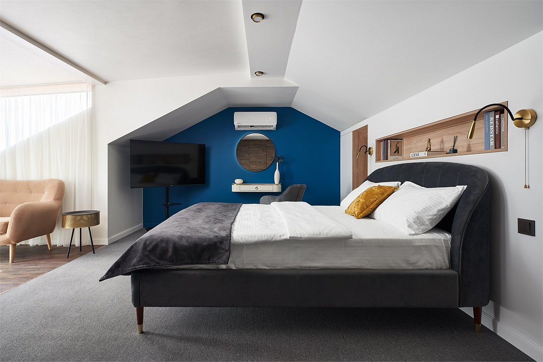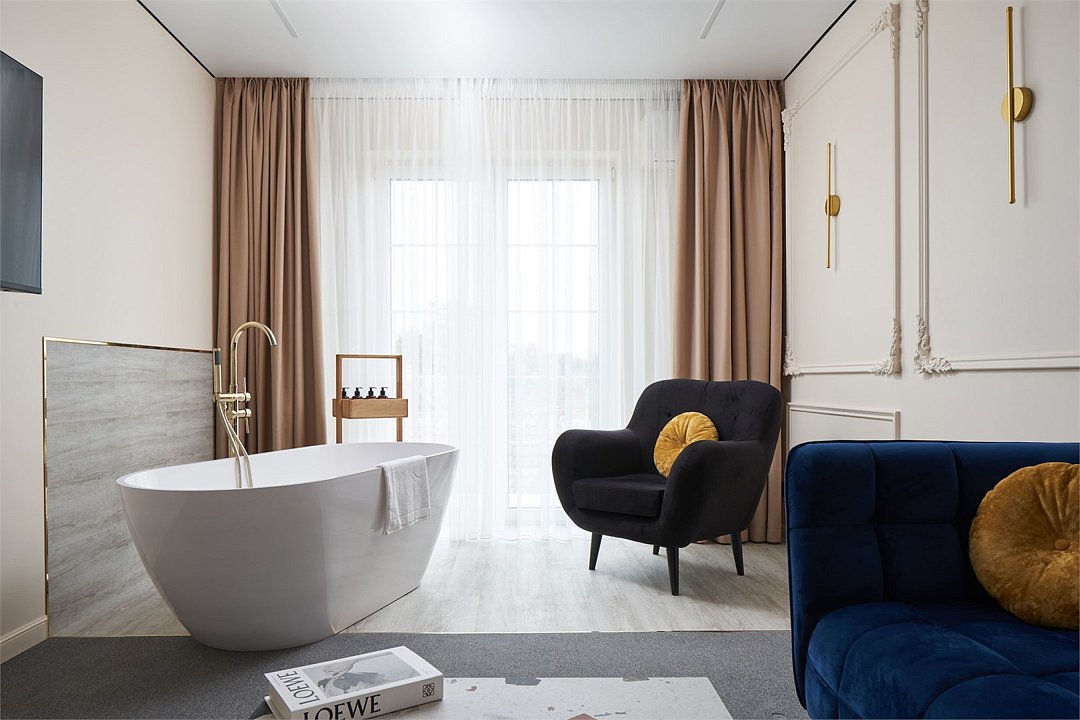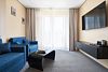 телевизор, Wi-Fi, кондиционер, фен, халаты, тапочки, гигиенические средства, кровать «Queen size», кресла, шкаф для одежды, зеркало, чайный набор, сейф, чайник, душ, вид на город, туалет, внутренний телефон, мини-холодильник, телевизор со Smart TV, два дивана-кровати, бутилированная вода, шапочка для душа, бассейн, баняВ номере