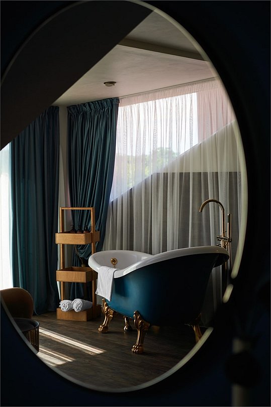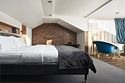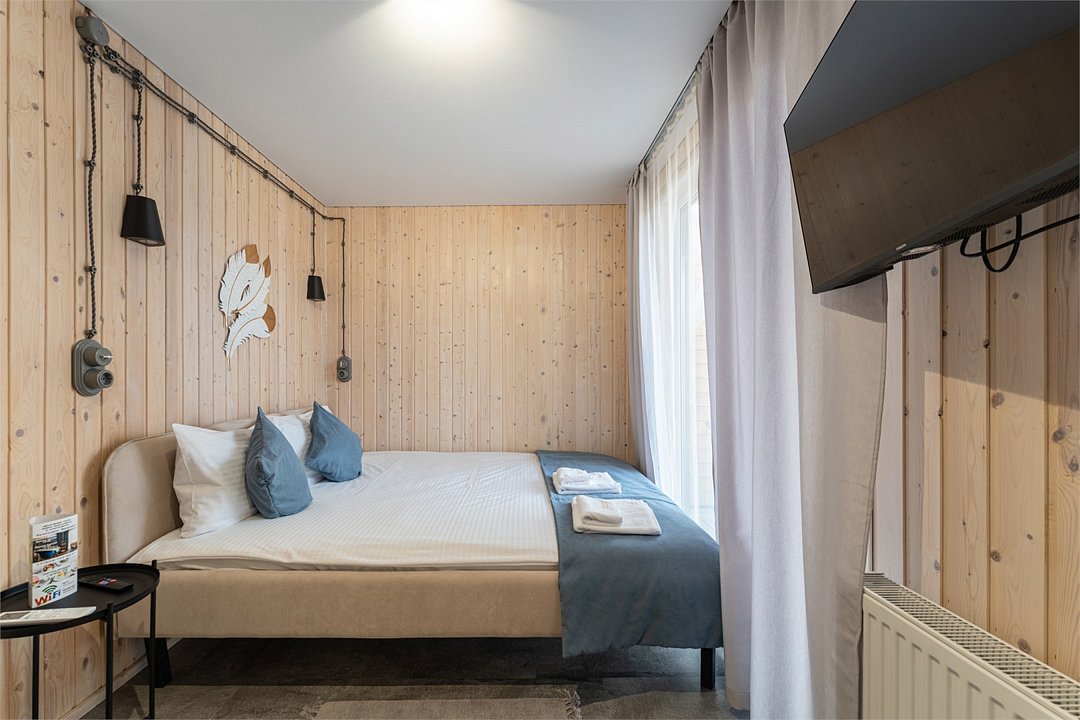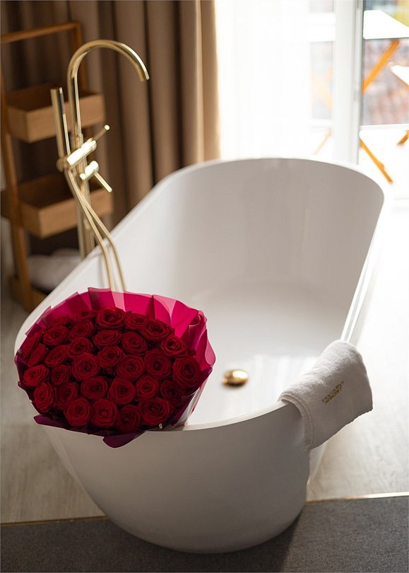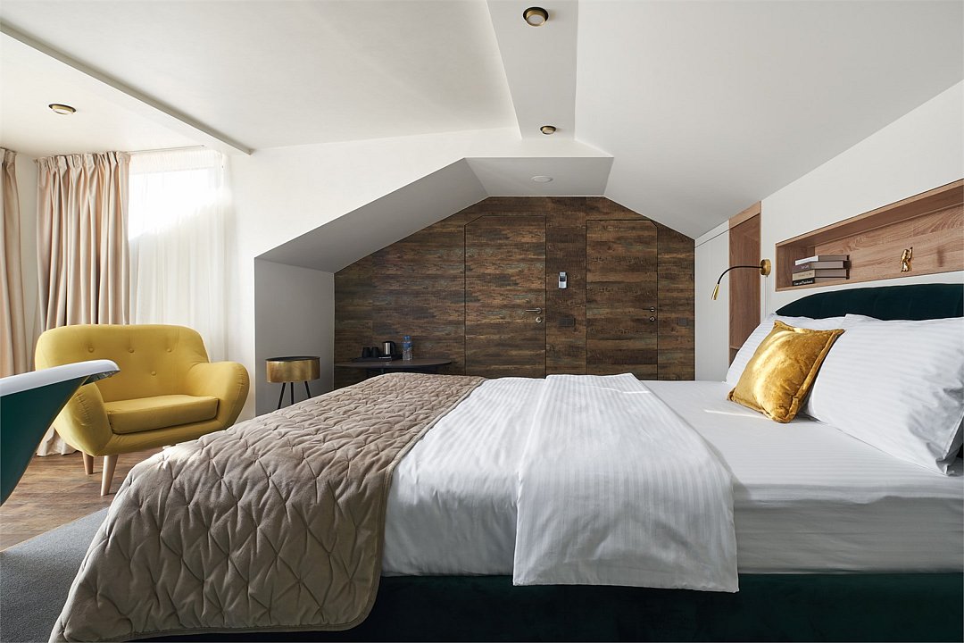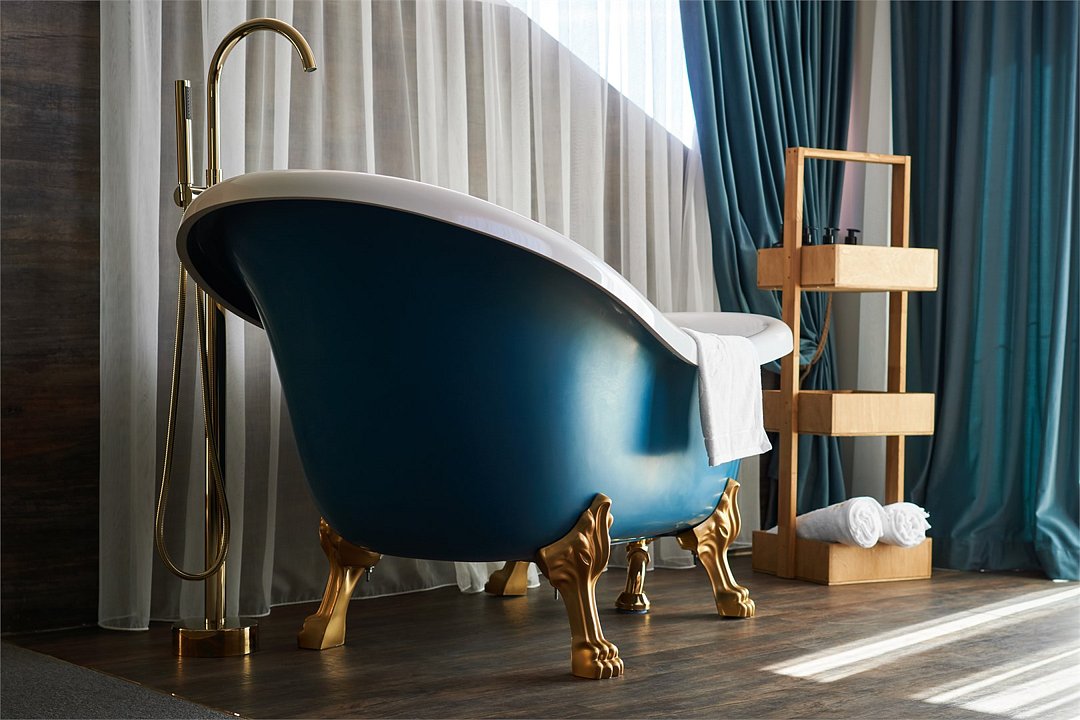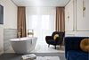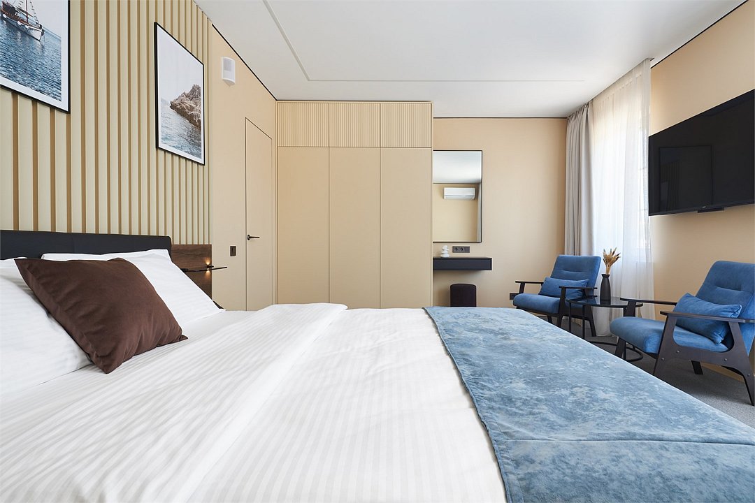 телевизор, Wi-Fi, кондиционер, фен, душевая кабина, ванна, банные принадлежности, халаты, банные полотенца, тапочки, кровать «Queen size», кресла, шкаф для одежды, чайный набор, сейф, чайник, унитаз, внутренний телефон, телевизор со Smart TV, уборка номера, бутилированная вода, мыло, бассейн, баняВ номере