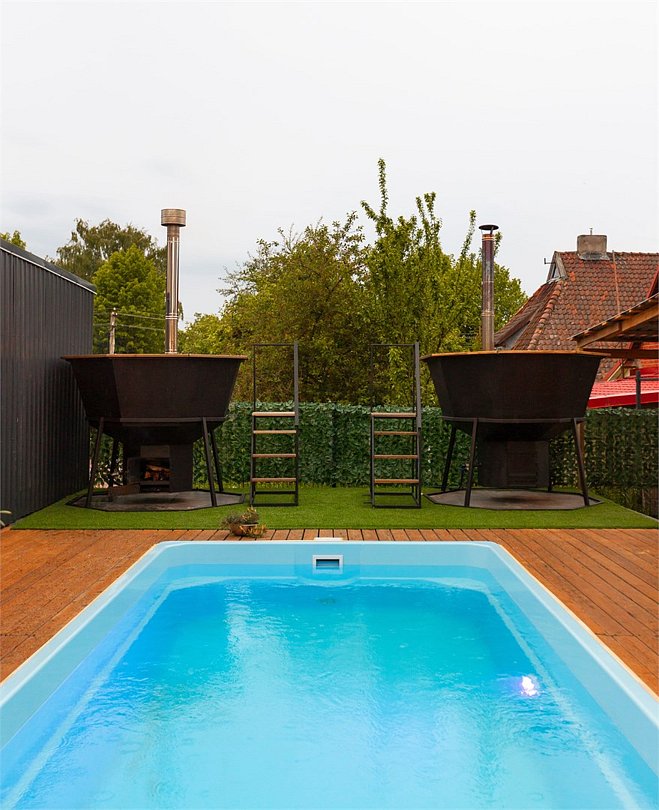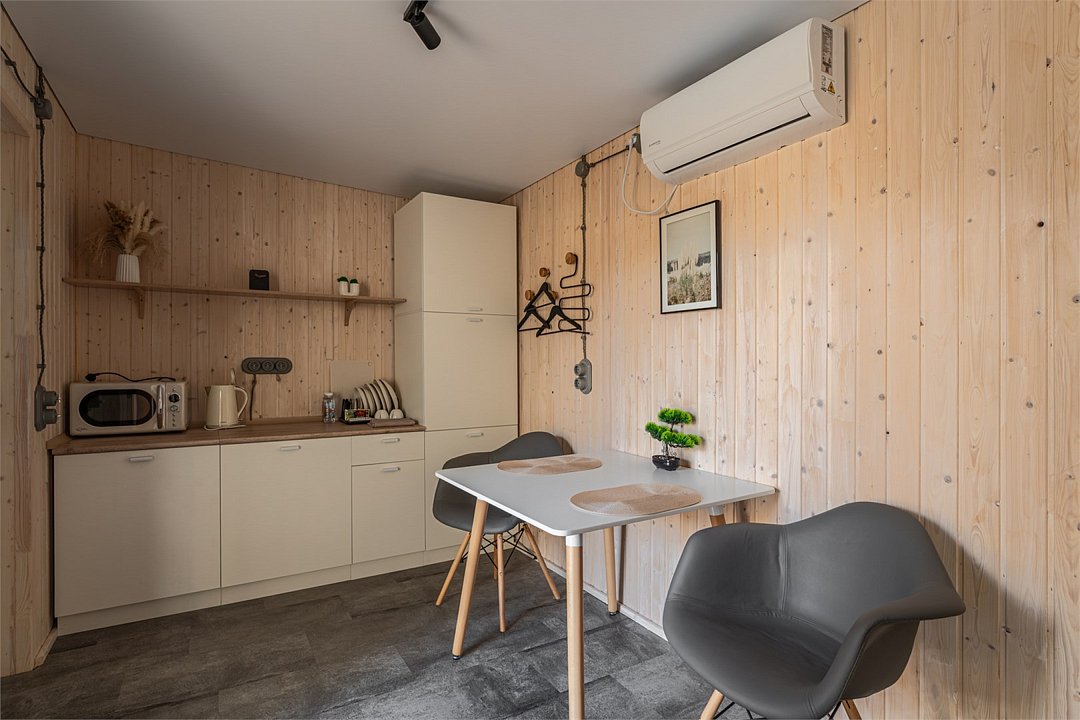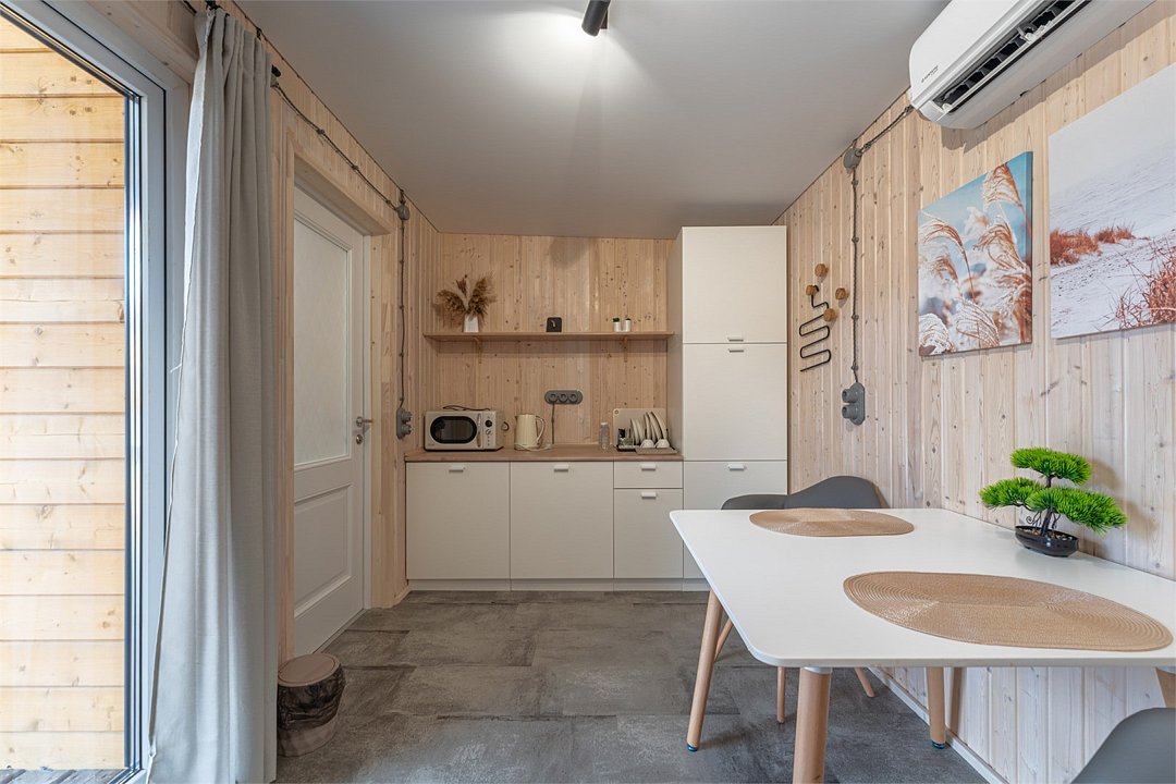 Wi-Fi, интернет, холодильник, кондиционер, светильник, фен, микроволновая печь, ванна или душевая кабина, санузел, халаты, банные полотенца, тапочки, косметические средства, терраса, кровать «Queen size», стулья, шкаф для одежды, вешалки, обеденный стол, зеркало, кухня, набор посуды, чайник, унитаз, раковина, вид во двор, кухонная посуда, кофейный столик, стул, сушилка для белья, мини-кухня, телевизор со Smart TV, вид на бассейн, общественный бассейн, межкомнатная дверь, уборка номера, набор для приготовления чая и кофе, бутилированная вода, мыло, окна от пола до потолка, бассейнВ домике