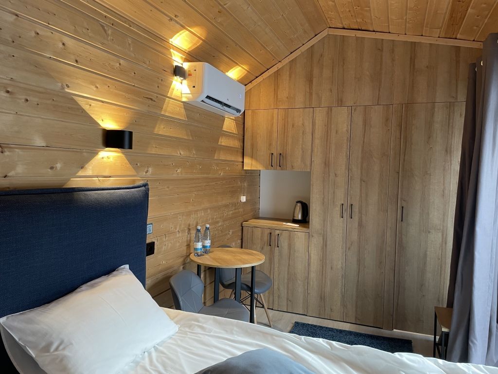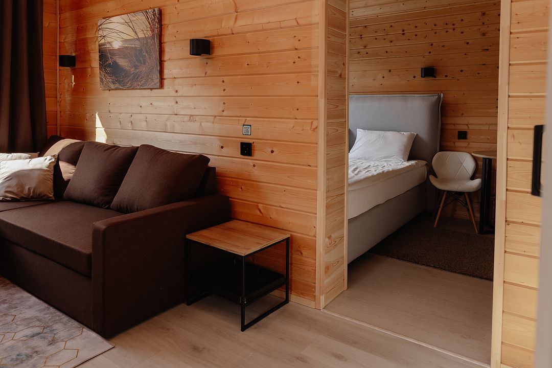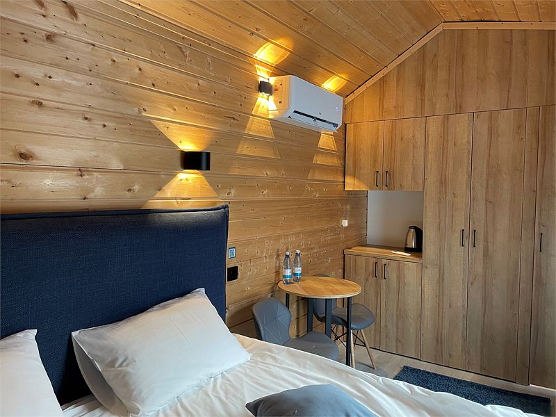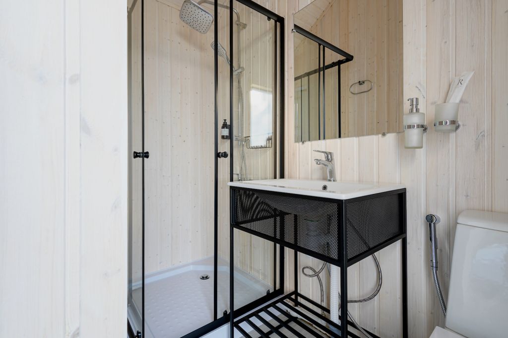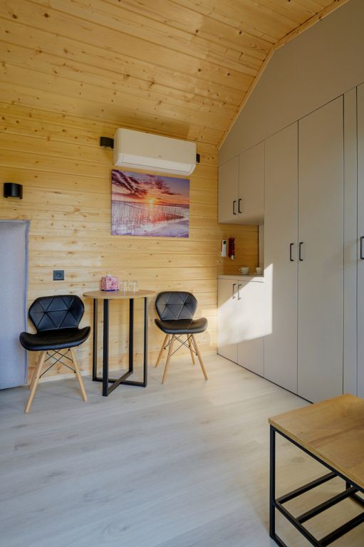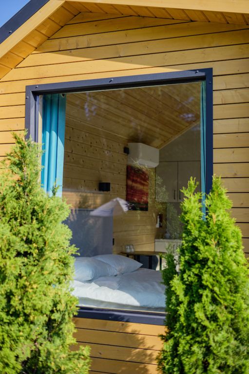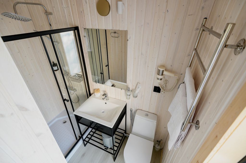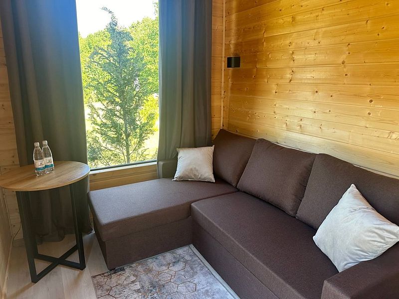 Уютный домик с собственной террасой и всеми удобствами внутри. Находясь рядом с морем, засыпая и просыпаясь под пение птиц, можно насладиться единением с природой и не отказывать себе в привычном комфорте. Жилой модуль оснащен: кроватями с белоснежным бельем, удобными ортопедическими матрасами, теплыми воздушными одеялами, собственным туалетом и душевой кабиной, вместительной гардеробной, ТВ, феном, чайной станцией и кондиционером. На всей территории эко-отеля доступен гостевой Wi-Fi.
