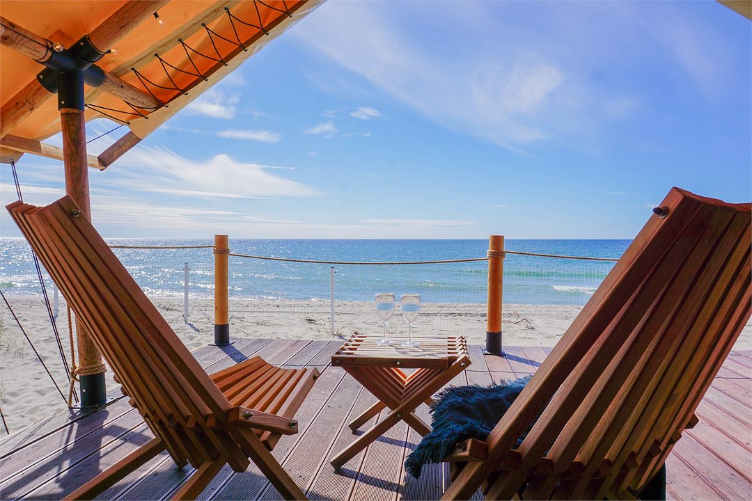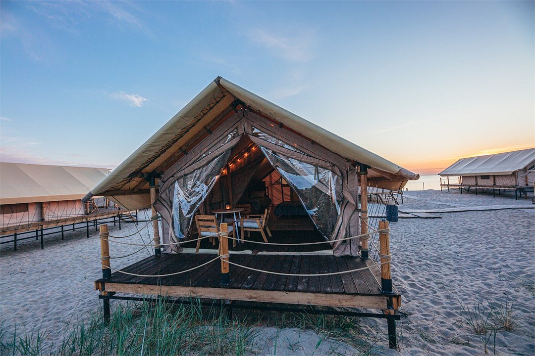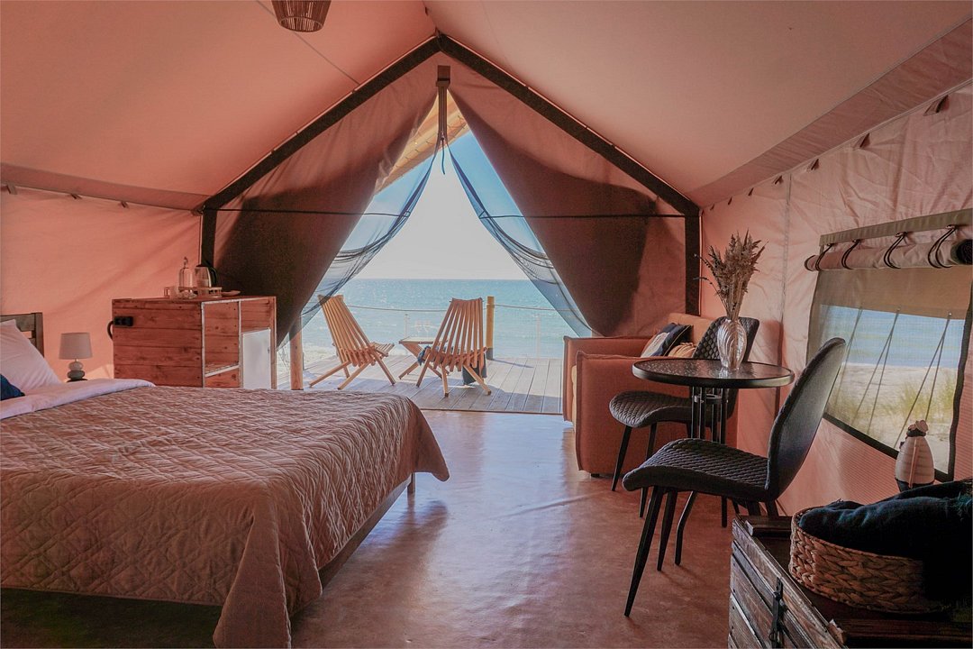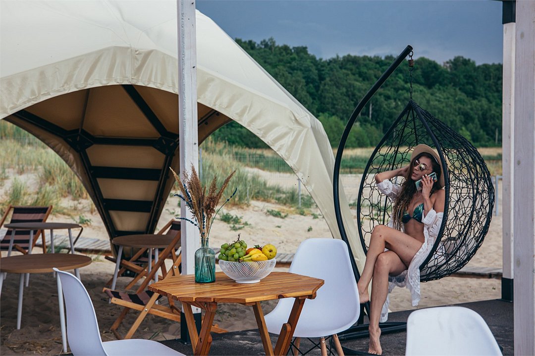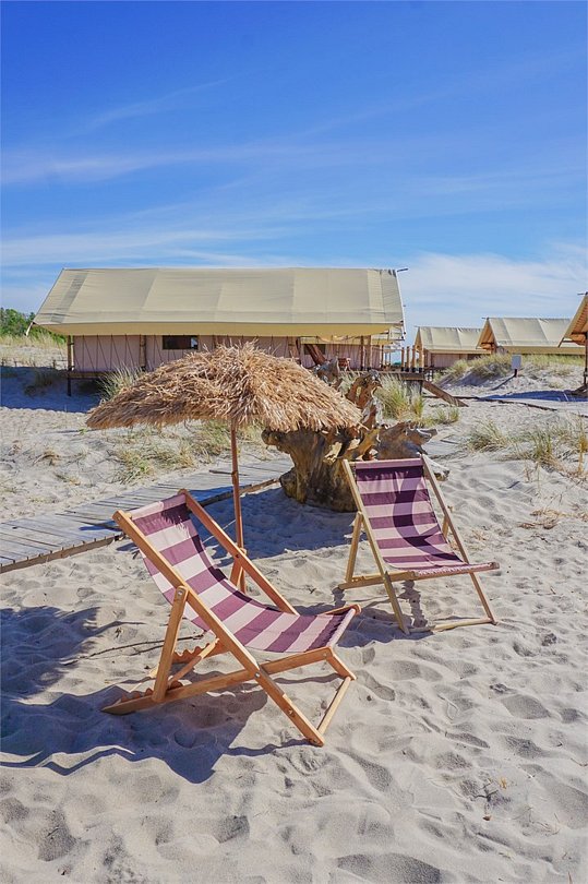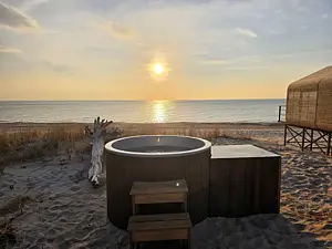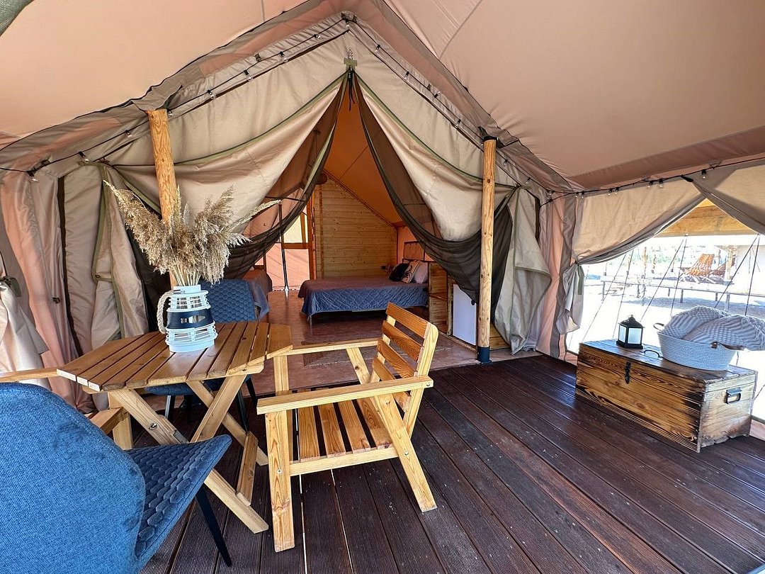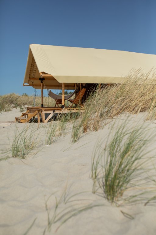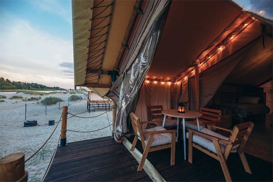 Уютный Тент-хаус на морском берегу с белоснежным песком и экологически чистой водой! Отлично подходит для романтического отдыха с любимым человеком или спокойного отдыха с семьей. Подходит для комфортного размещения до 3-х человек. Вас ждет безумно красивый вид на песчаные дюны и море с личной террасы, шум волн и незабываемые алые закаты балтийского побережья. Мы постарались сделать ваш отдых максимально комфортным, поэтому персональный душ и туалет со всем необходимым для личной гигиены находится в самом Тент-хаусе. Внутри Тент-хауса удобный продуманный интерьер, включающий в себя: • сундук с замком и вешалку для вещей; • большую двуспальную кровать; • диванчик с дополнительным спальным местом; • столик со стульями; • холодильник и чайник; • бутилированная питьевая вода, чай и кофе. Все это дополняется деревянной мебелью, размещенной на террасе и удобным гамаком, чтобы вы могли спокойно отдохнуть в любое время.Услуги и удобства