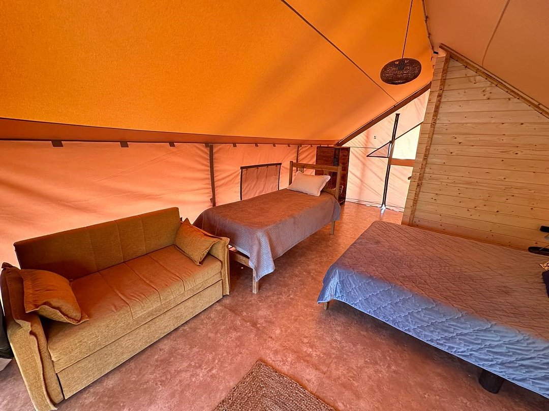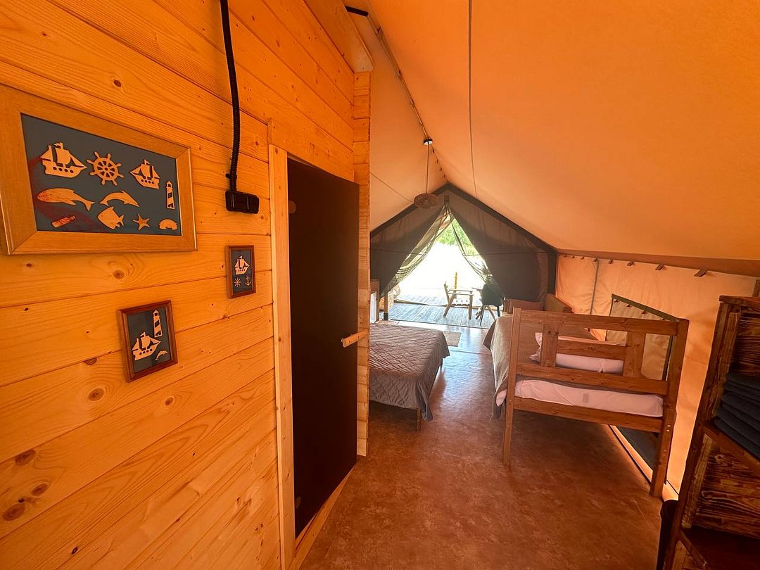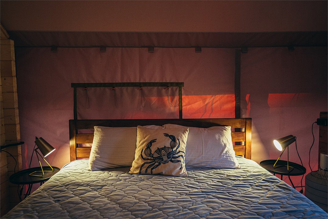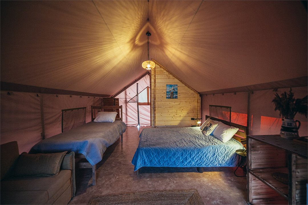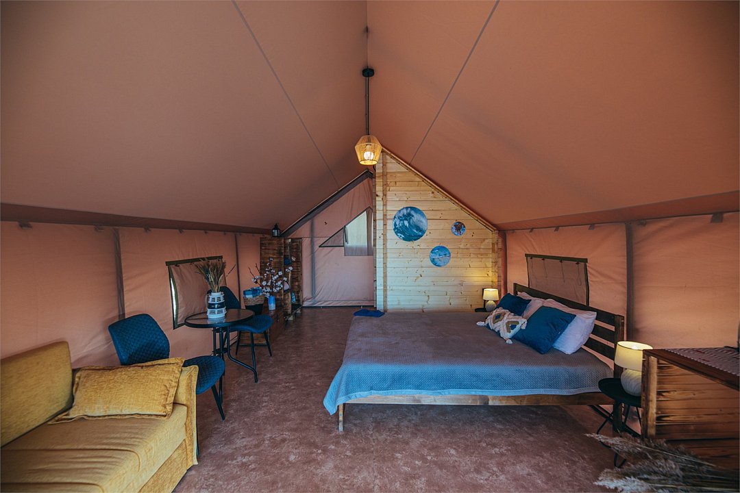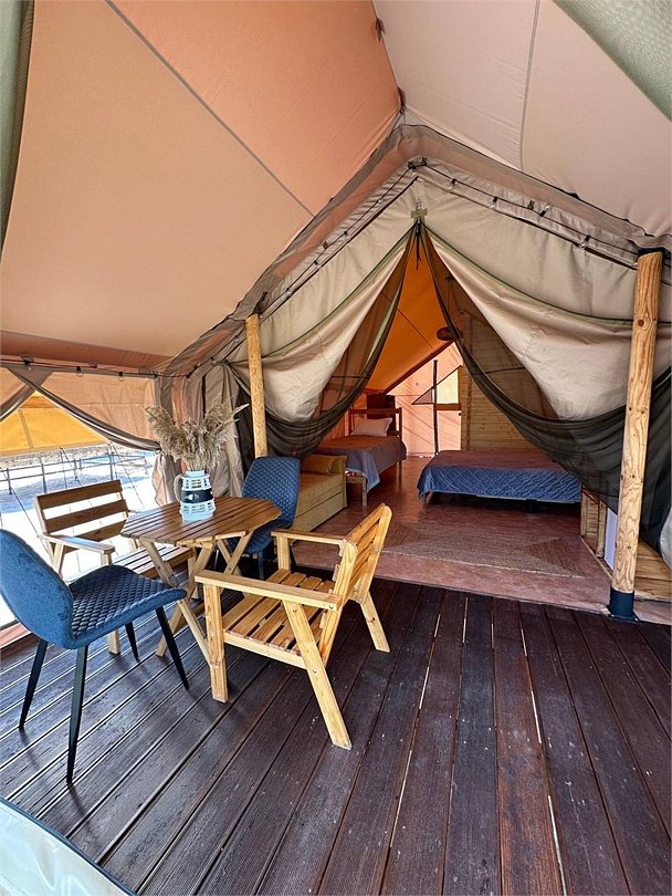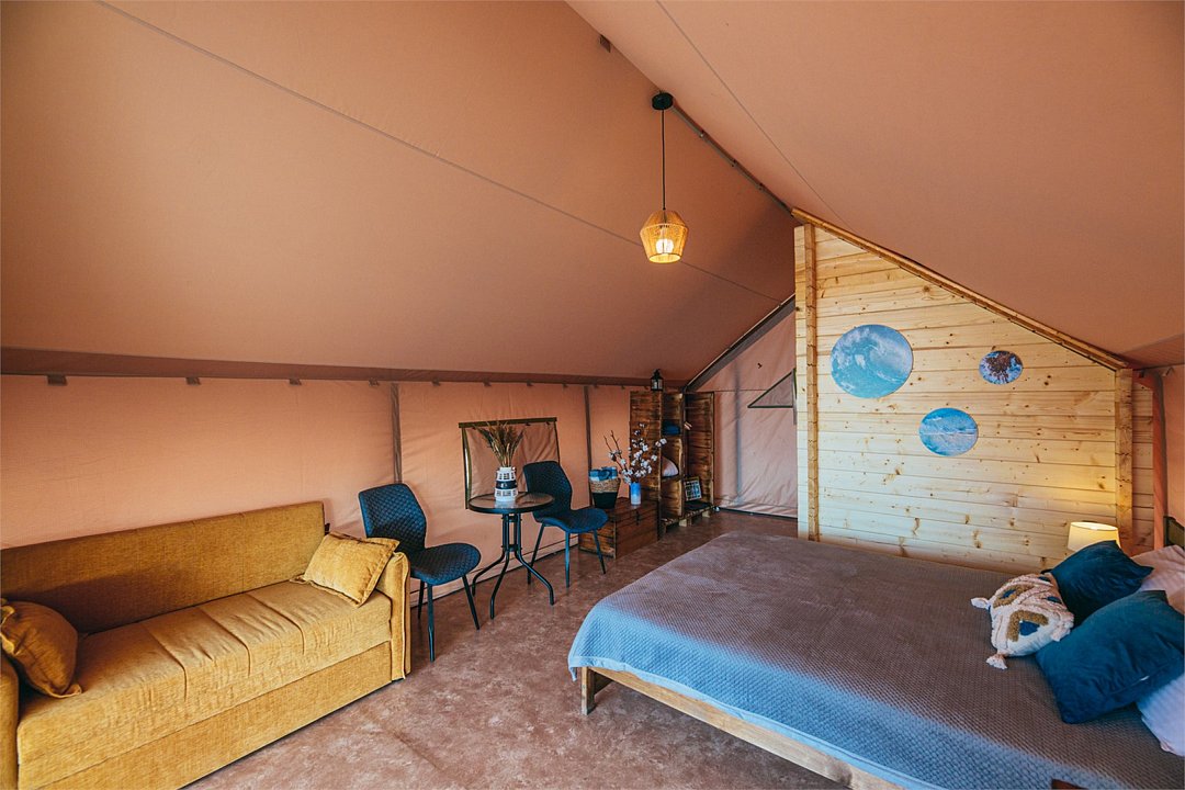 Уютный Семейный Тент-хаус на морском берегу с белоснежным песком и экологически чистой водой с видом на озеро или море. Отлично подходит для спокойного отдыха с семьей до 5 человек (2 взрослых и до 3 детей). Номер оборудован: 2-спальной кроватью, полуторной кроватью и раскладным диванчиком. По запросу предоставляется детская кроватка-манеж. Семейный Тент-хаус дополняет закрытая террасная зона с панорамными окнами, где располагается обеденный стол и зона отдыха. Вас ждет безумно красивый вид с личной террасы, песчаные дюны и незабываемые алые закаты балтийского побережья. Море находится в 70 метрах от Тент-хауса. Мы постарались сделать ваш отдых максимально комфортным, поэтому персональный душ и туалет со всем необходимым для личной гигиены находится в самом Тент-хаусе. Внутри Тент-хауса удобный продуманный интерьер, включающий в себя: • сундук с замком и вешалку для вещей; • большую двуспальную кровать; • диванчик с дополнительным спальным местом; • столик со стульями; • холодильник и чайник; • бутилированная питьевая вода, чай и кофе. Все это дополняется деревянной мебелью, размещенной на террасе и удобным гамаком, чтобы вы могли спокойно отдохнуть в любое время.Услуги и удобства