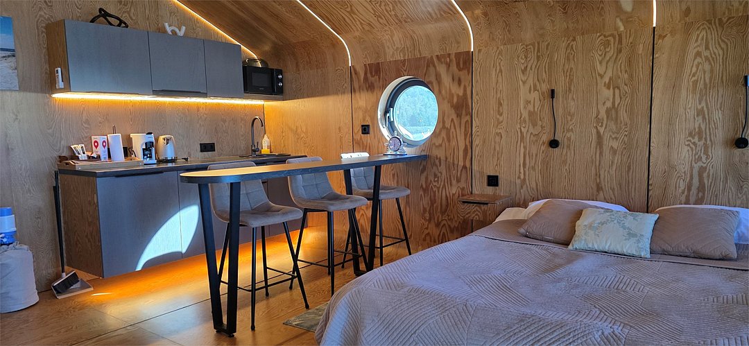 Наш современный и уютный домик, расположенный в 50 м от Балтиского моря с видом на волны и закаты. Здесь всё создано для вашего комфортного отдыха в любое время года. Домик рассчитан на 2–3 человека и оснащён всем необходимым: • Тёплый пол для уюта даже в прохладные дни, • Кондиционер для прохлады в жару, • Современная кухня, душ и туалет, • Панорамные окна с потрясающим видом на море. Особая гордость – просторная терраса. Выпейте утренний кофе под шум волн, насладитесь закатом или устройте романтический вечер под звёздами.Услуги и удобства