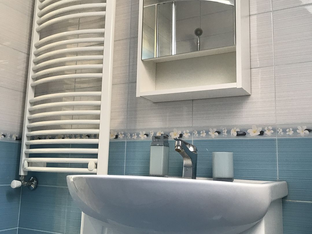Санузел в светлых тонах с окном вмещает душевую кабину с тропическим душем, стиральную машину, полотенцесушитель, зеркальный шкаф с феном, теплый пол. Шампунь, кондиционер для волос, гель для душа — входят в стоимость проживания, как и набор полотенец, вафельный халат и тапочки.