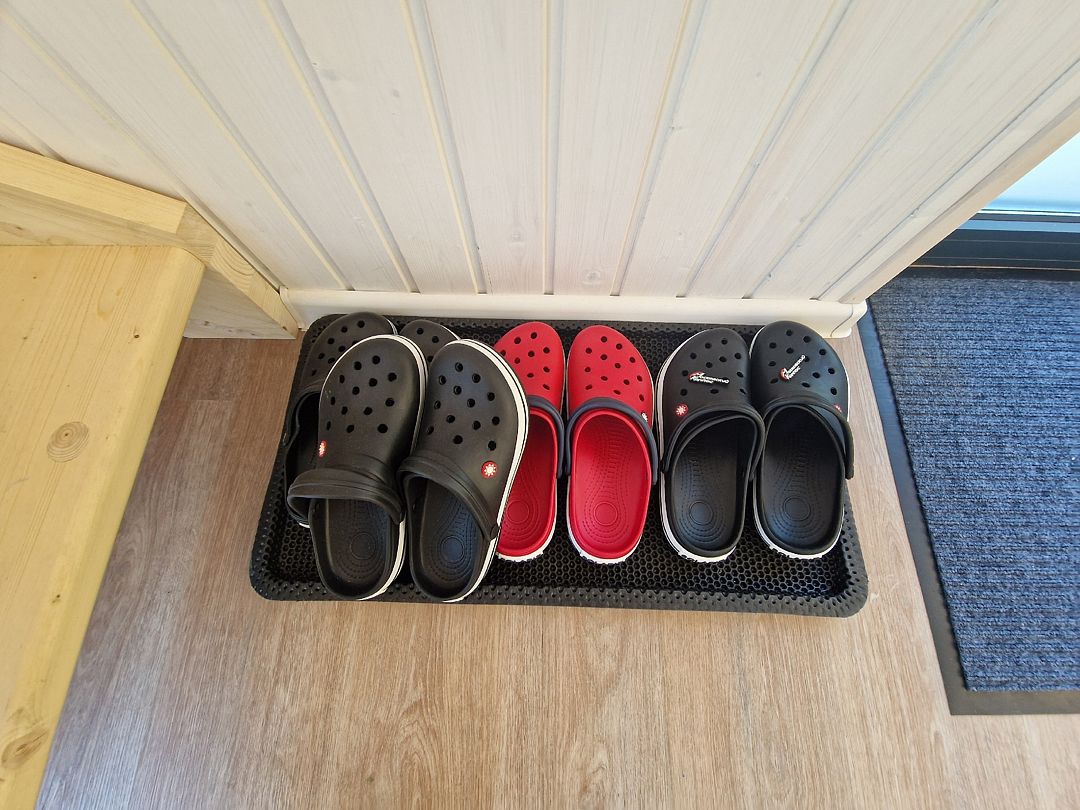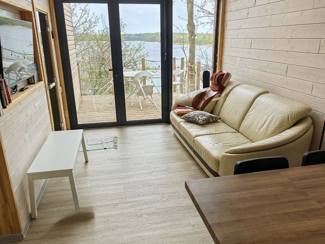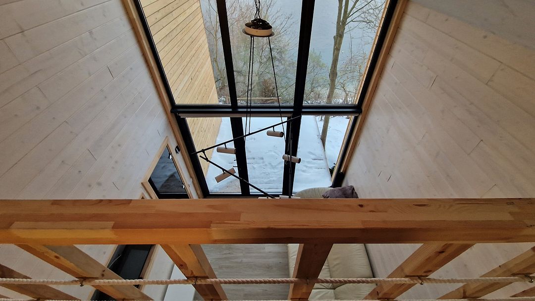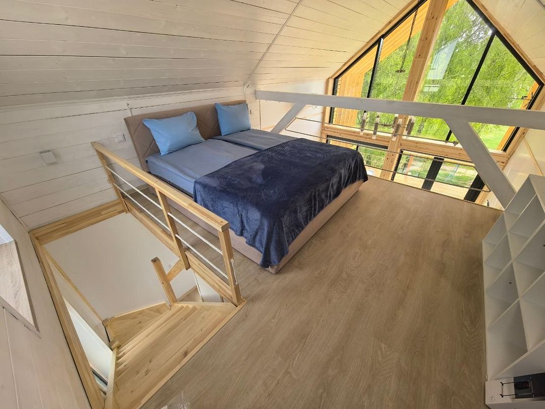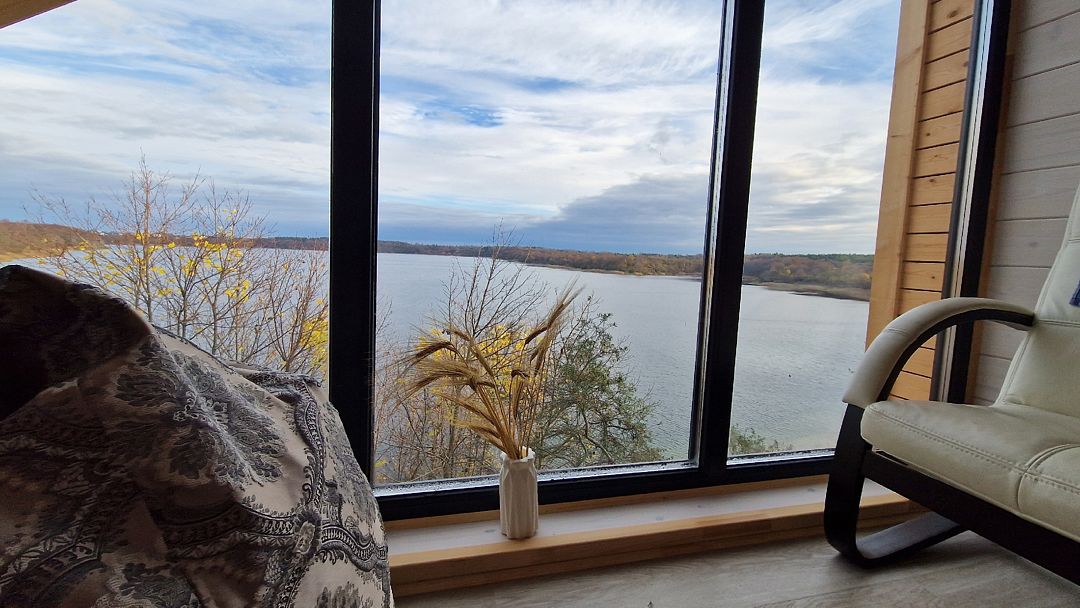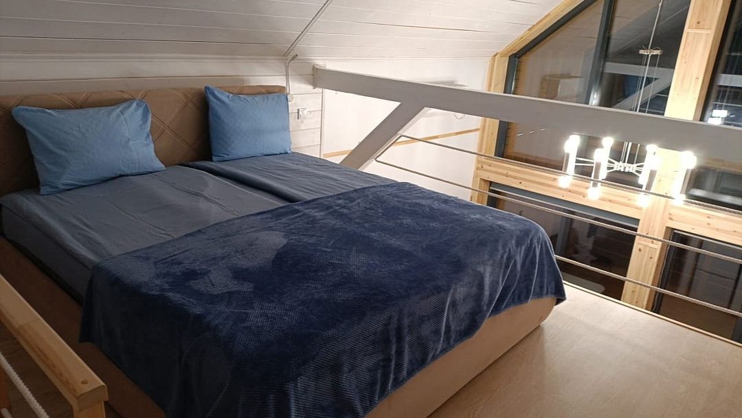 Площадь 50 кв.метров. Внизу два гостевых раскладных дивана, с которых открывается потрясающий вид на все Янтарное озеро. Наверху двуспальный ортопедический матрас, свет для чтения, розетки, стеллаж для вещей.