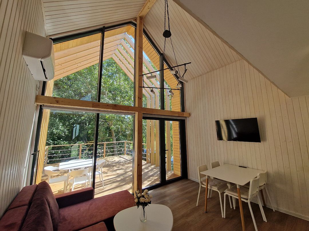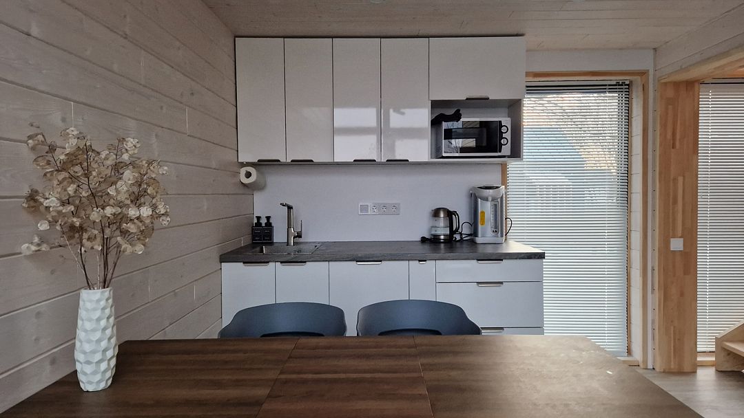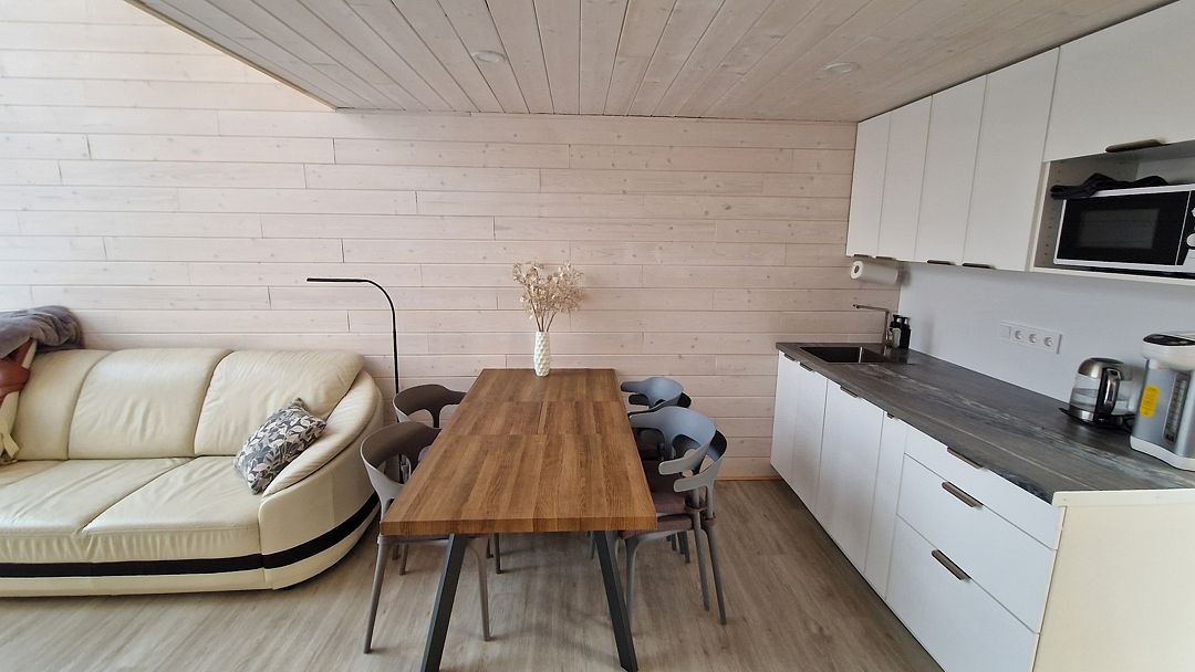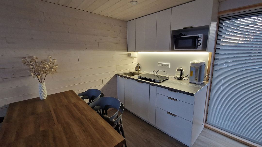 В коттедже полностью укомплектованная кухня с бытовой техникой (микроволновая печь, чайник, тостер, индукционная двухкомфорочная плитка, полноценный холодильник с морозильной камерой), обеденная зона для четырех гостей и телевизор с Smart TV.