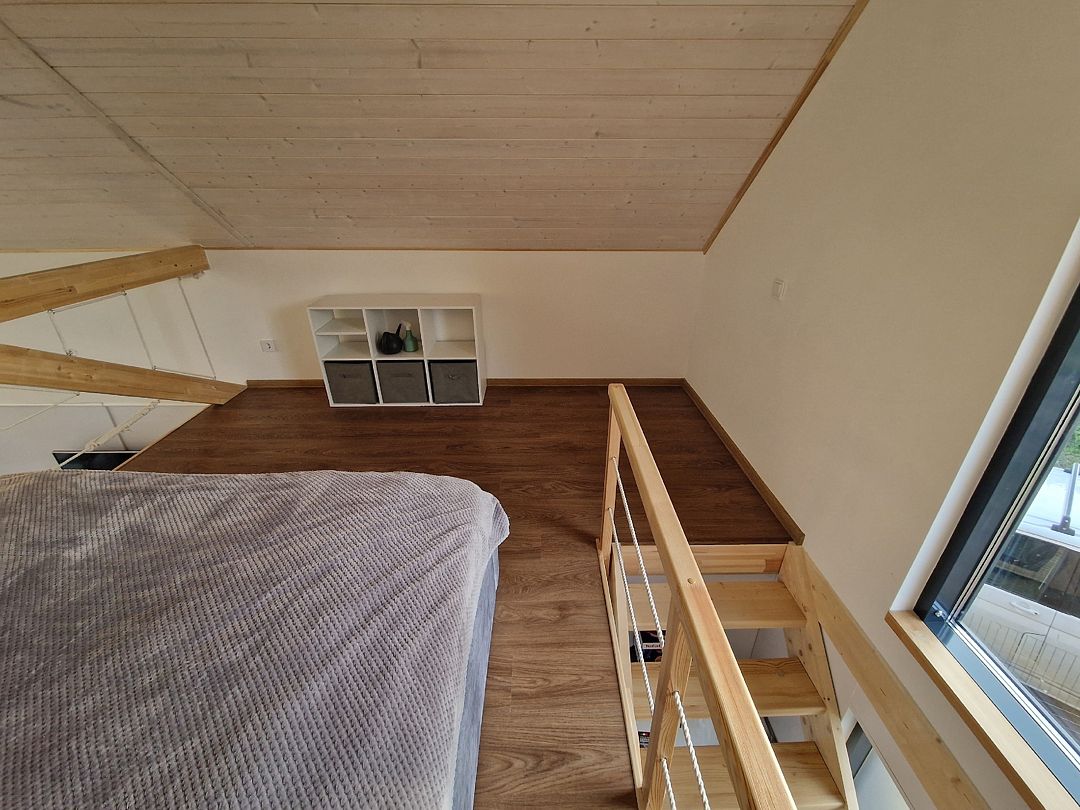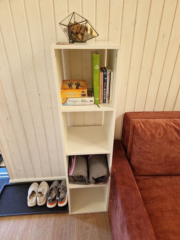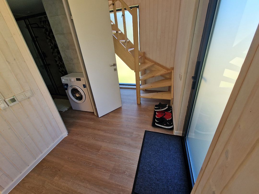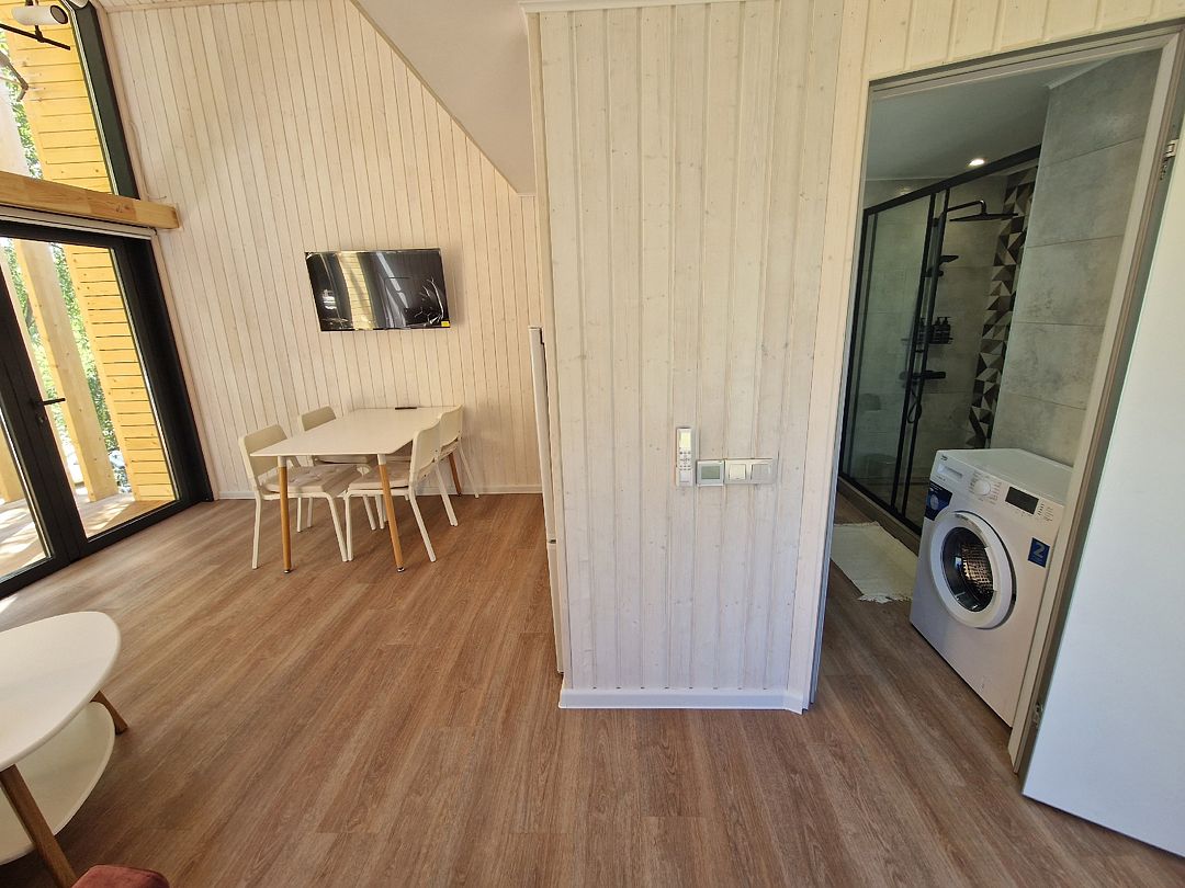 На первом этаже находится укомплектованная кухня (микроволновая печь, чайник, тостер, индукционная двухкомфорочная плитка, полноценный холодильник с морозильной камерой), обеденная зона для четырех гостей и телевизор с SmartTV. В гостевой зоне раскладывающийся диван (190х140 см), журнальный столик. Также есть кондиционер инверторного типа, подогрев полов и рулонные шторы блэкаут. Пользование Wi-Fi входит в стоимость проживания.